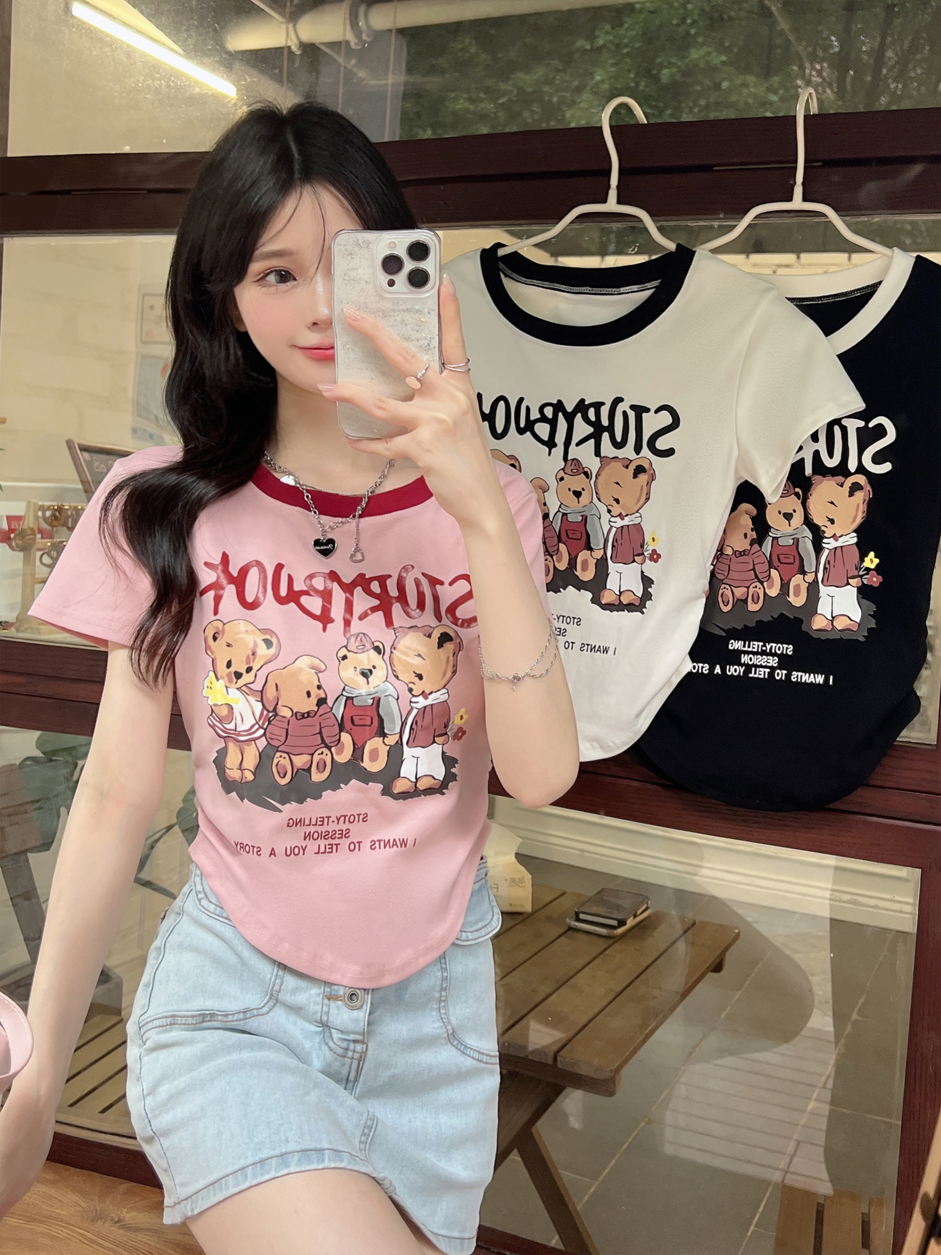 RM21899#大码四只熊印花圆领T恤胖mm短袖宽松打底衫上衣女S~4XL