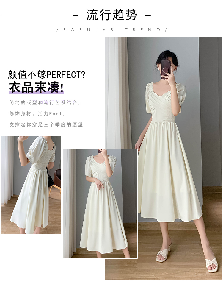 PF22287#新款名媛气质圆领泡泡袖钉珠收腰显瘦修身连衣裙女裝貨源服裝批...