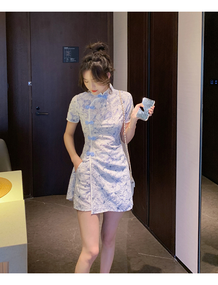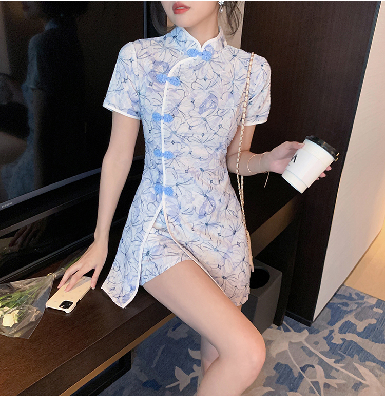 RM21988#夏新款刺绣雪纺改良新中式旗袍连衣裙短裤两件套
