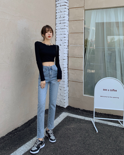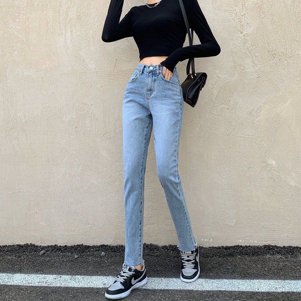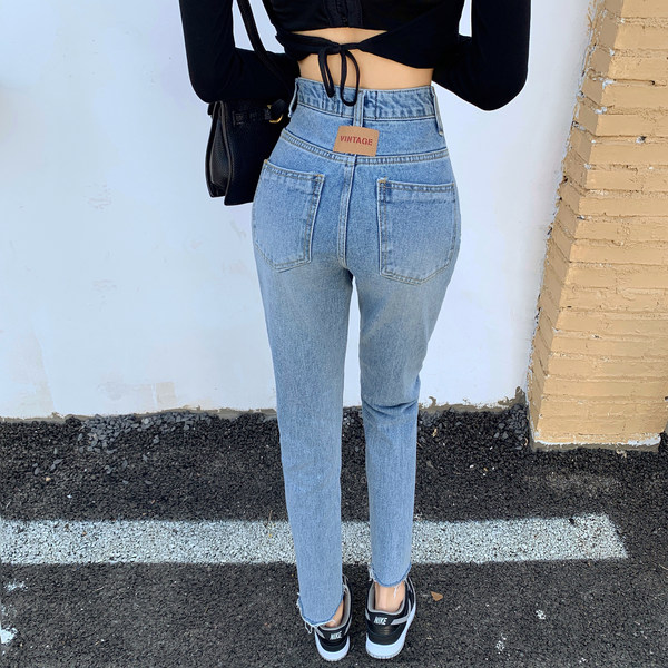 RM22016#韩版高腰水洗贴标基础百搭毛边牛仔裤九分裤女潮