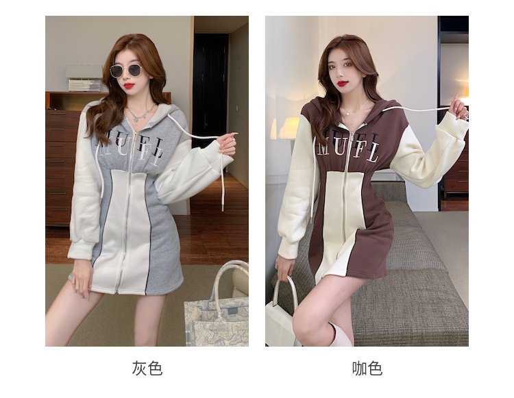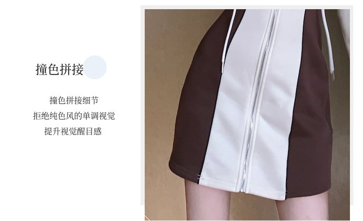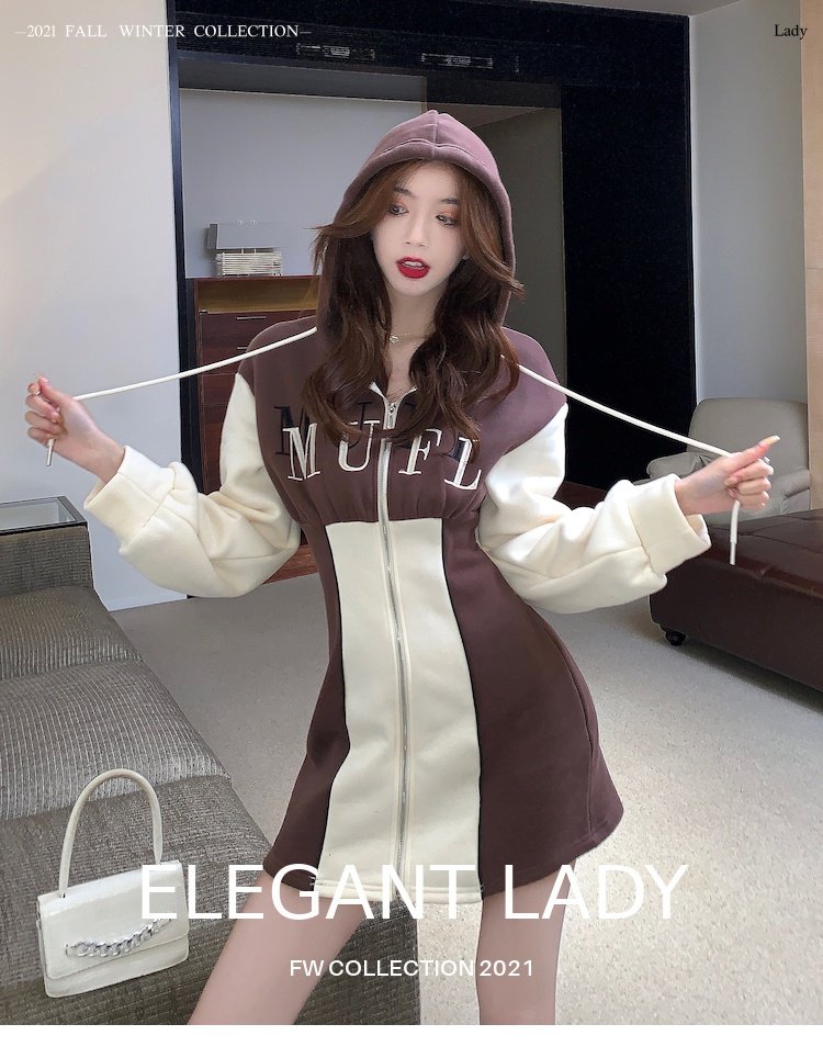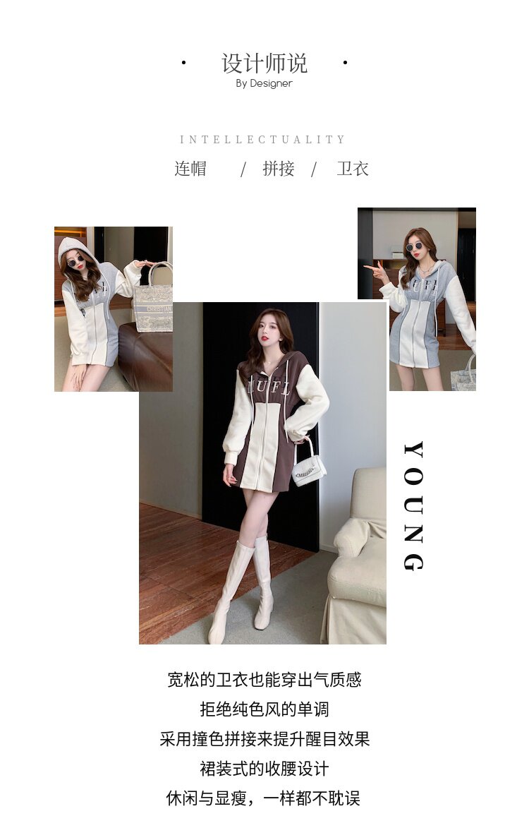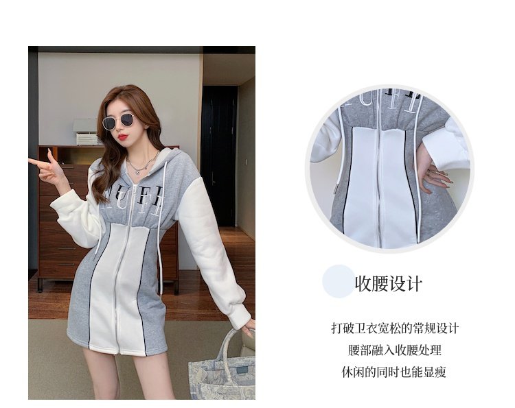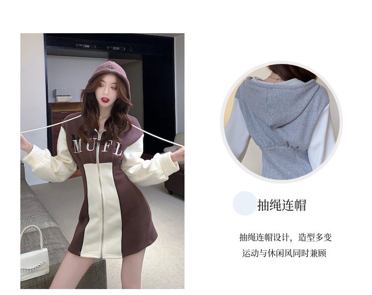 RM22274#港味甜酷秋冬加绒加厚修身显瘦高腰撞色连帽卫衣连衣裙