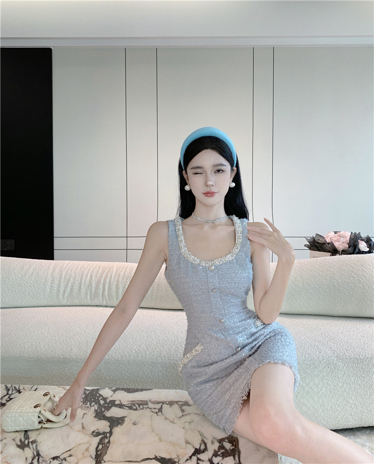 RM22312#小香风手工钉珠 收腰包臀背心连衣裙粗花呢
