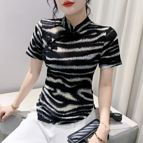 RM22387#复古盘扣豹纹T恤女2023年夏时尚立领修身减龄短袖印花款上衣