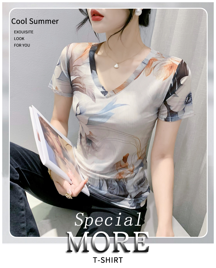 RM22389#夏季时尚纱网印花定位花短袖V领修身显瘦洋气上衣潮