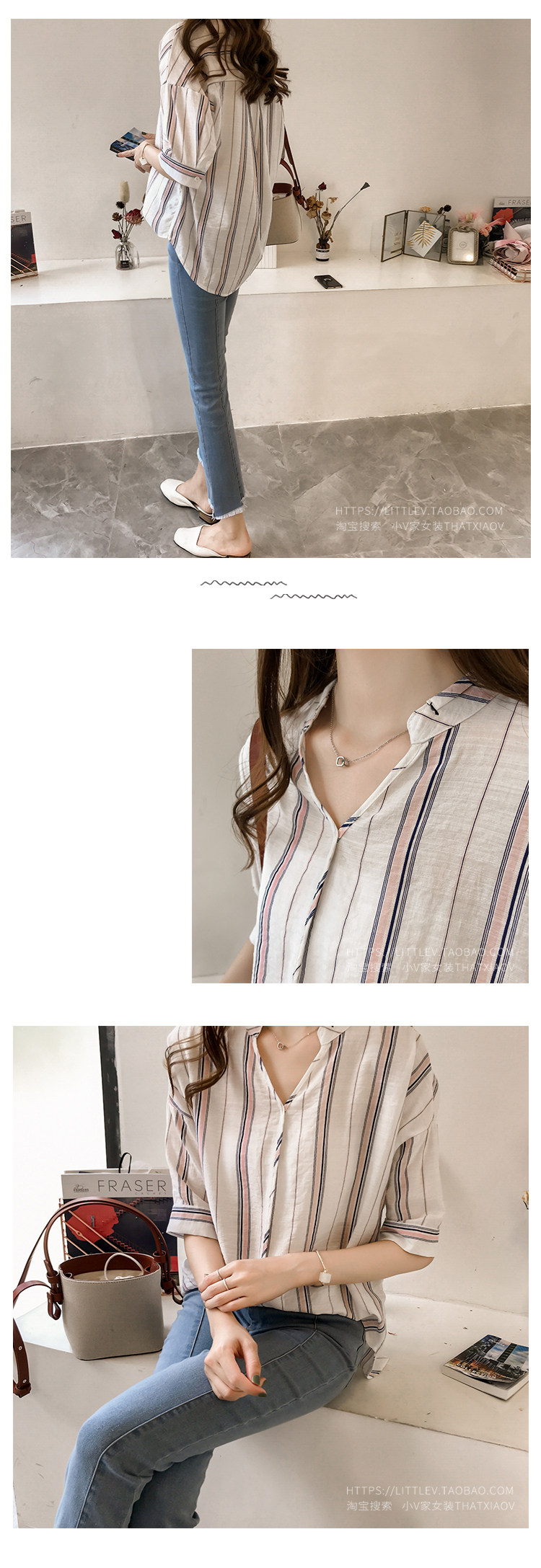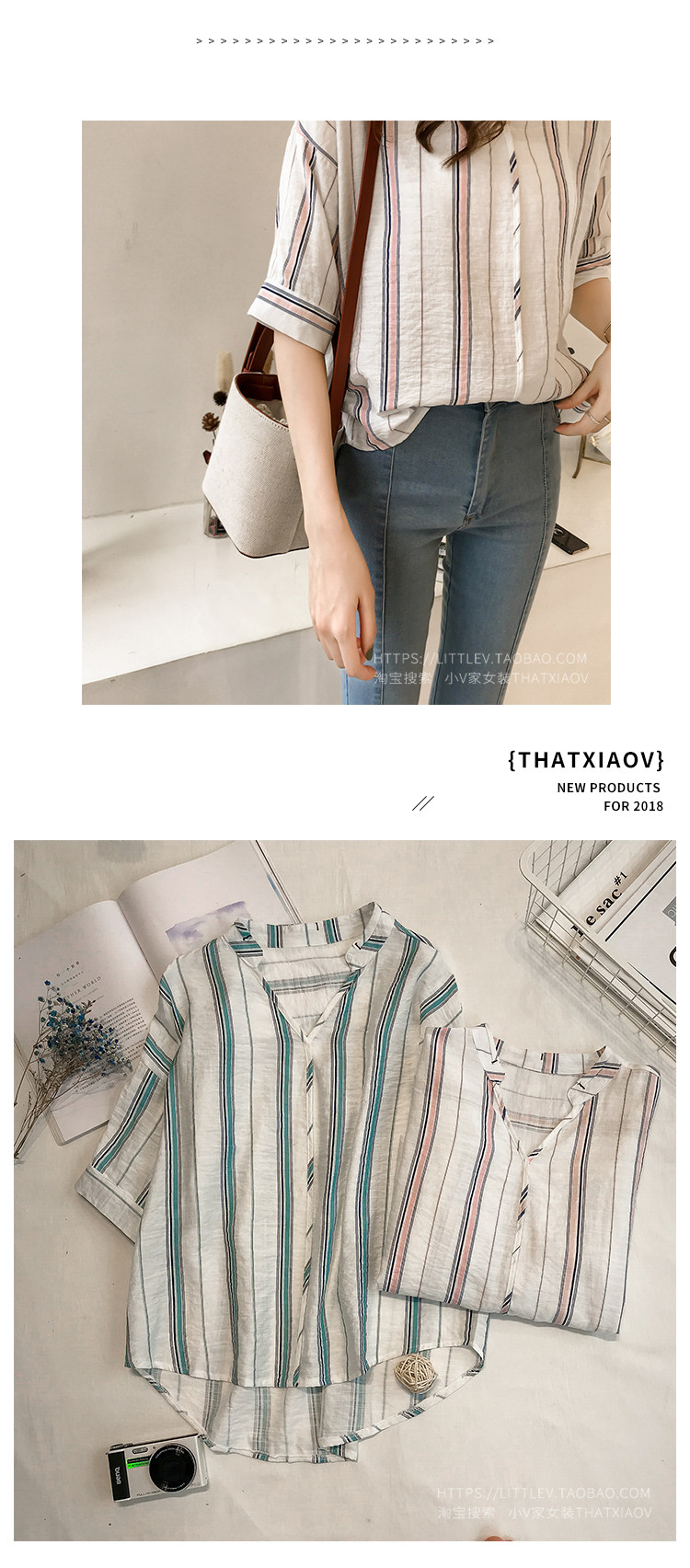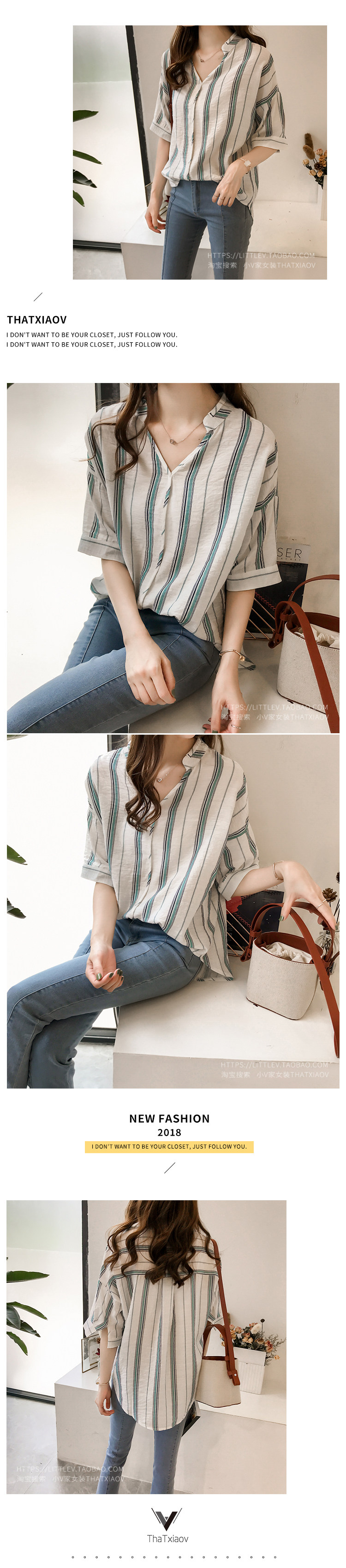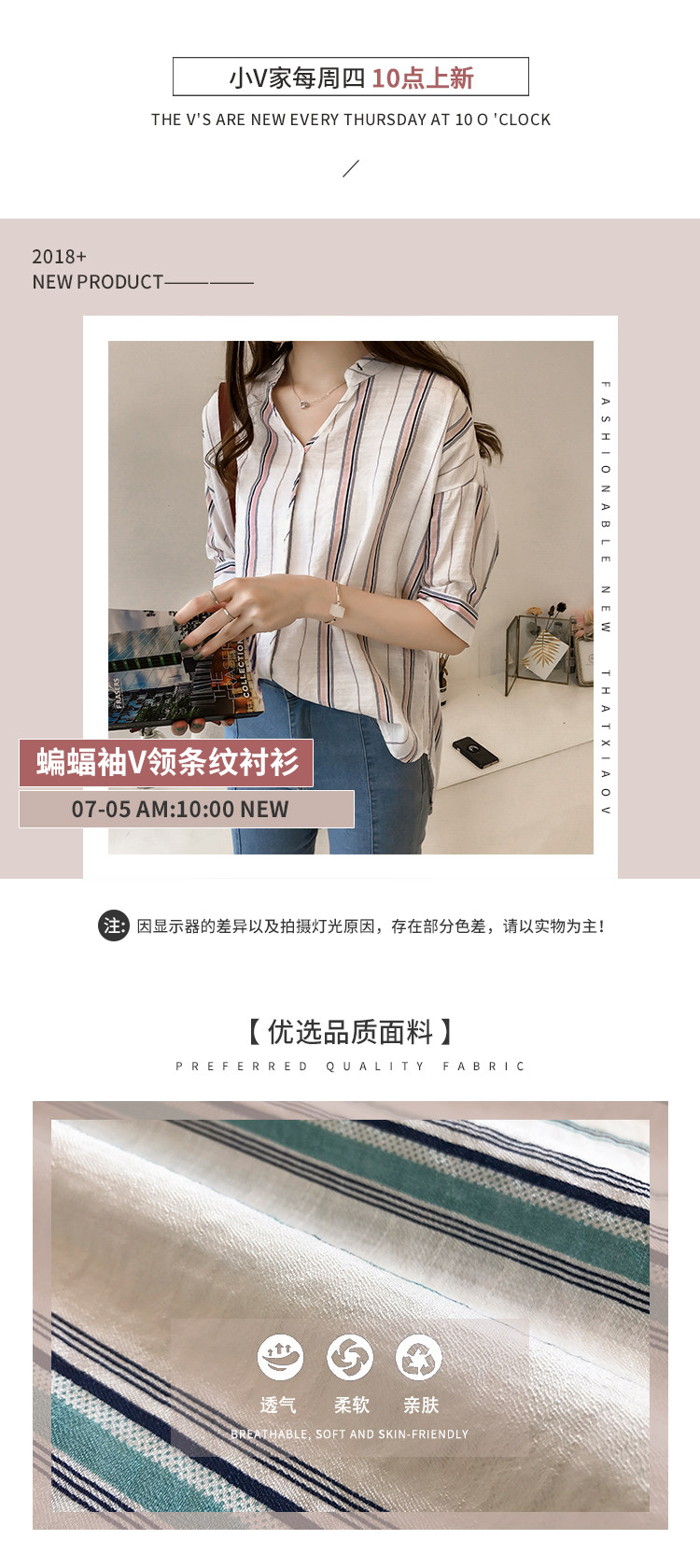 RY1747#hic宽松蝙蝠袖V领条纹衬衫女短袖上衣bf韩范衬衣潮