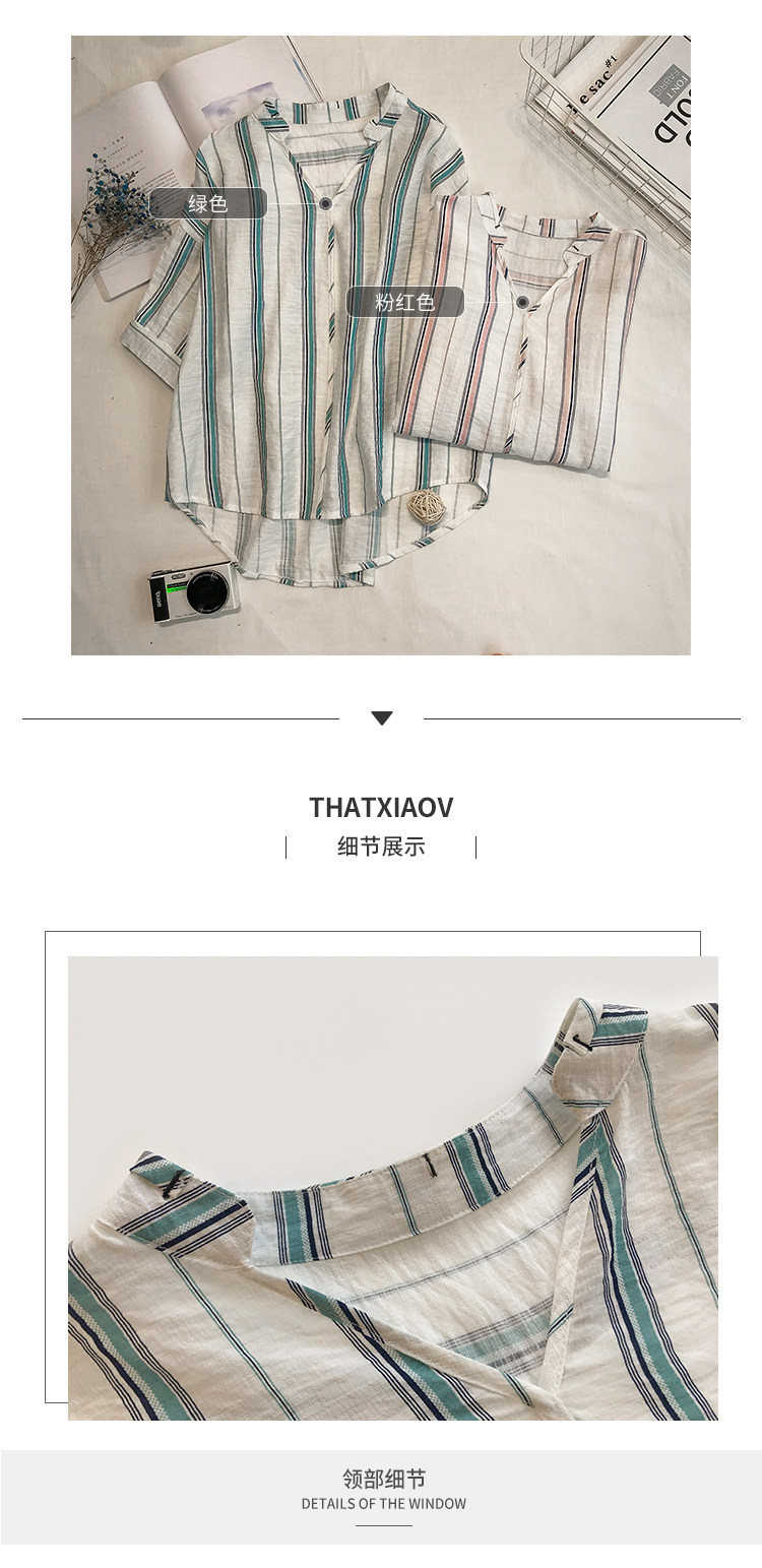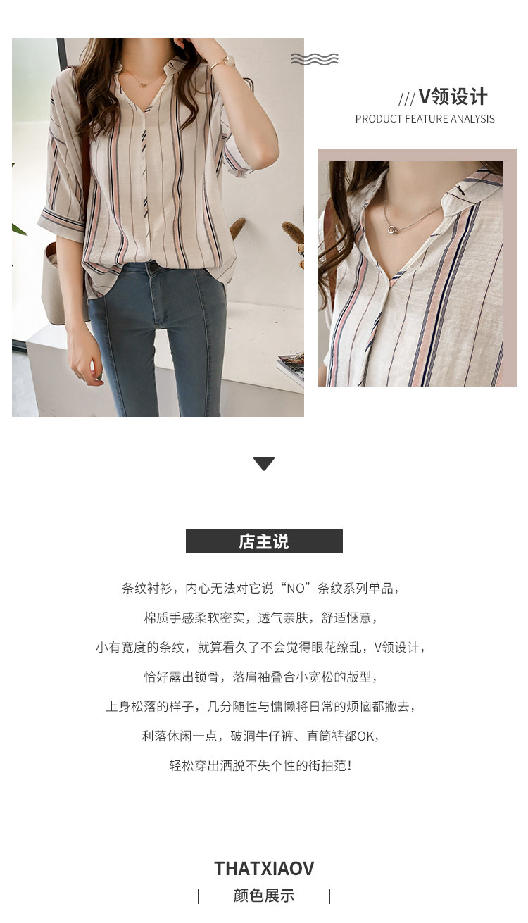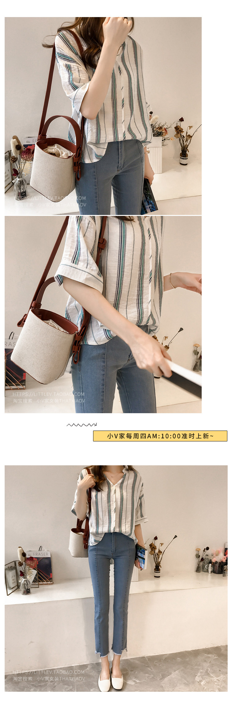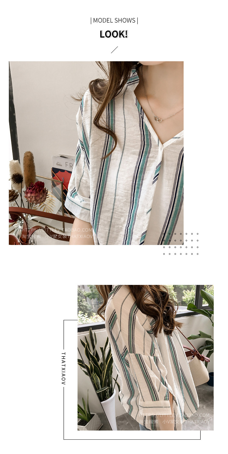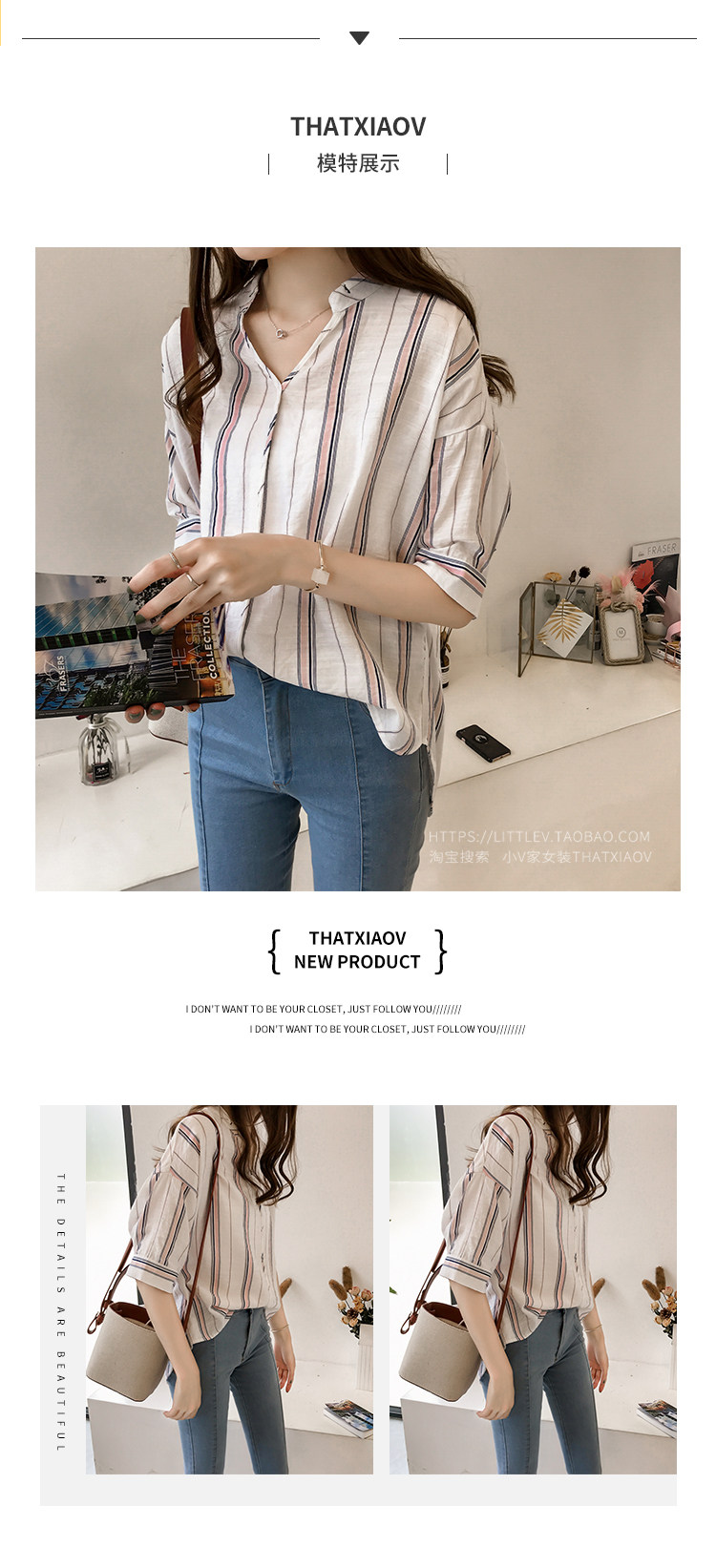 RY1747#hic宽松蝙蝠袖V领条纹衬衫女短袖上衣bf韩范衬衣潮