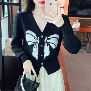 RM22557#秋冬加厚针织衫女同款复古蝴蝶结百搭长袖短款外搭小外套女