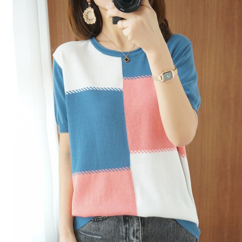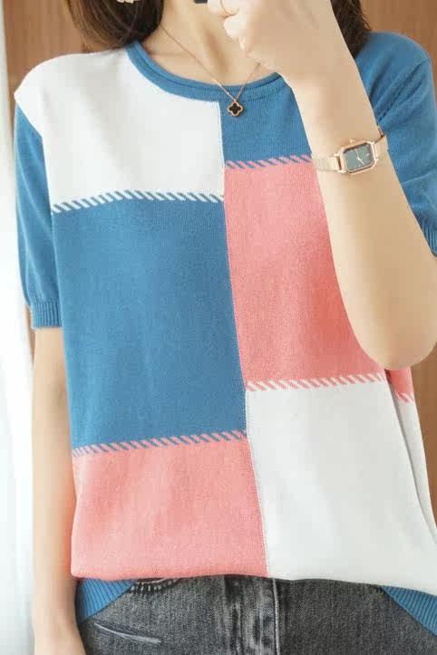 RY1762#圆领棉麻短袖女拼色T恤韩版宽松百搭显瘦半袖针织打底衫