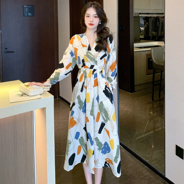 RM22597#连衣裙新款秋季高级感长袖法式复古V领气质收腰显瘦过膝长裙