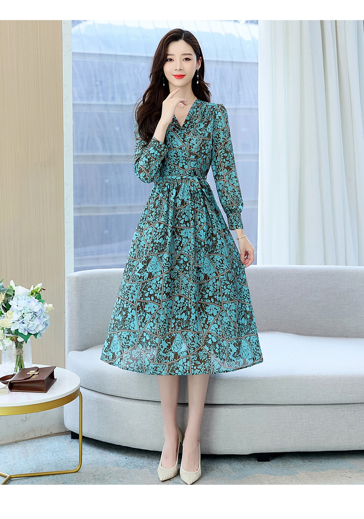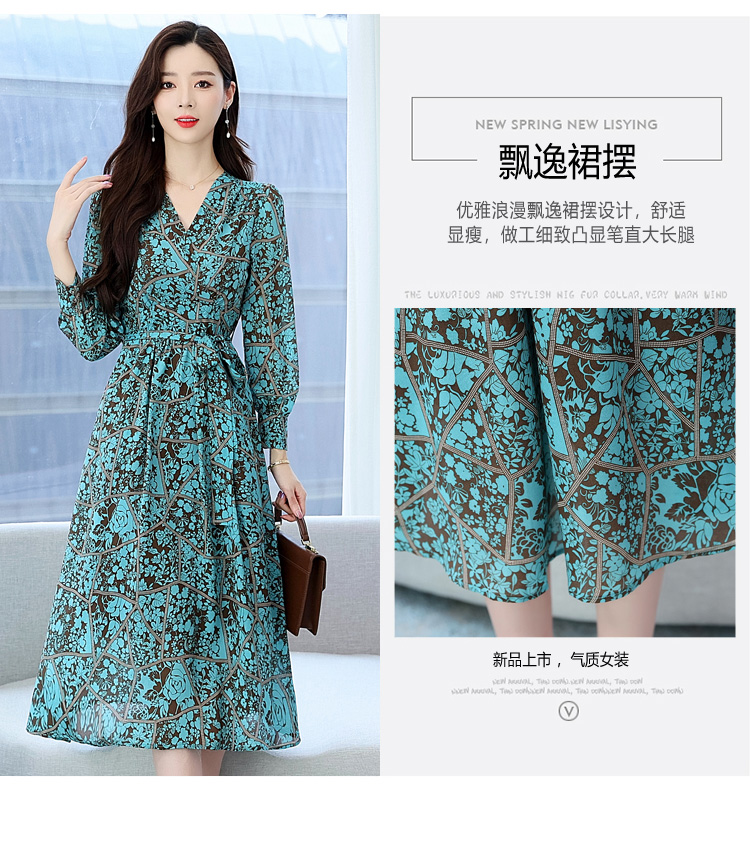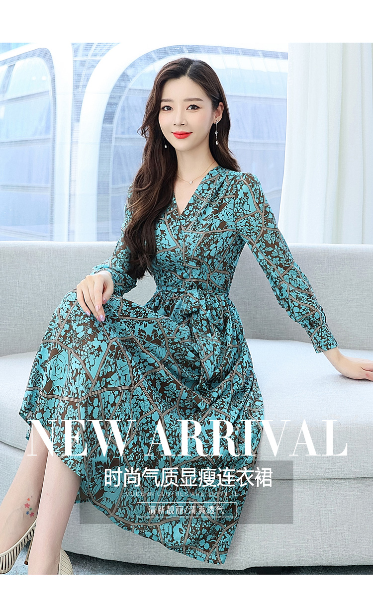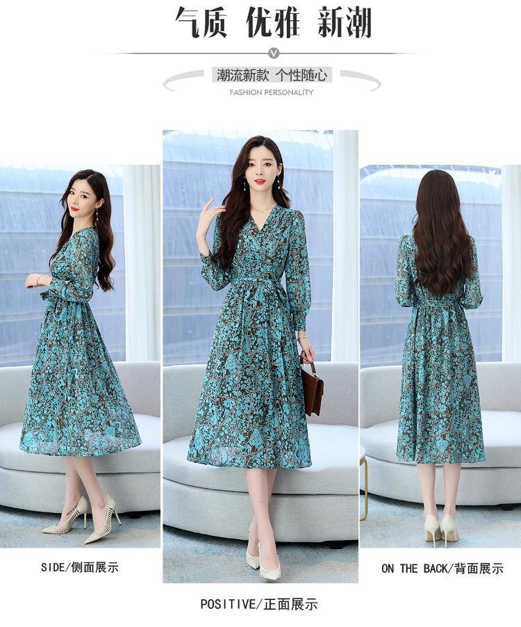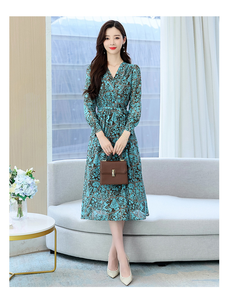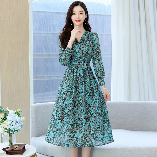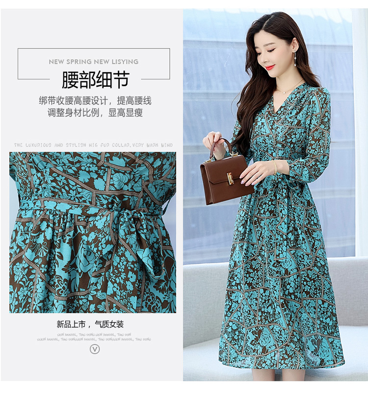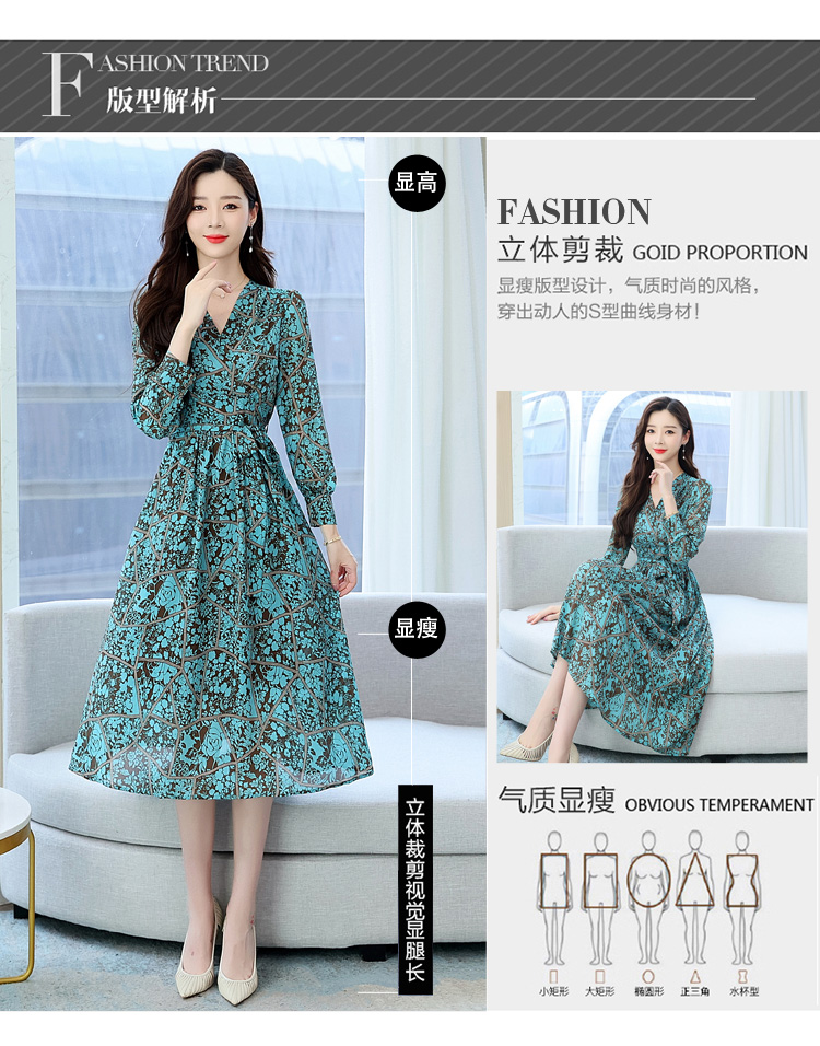 RM22605#碎花长袖连衣裙女春秋新款法式裹身长款桔梗裙收腰雪纺长裙