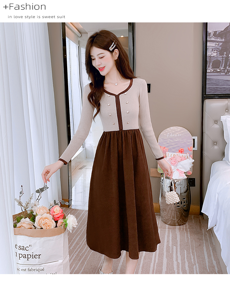 RM22805#小香风撞色方领双排扣拼接气质针织连衣裙秋冬新款打底长款裙子女