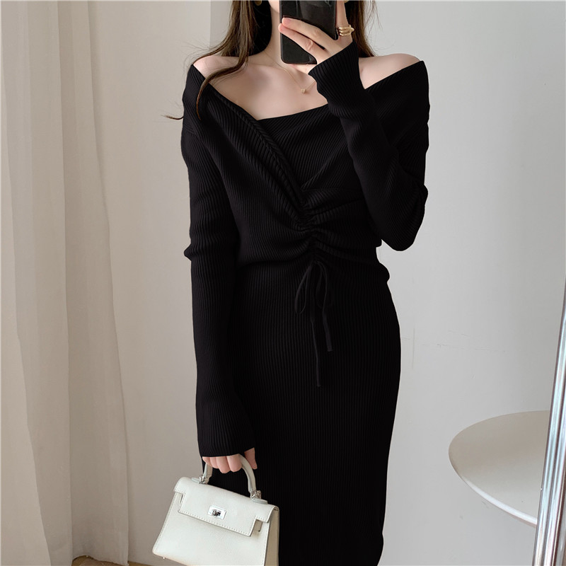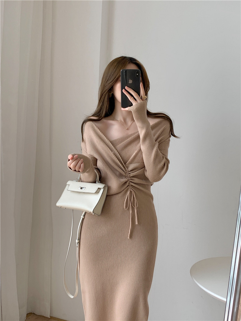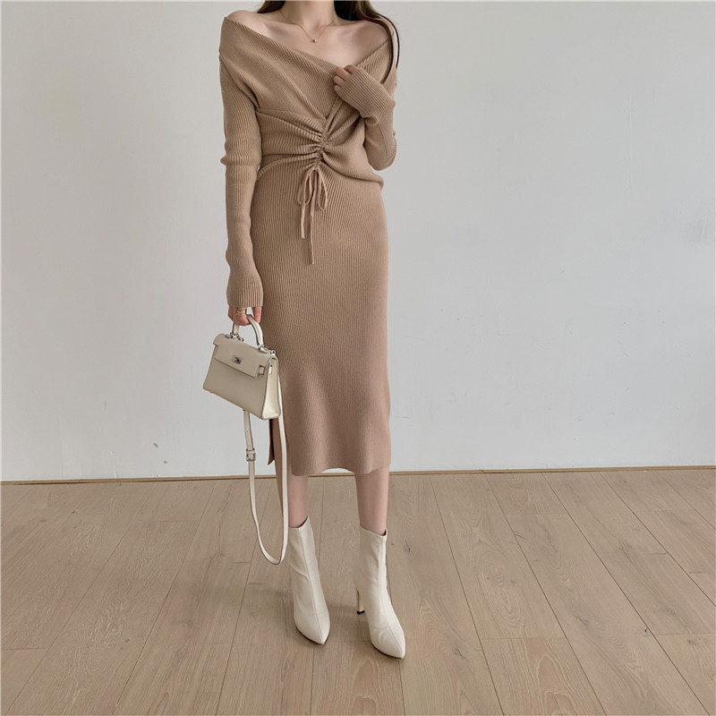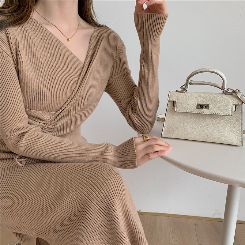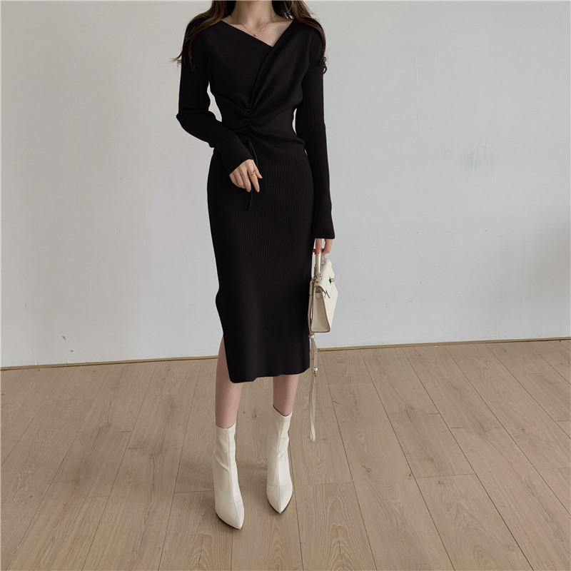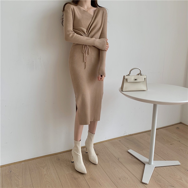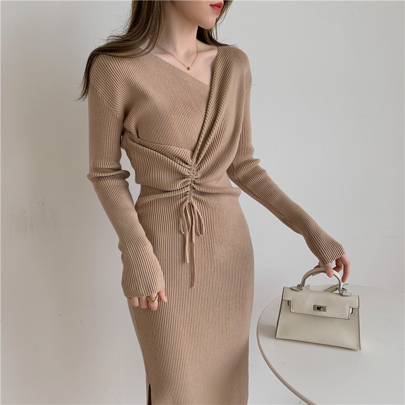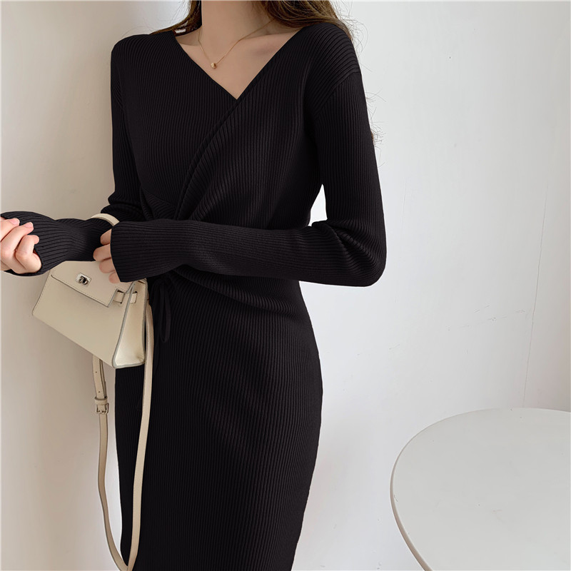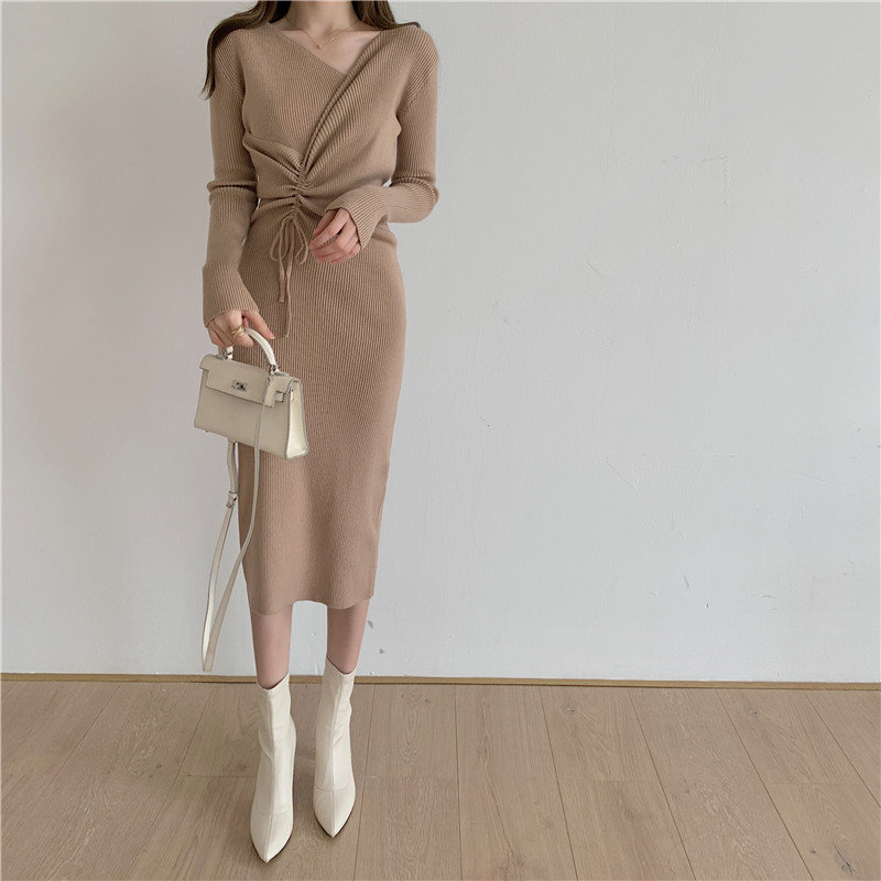 RM22788#修身内搭毛衣裙子秋冬长款过膝长袖V领抽绳针织连衣裙女
