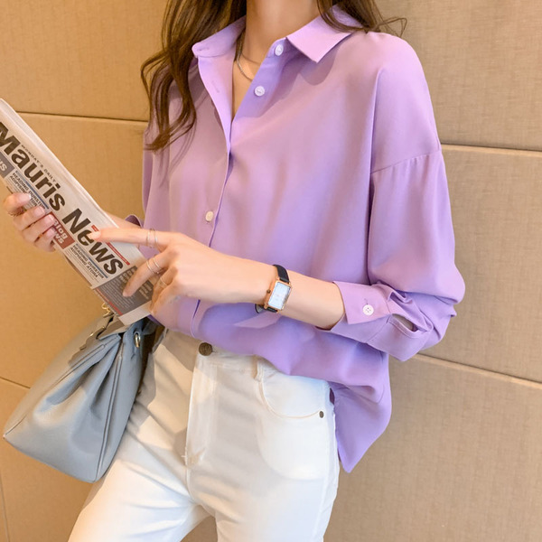 RM22943#韩版春秋季新款女装翻领紫色基础款雪纺衫开衫衬衫打底衫衬衣