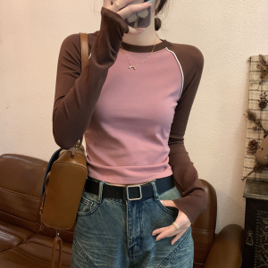 RM23026#复古正肩长袖t恤女2023秋装新款修身显瘦纯棉内搭打底衫上衣