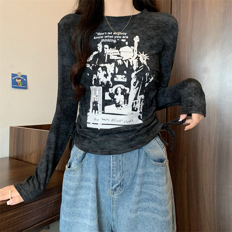 RM23074#秋冬新款扎染抽绳正肩长袖T恤女美式复古辣妹纯棉打底衫