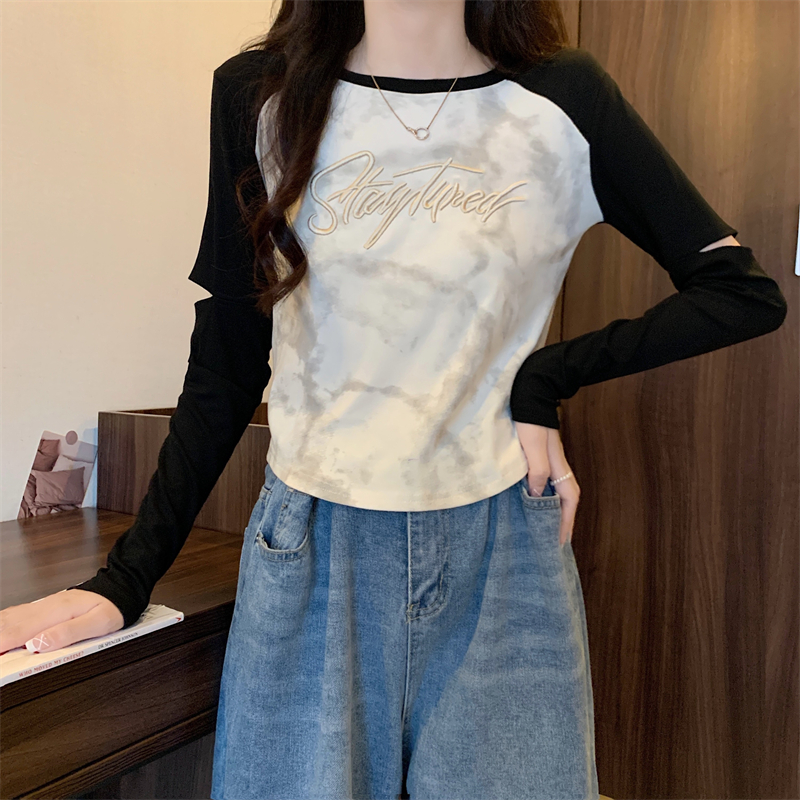 RM23079#早秋新款2023长袖T恤女美式复古晕染拼色短款辣妹百搭上衣女