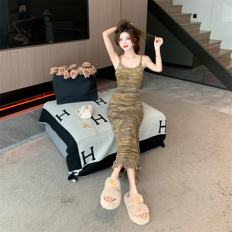 RM23087#韩版时尚流苏条纹拼色气质吊带针织加厚背心连衣裙