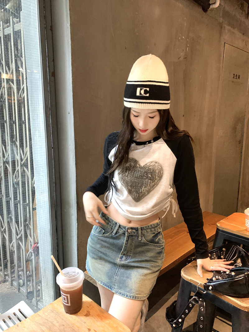RM23244#早秋大码显瘦圆领拼接字母印花抽绳短款长袖T恤女打底衫