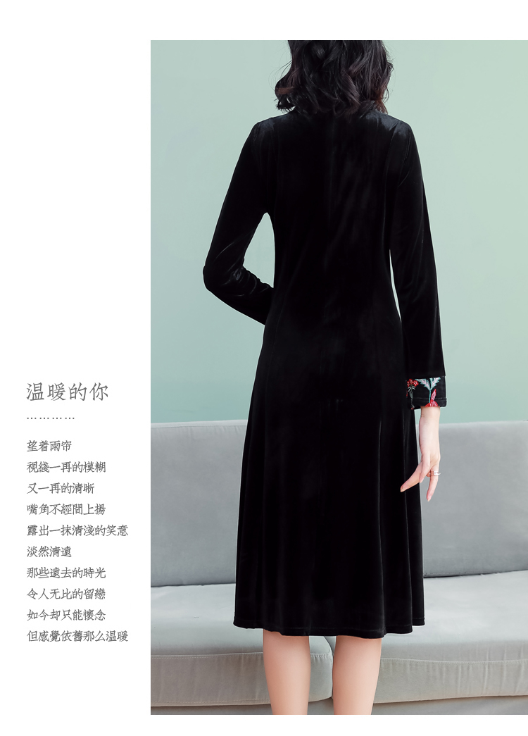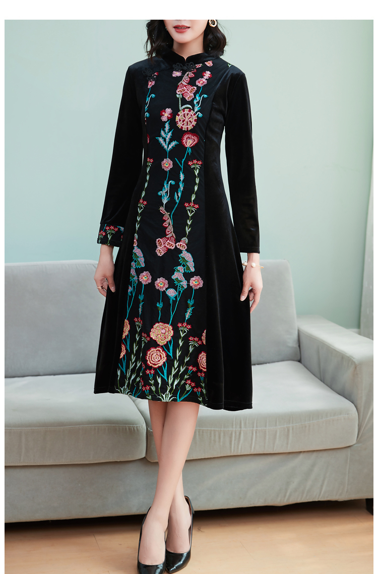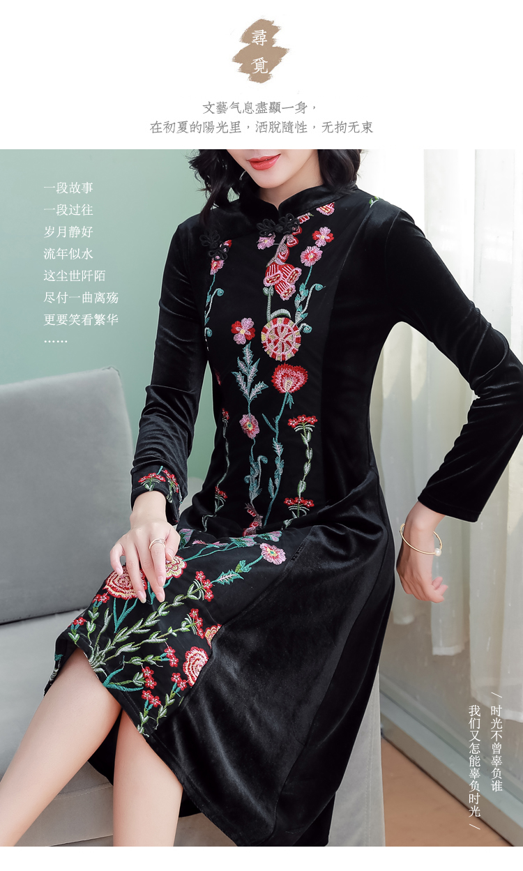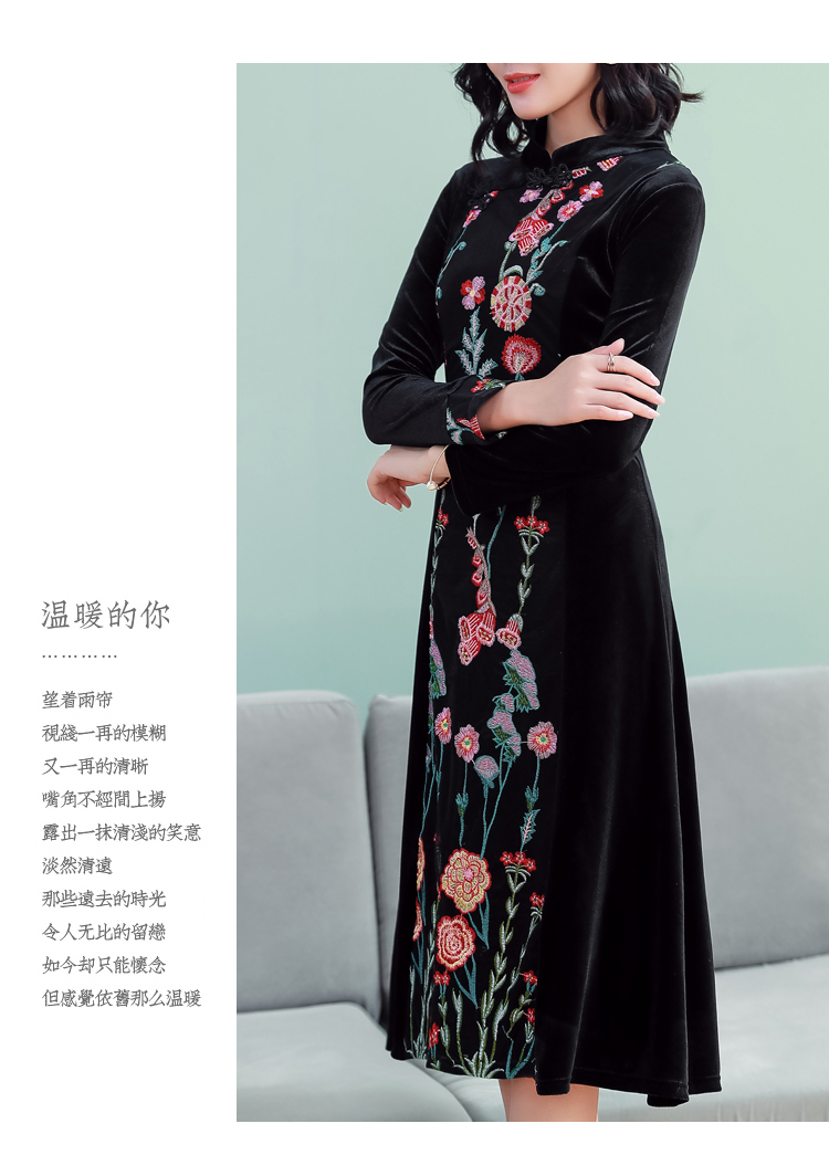 RM23350#中国风立领绣花长袖连衣裙女秋冬季修身大码金丝绒中长裙女裙