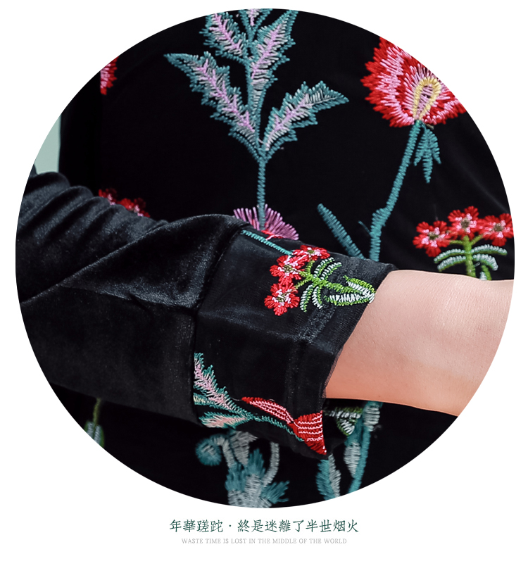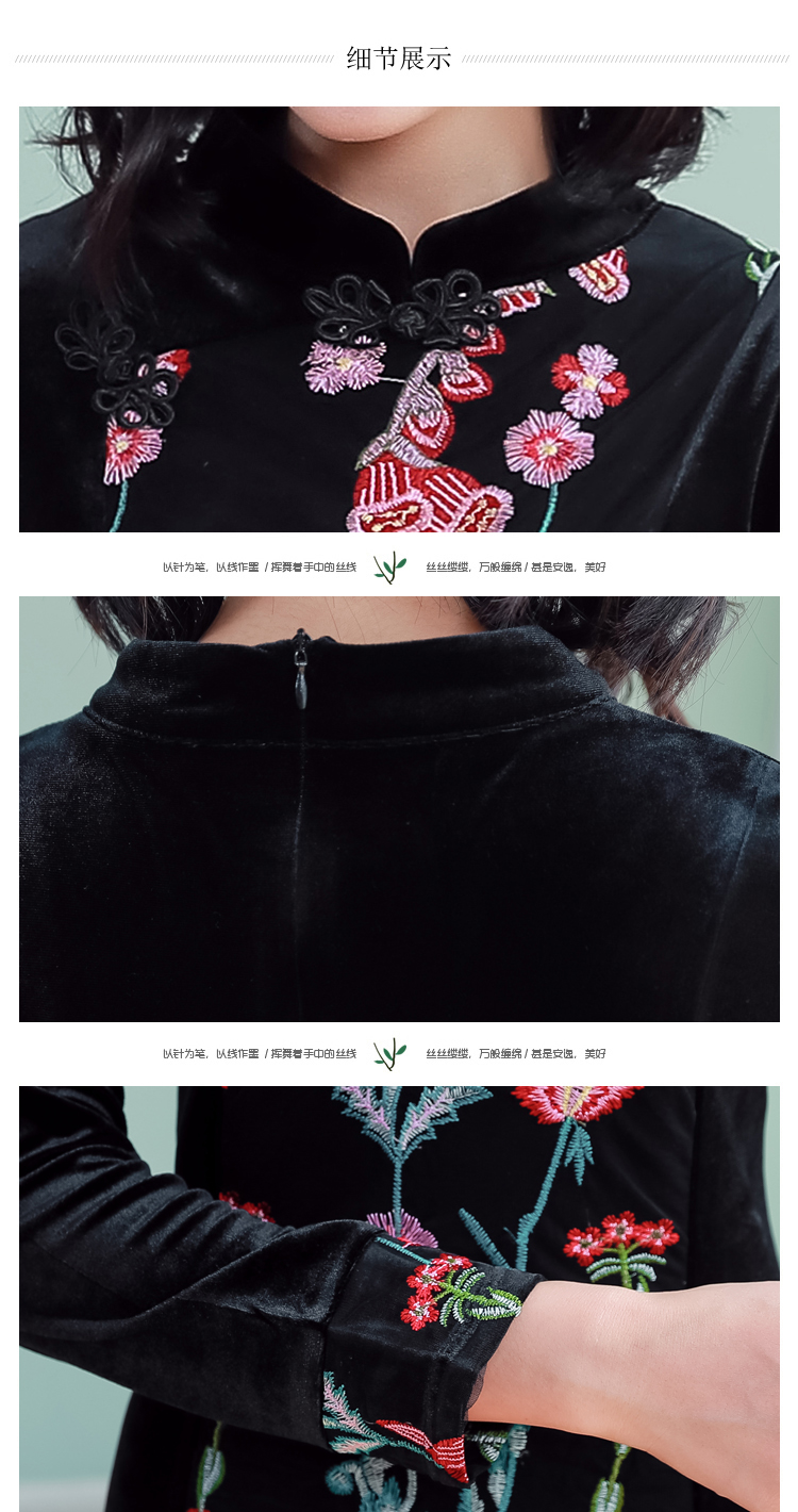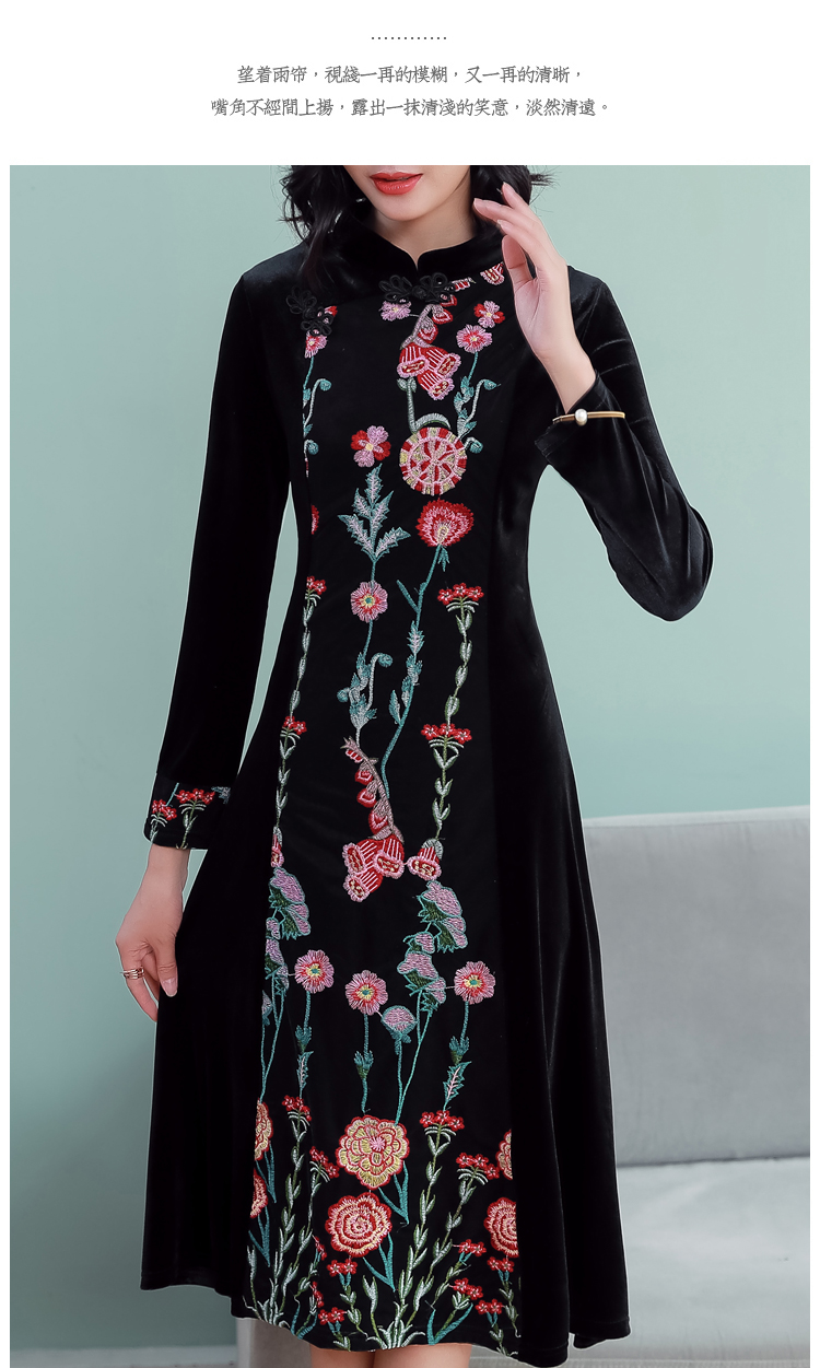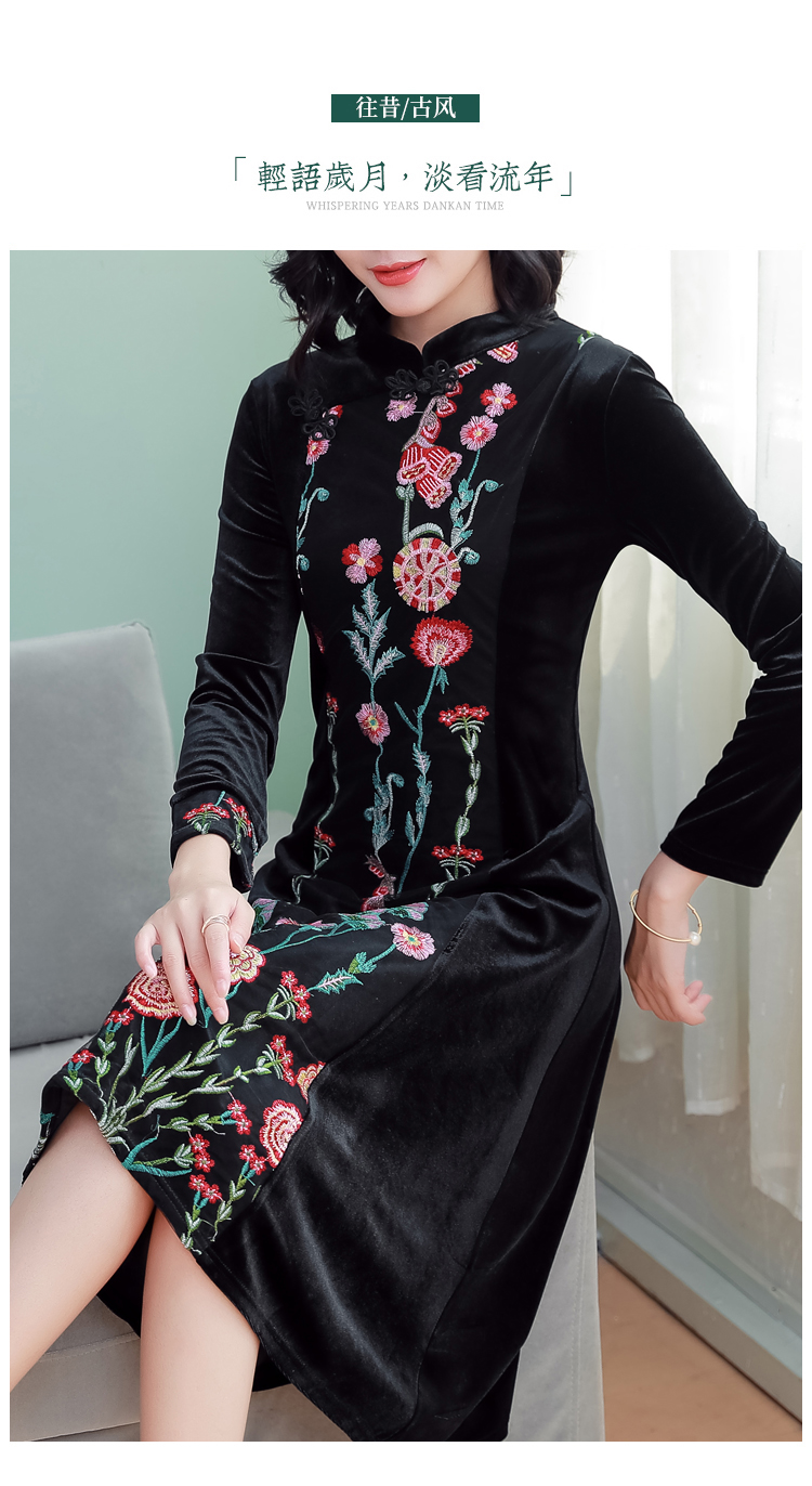 RM23350#中国风立领绣花长袖连衣裙女秋冬季修身大码金丝绒中长裙女裙