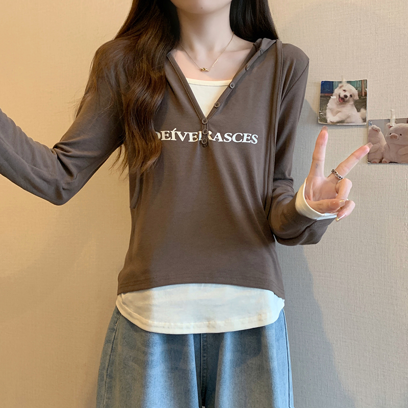 RM23566#新款胖mm辣妹字母印花假两件设计感连帽卫衣百搭上衣