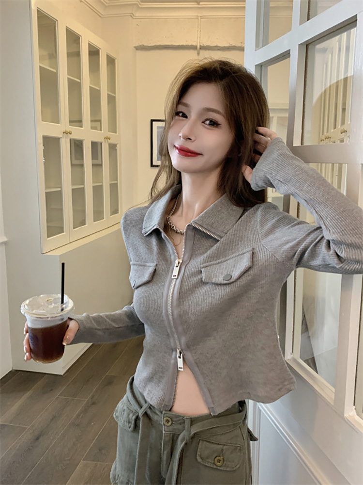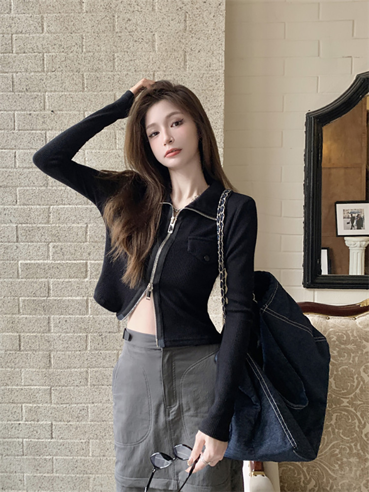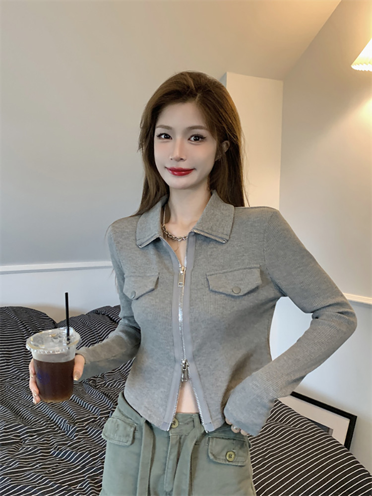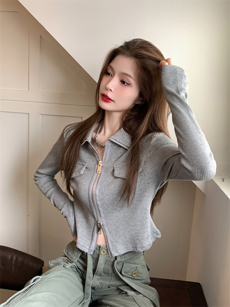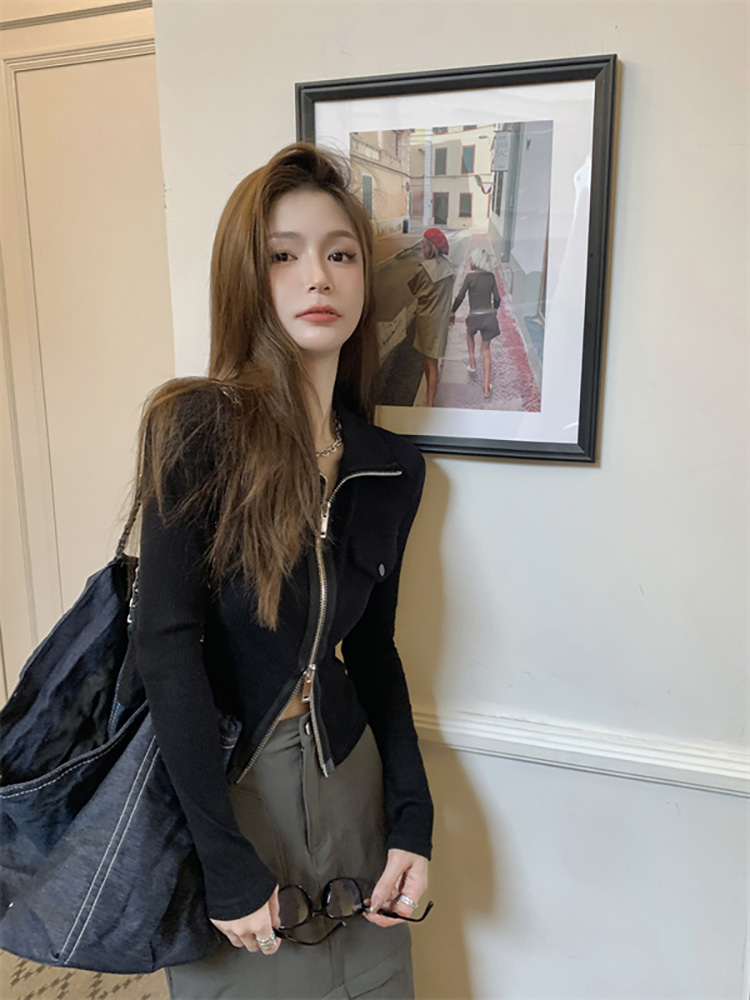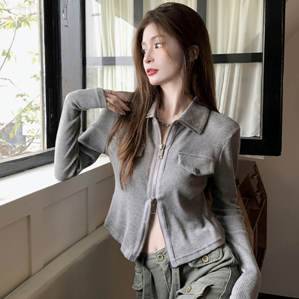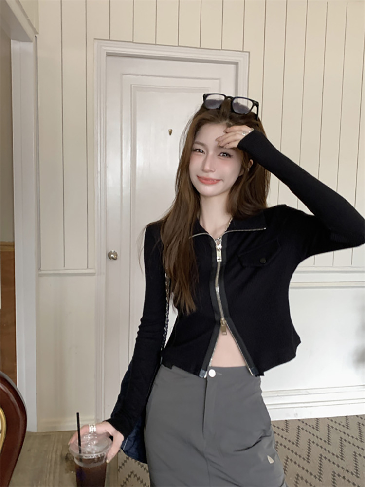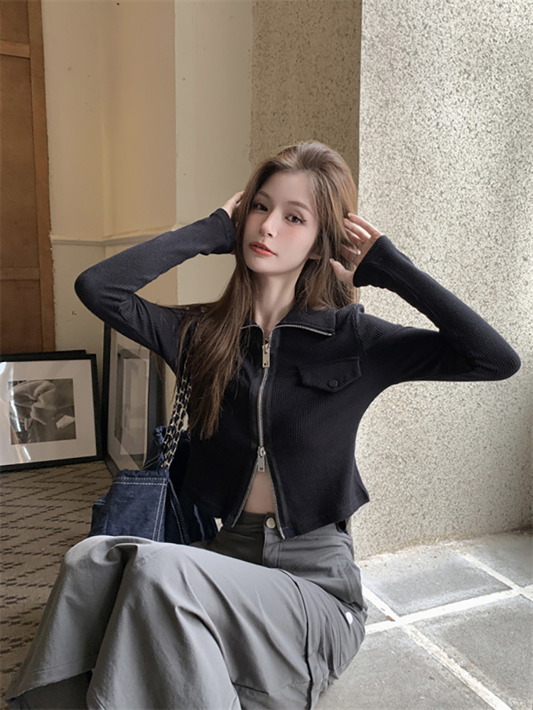 RM23573#双拉链长袖T恤女装秋季气质韩版新款修身显瘦休闲时尚打底POLO衫