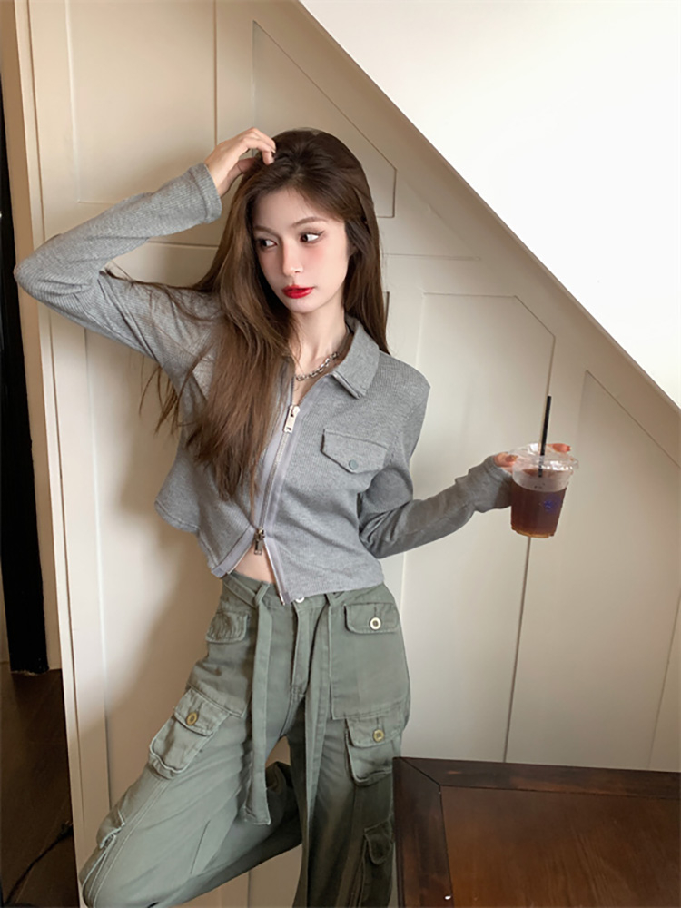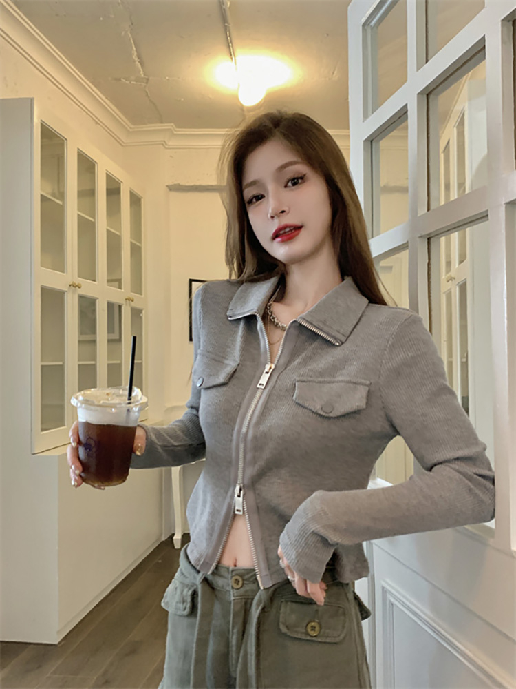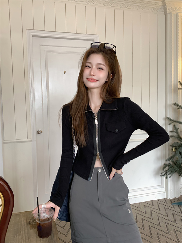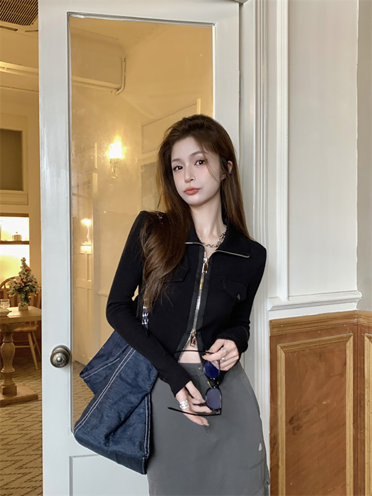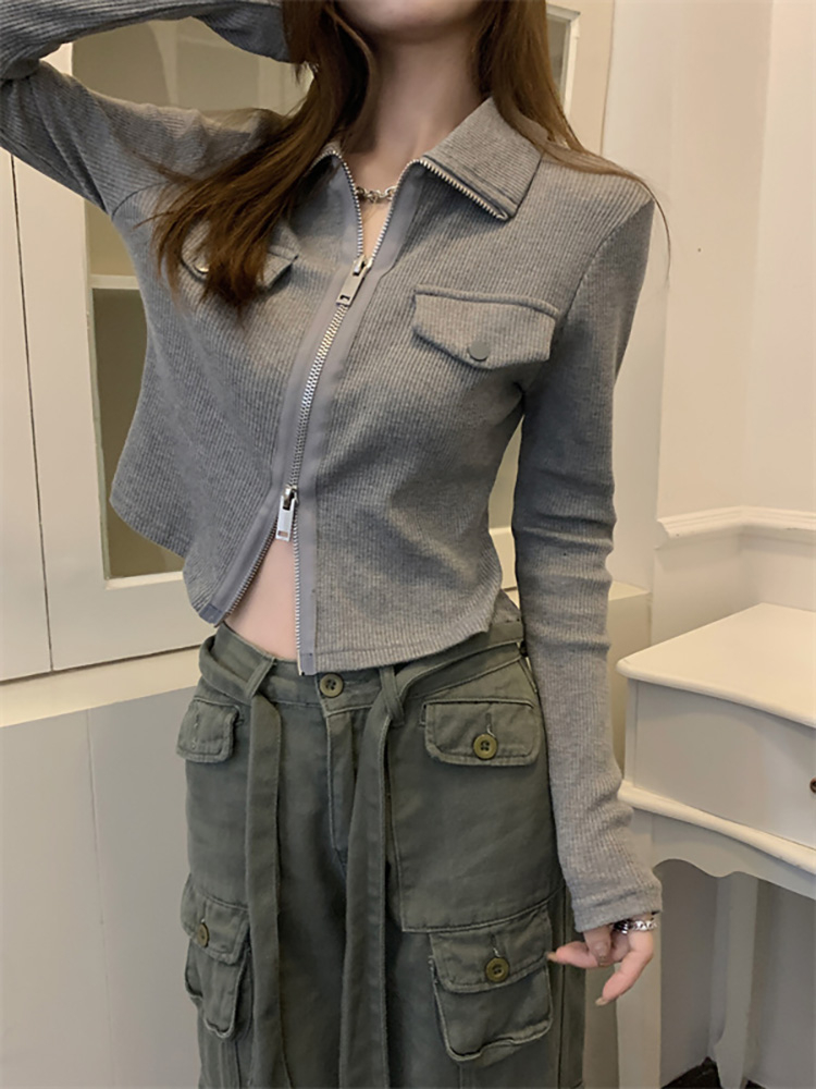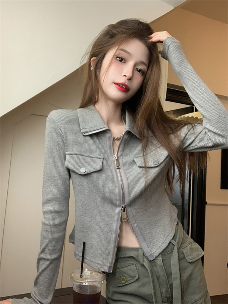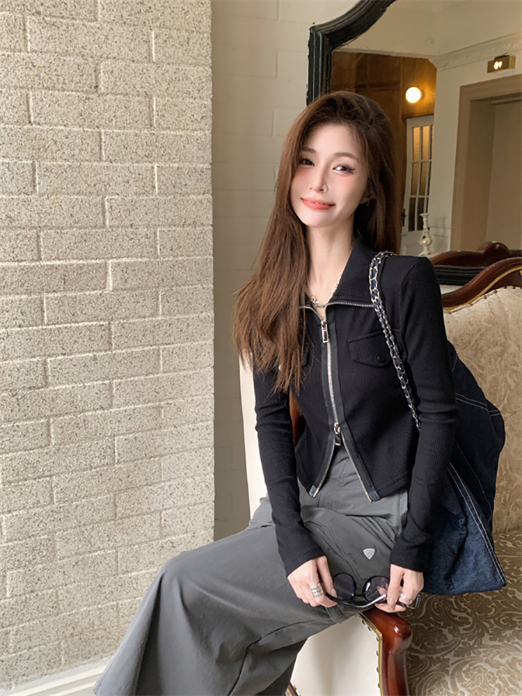 RM23573#双拉链长袖T恤女装秋季气质韩版新款修身显瘦休闲时尚打底POLO衫