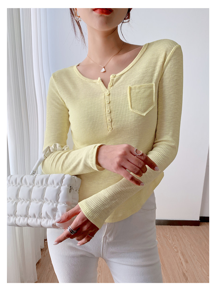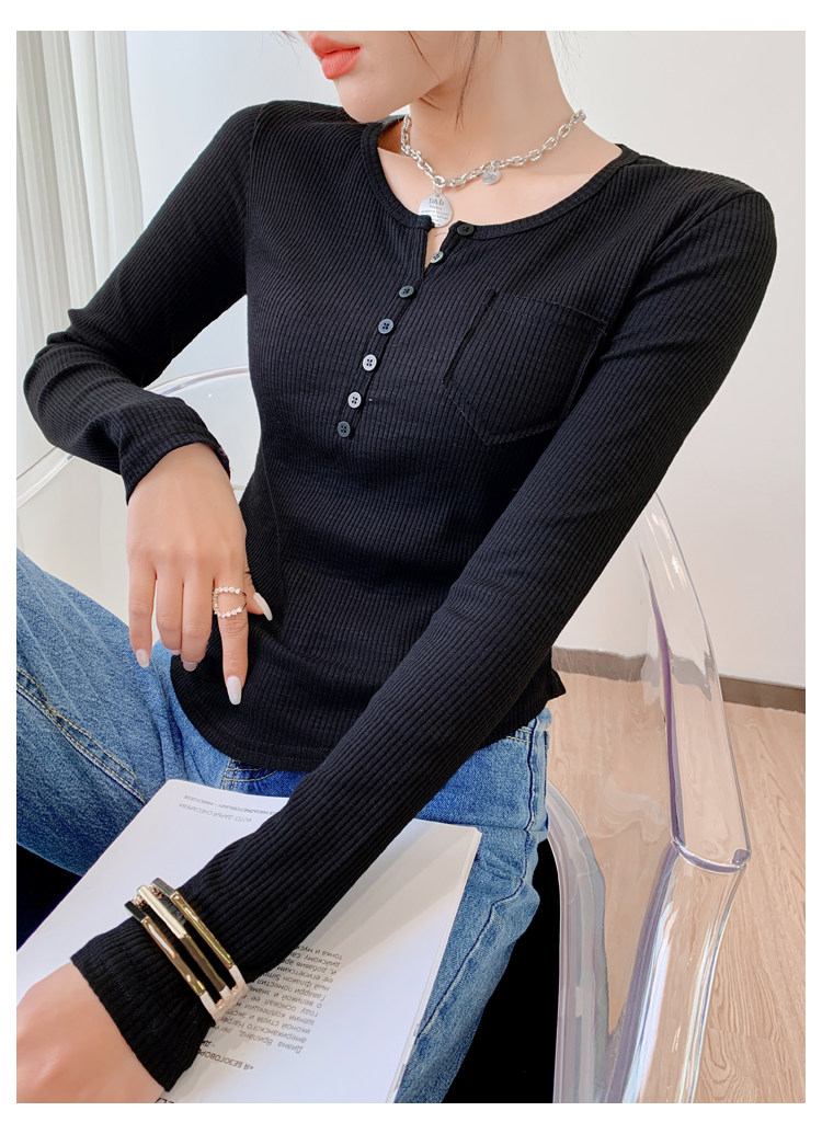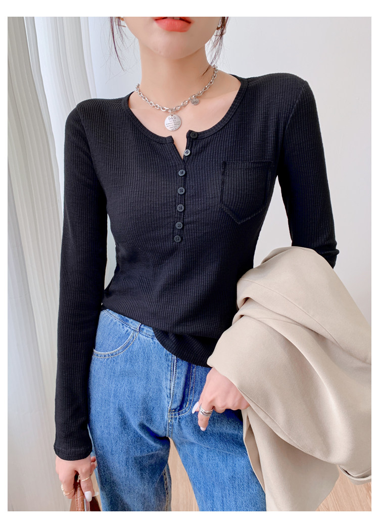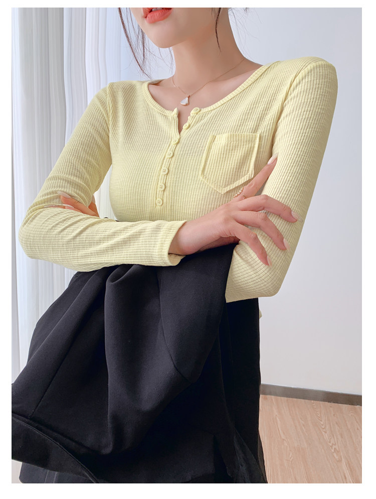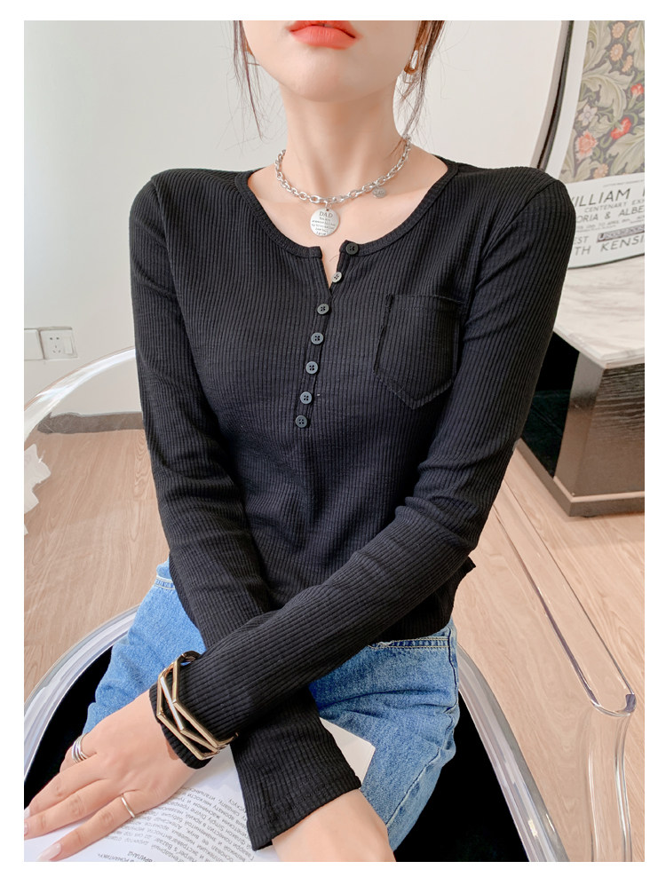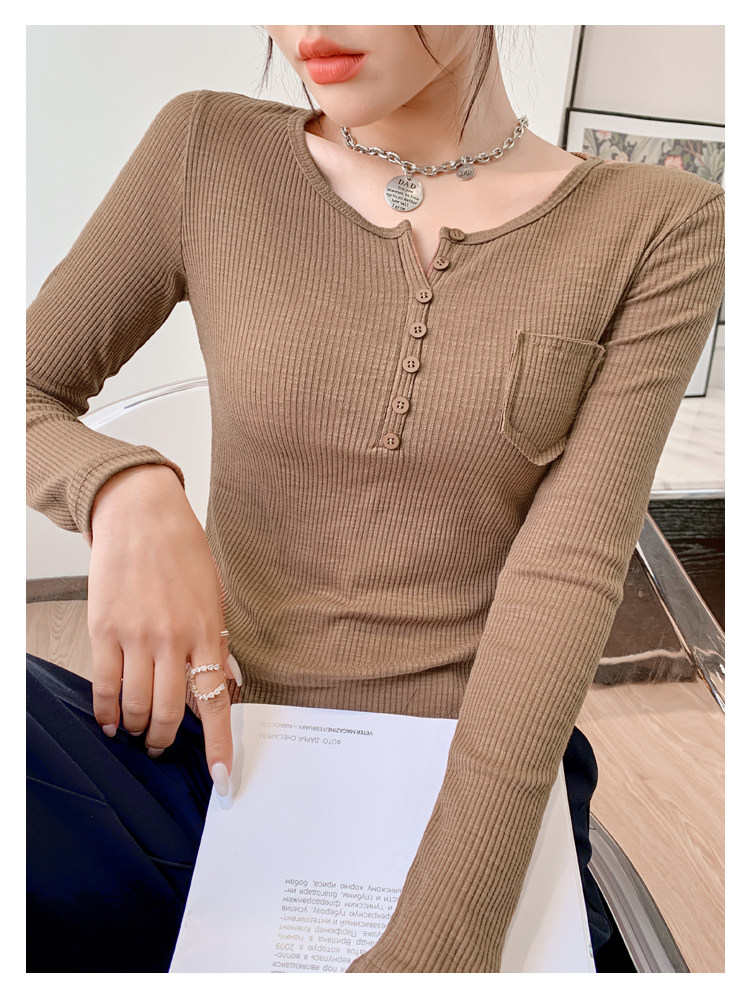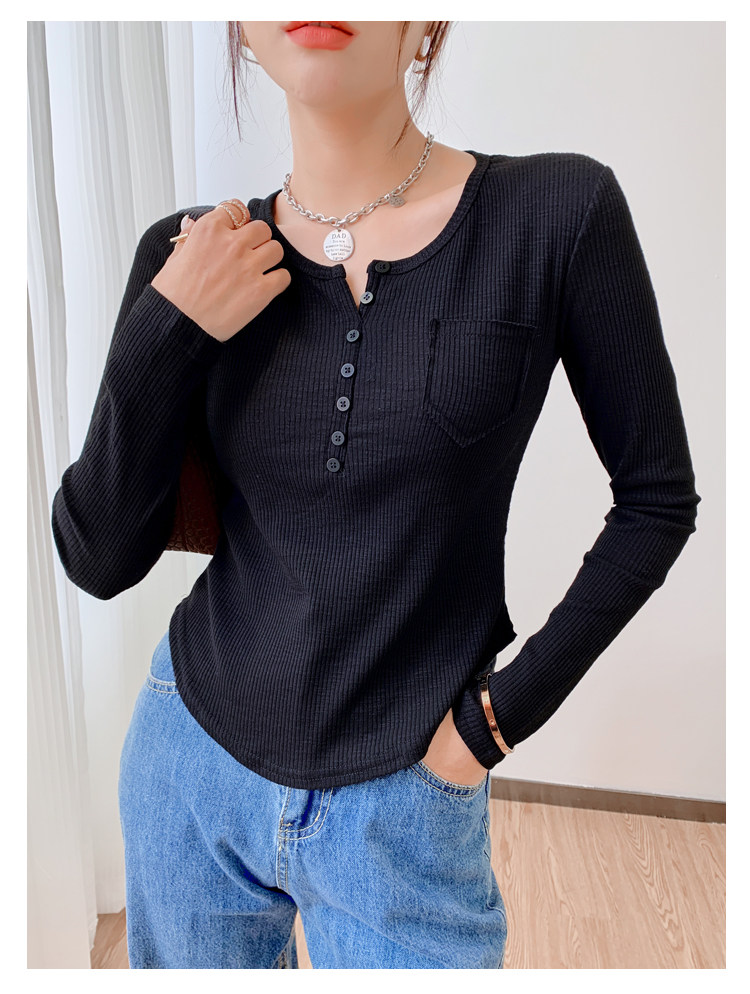 RM23646#修身显瘦百搭纽扣V领长袖短款T恤上衣早秋气质韩版打底衫女