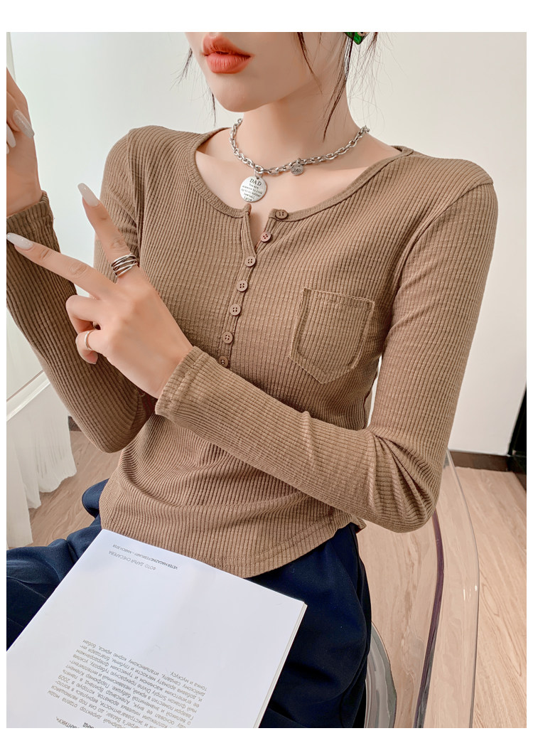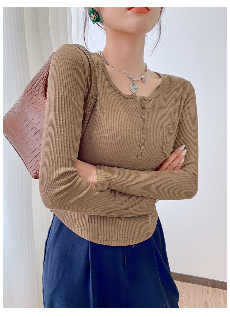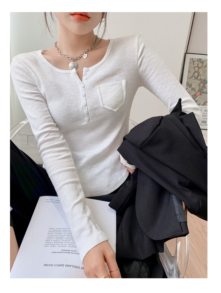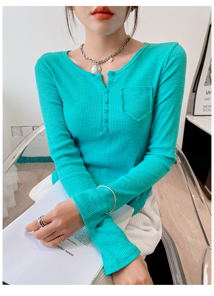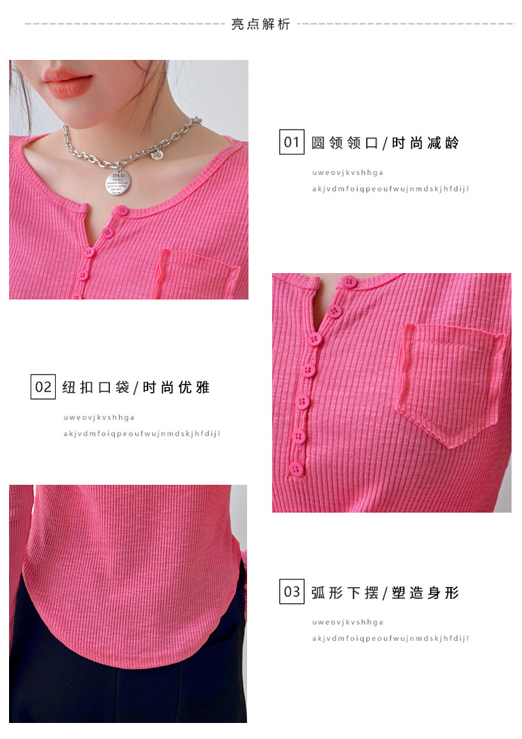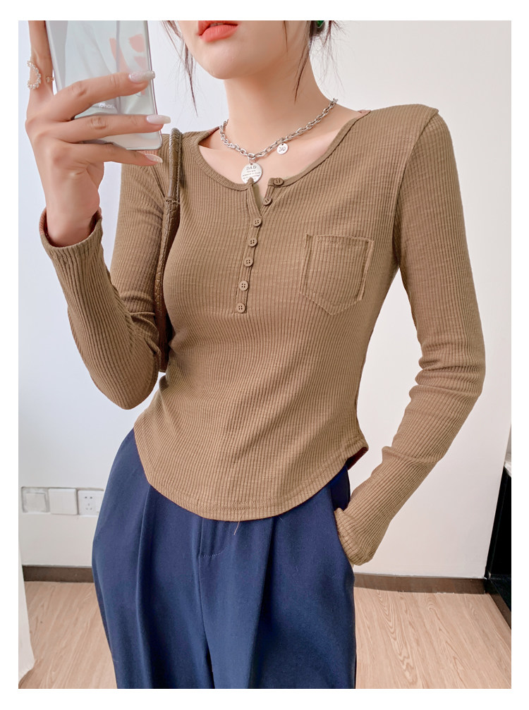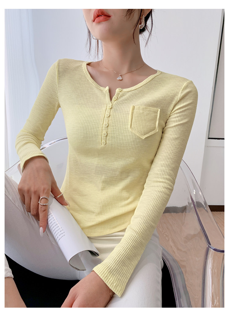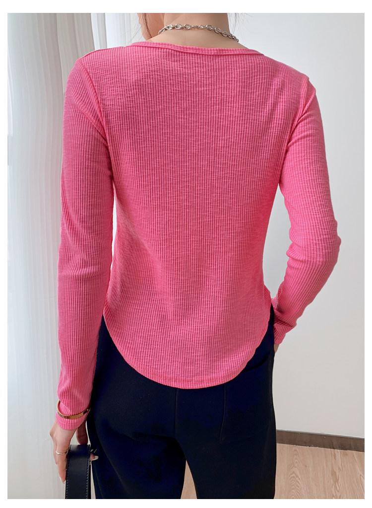 RM23646#修身显瘦百搭纽扣V领长袖短款T恤上衣早秋气质韩版打底衫女