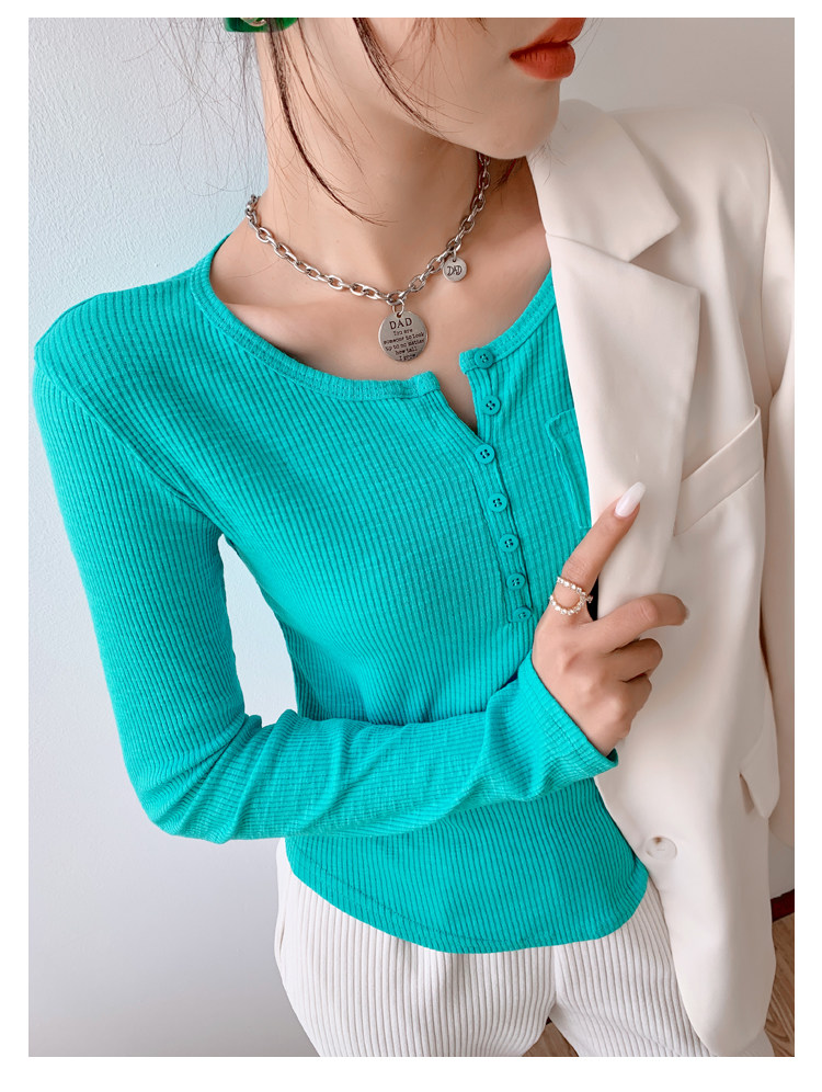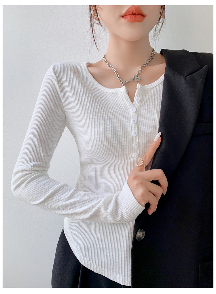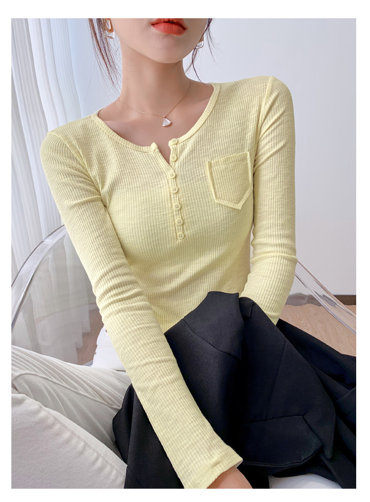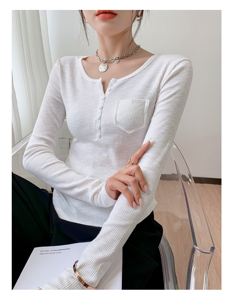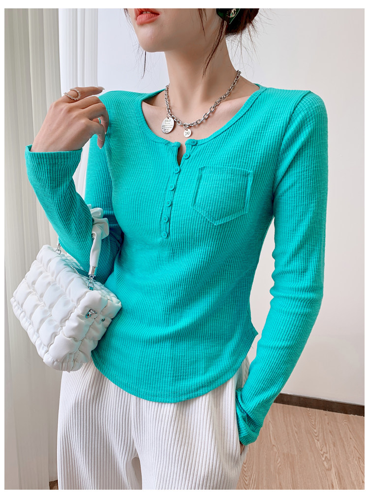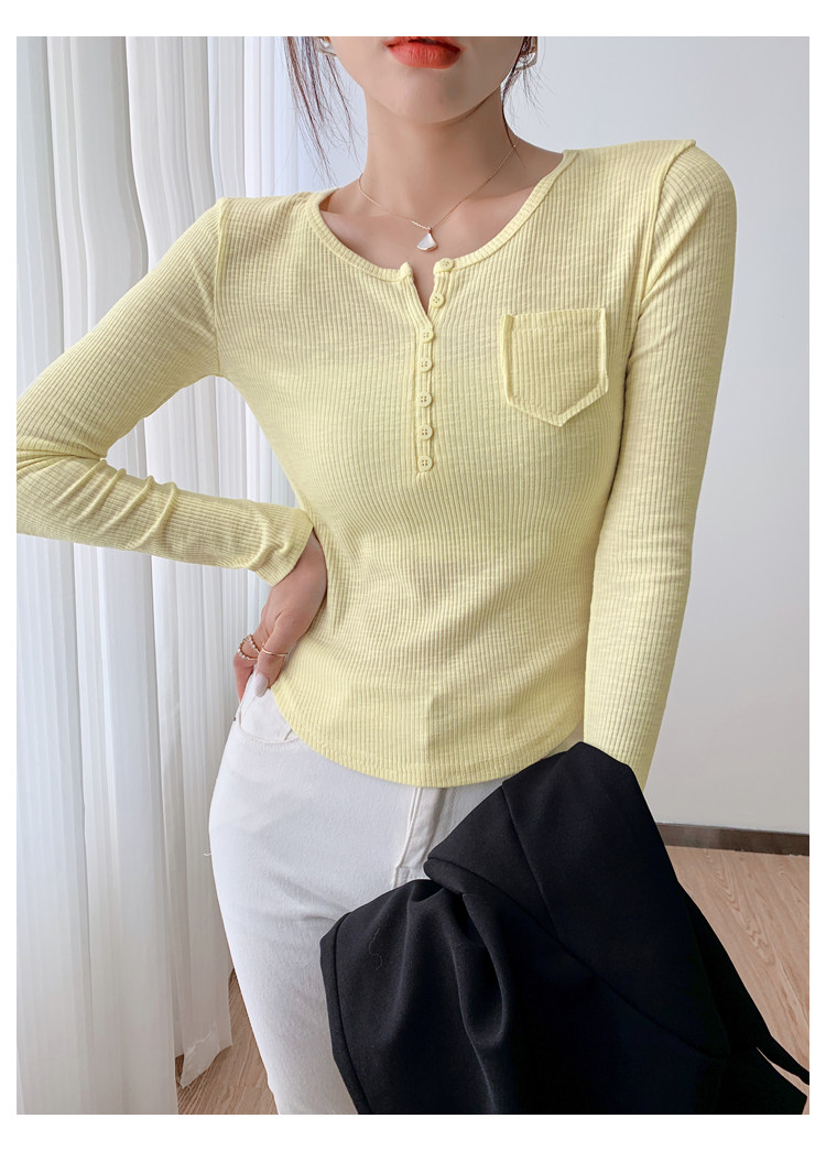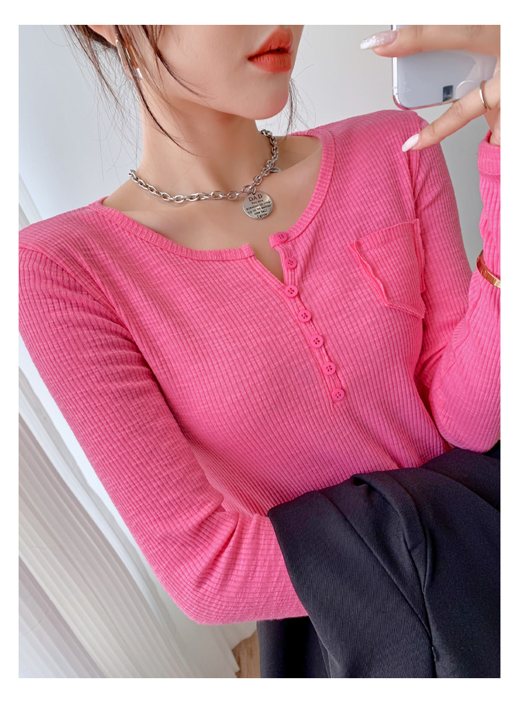RM23646#修身显瘦百搭纽扣V领长袖短款T恤上衣早秋气质韩版打底衫女