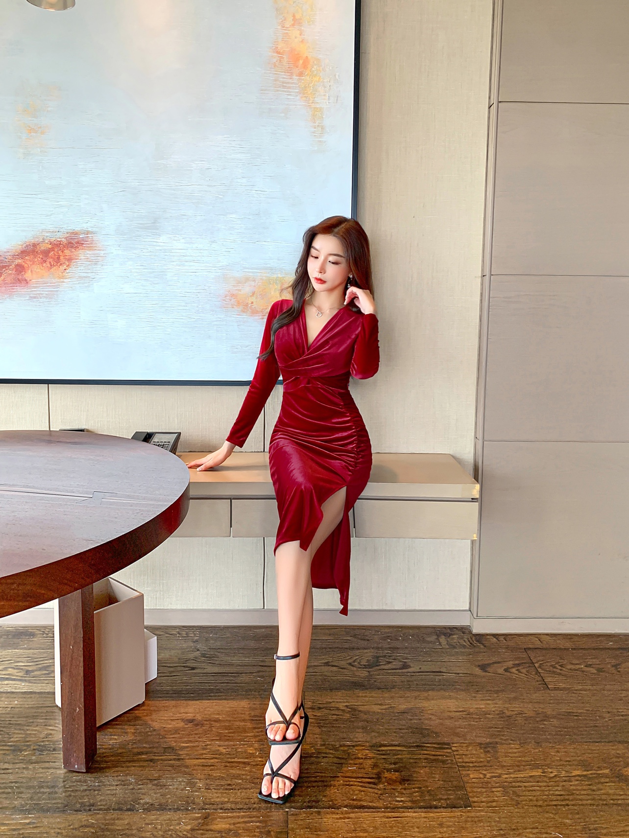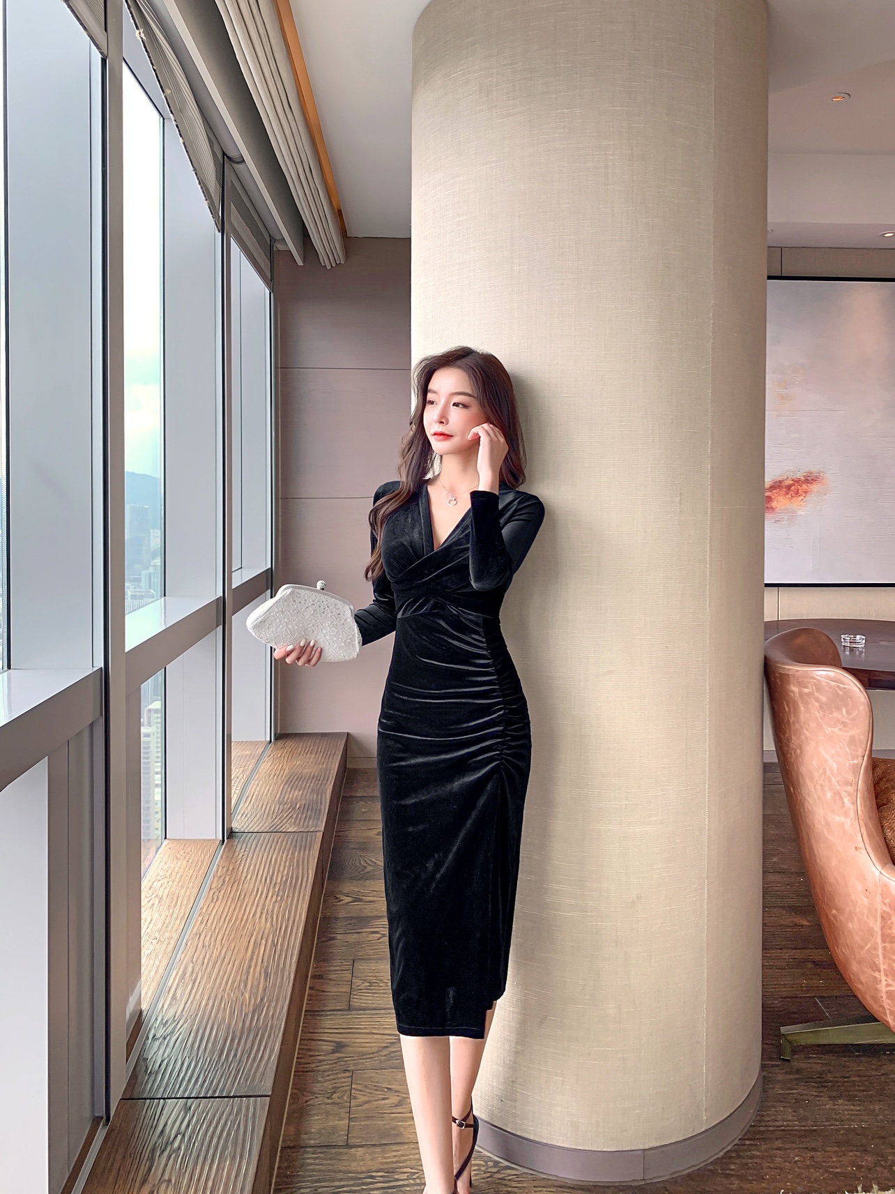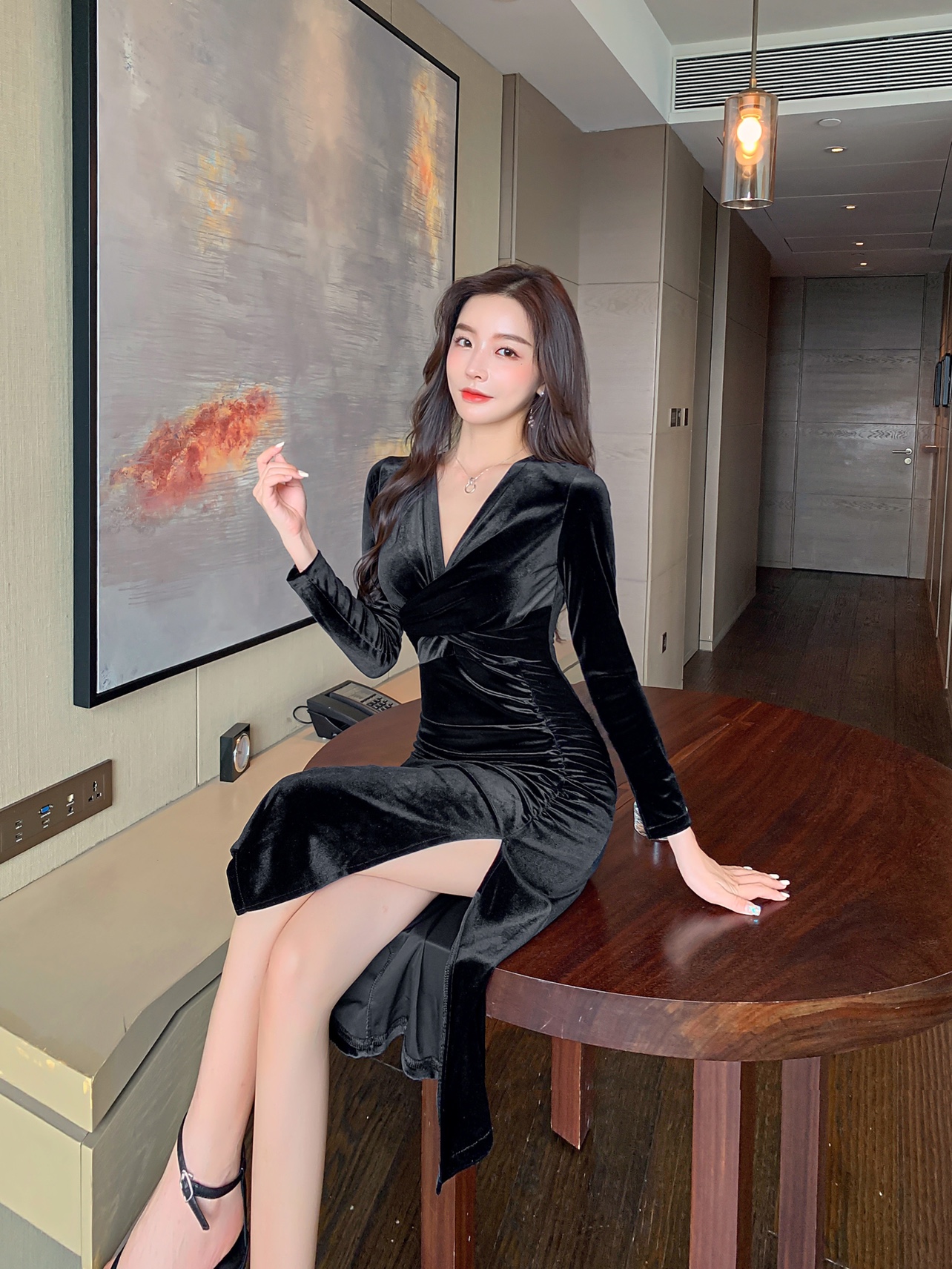 RM23991#性感高开衩深V低胸长袖紧身包臀长款连衣裙