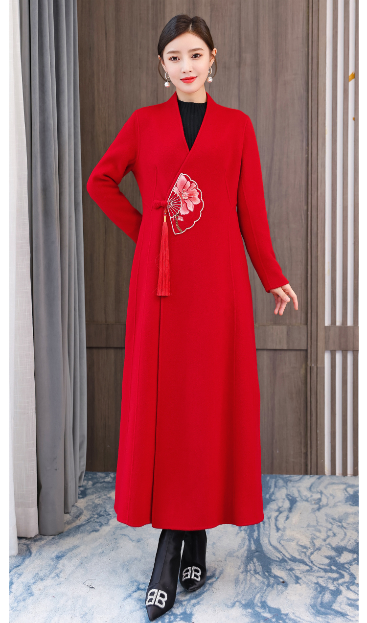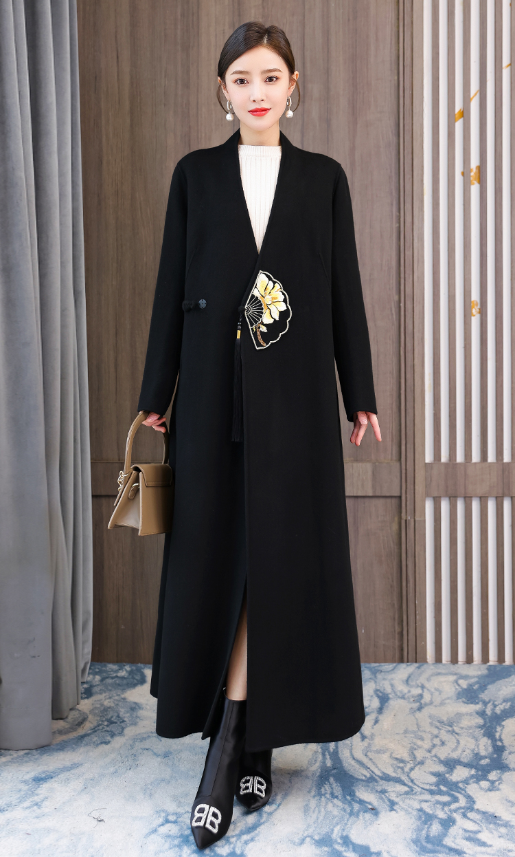 RM24255#中式毛呢大衣复古刺绣中国风女装古风旗袍外套禅意茶服女冬装