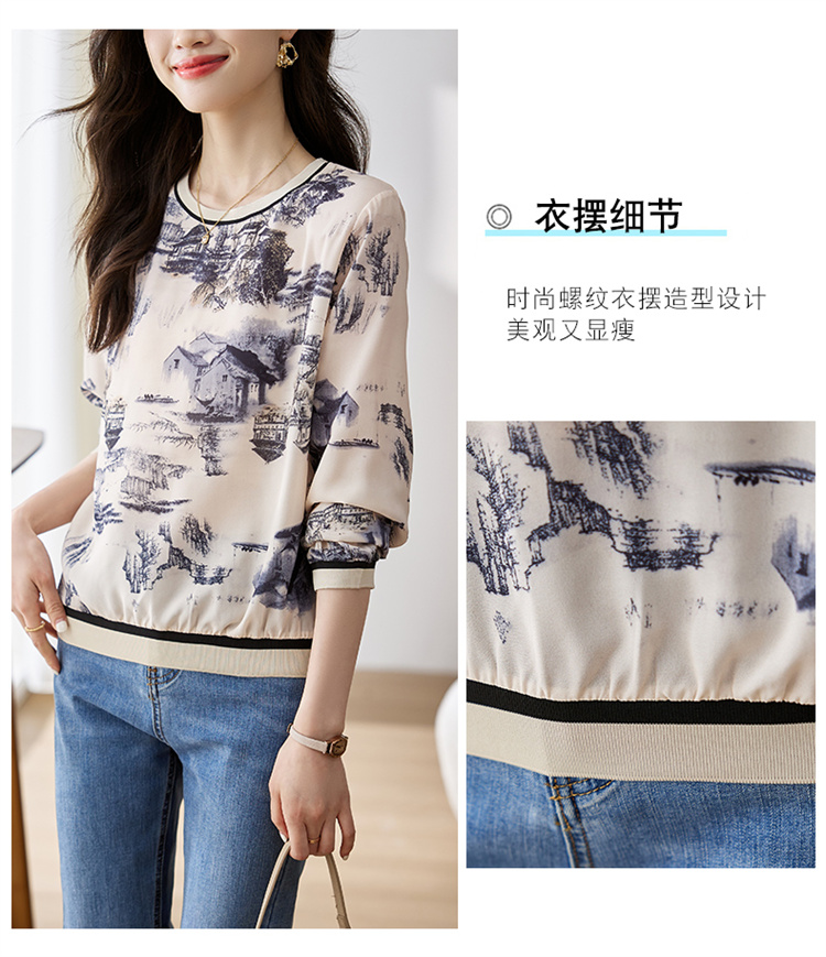 RM24288#新款秋高端韩国麻印花圆领长袖宽松休闲气质套头上衣