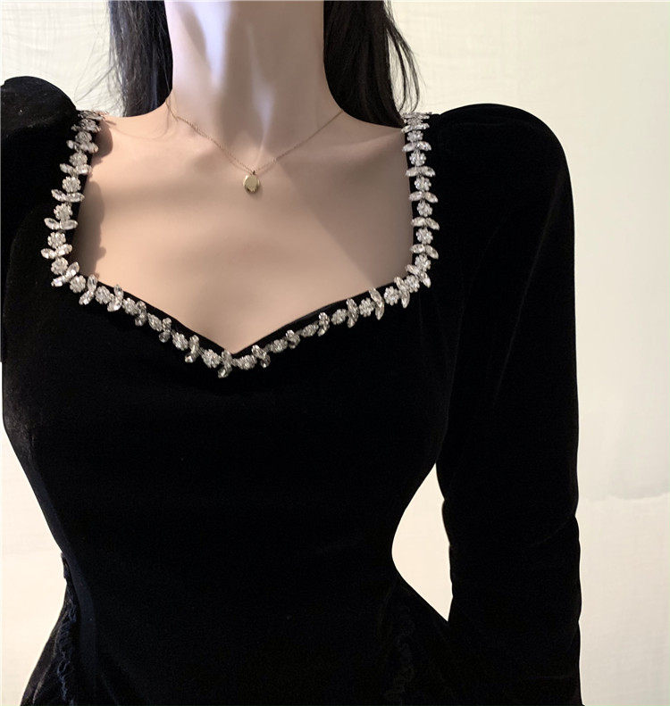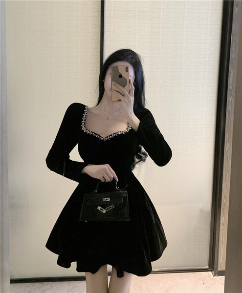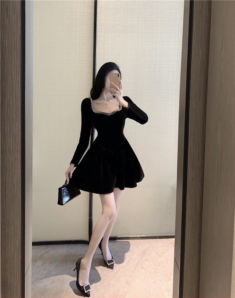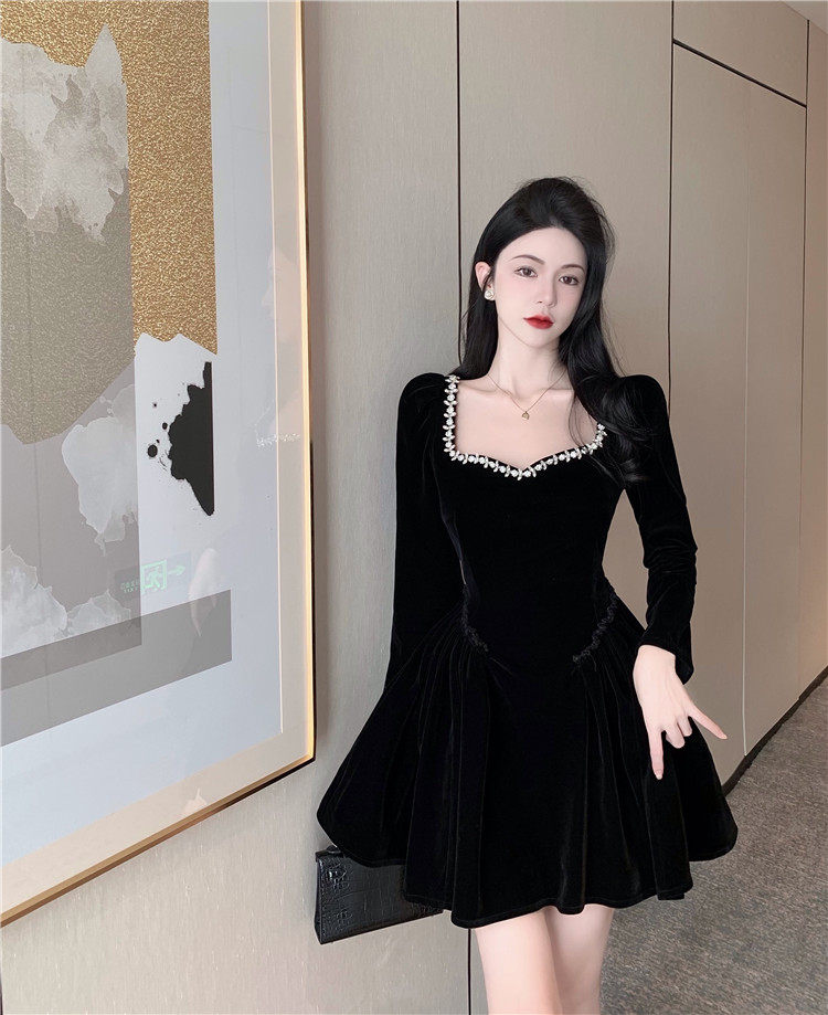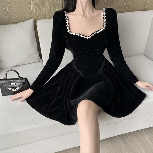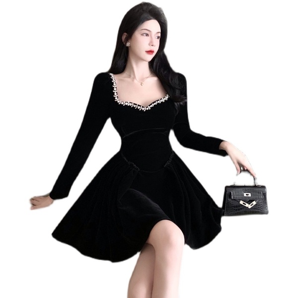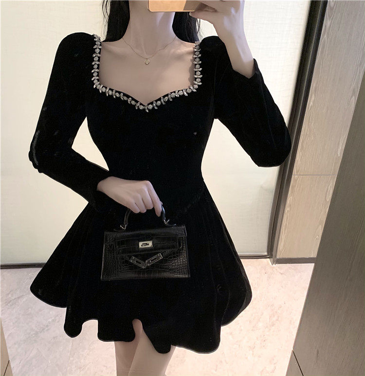 RM24369#新款法式方领赫本风重工钉珠A字蓬蓬裙短款