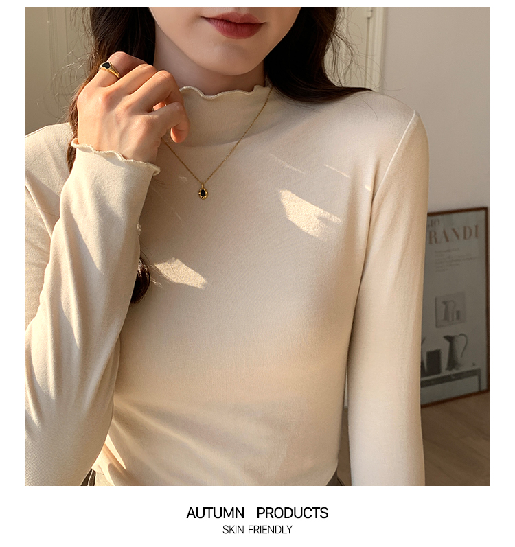 RM24609#木耳边半高领长袖t恤女秋季新款设计感修身内搭打底衫上衣