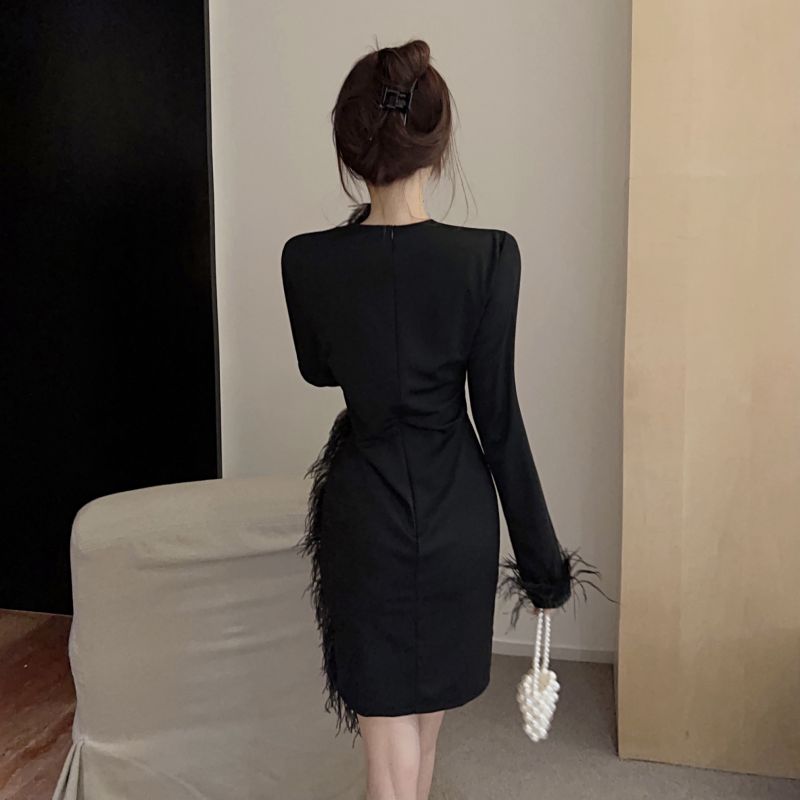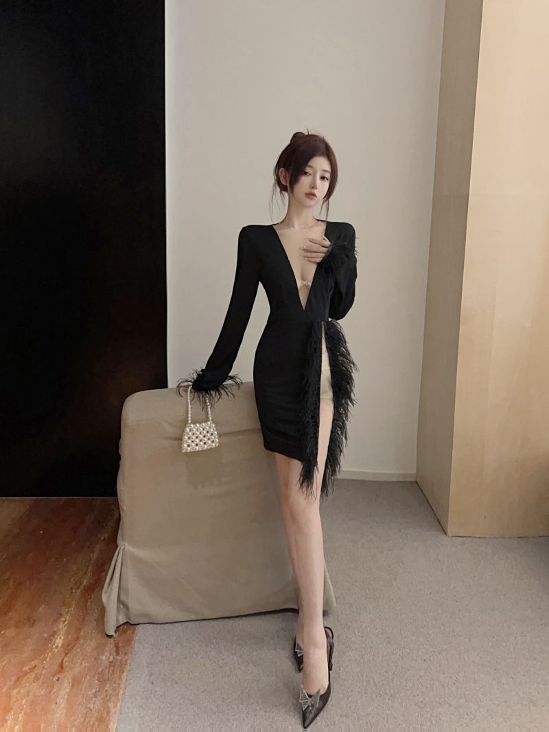RM24798#新款性感深v羽毛装饰透视修身超短连衣裙