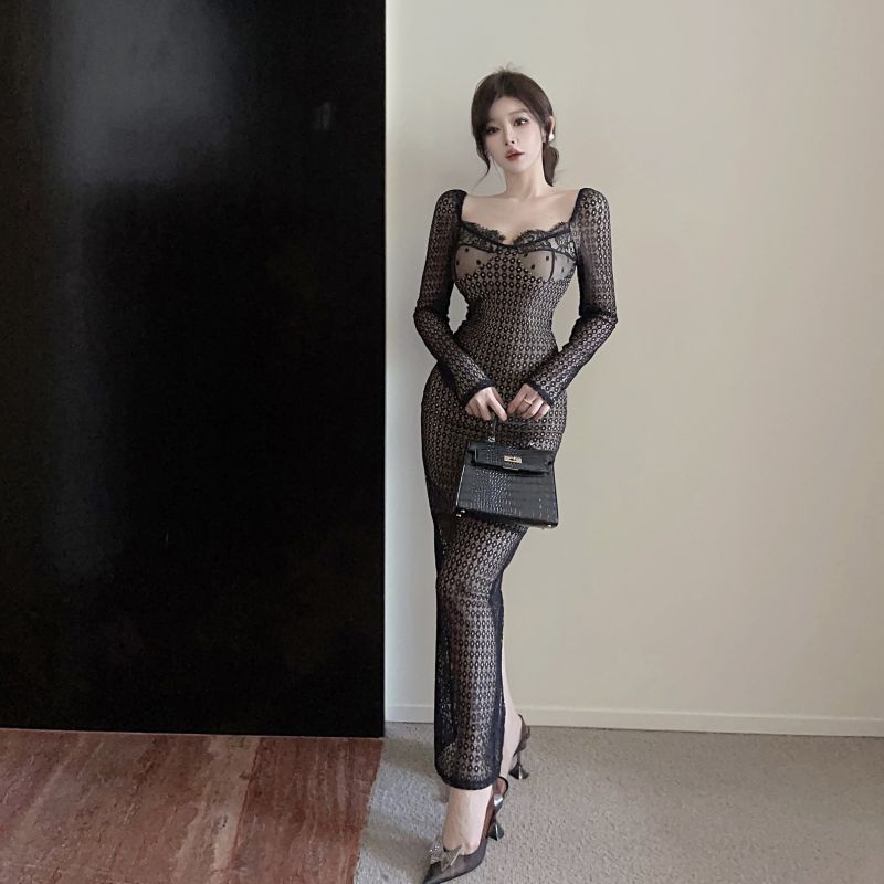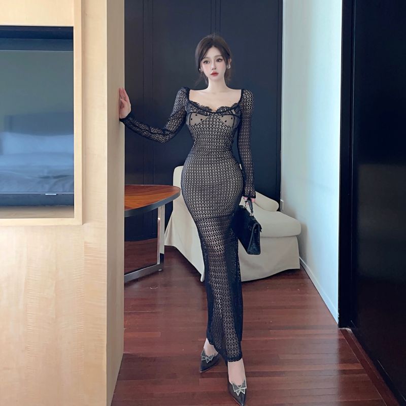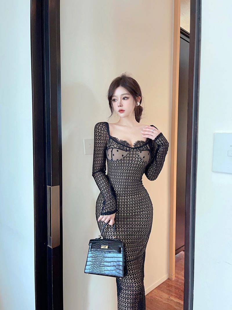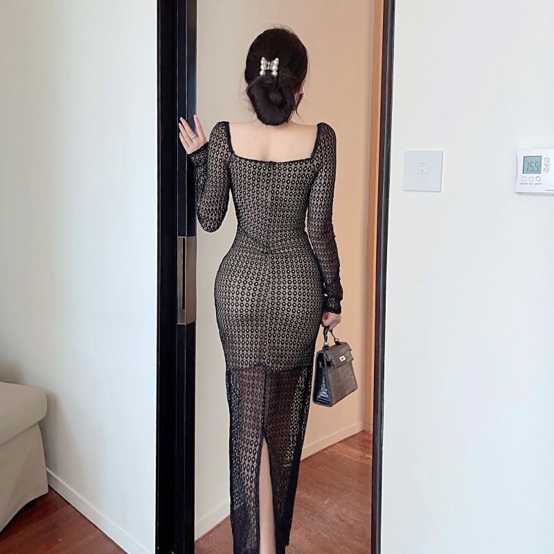 RM24801#新款性感名媛蕾丝轻奢方领法式气质显瘦收腰长袖连衣裙