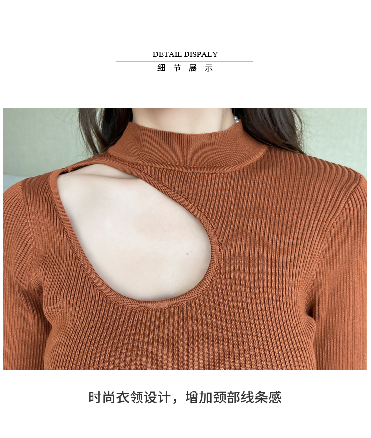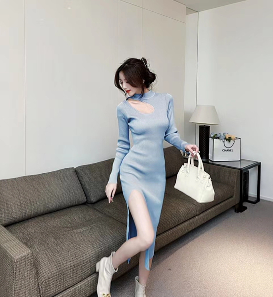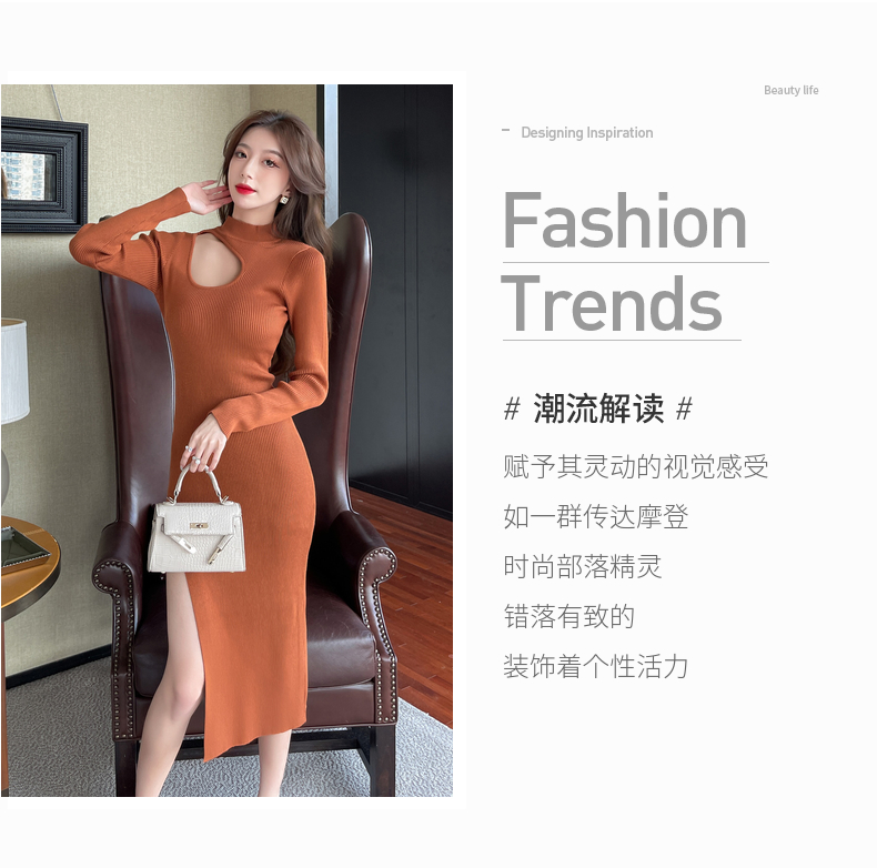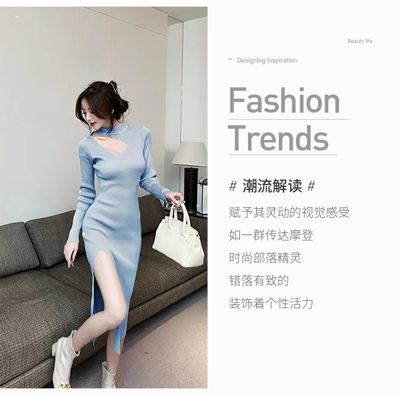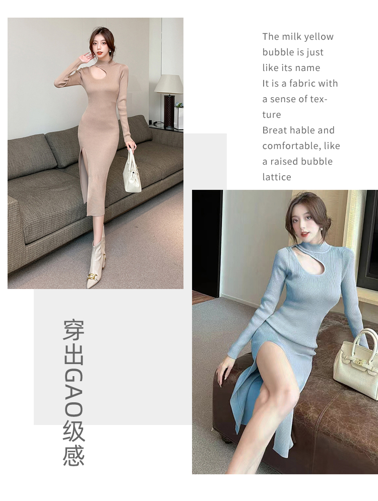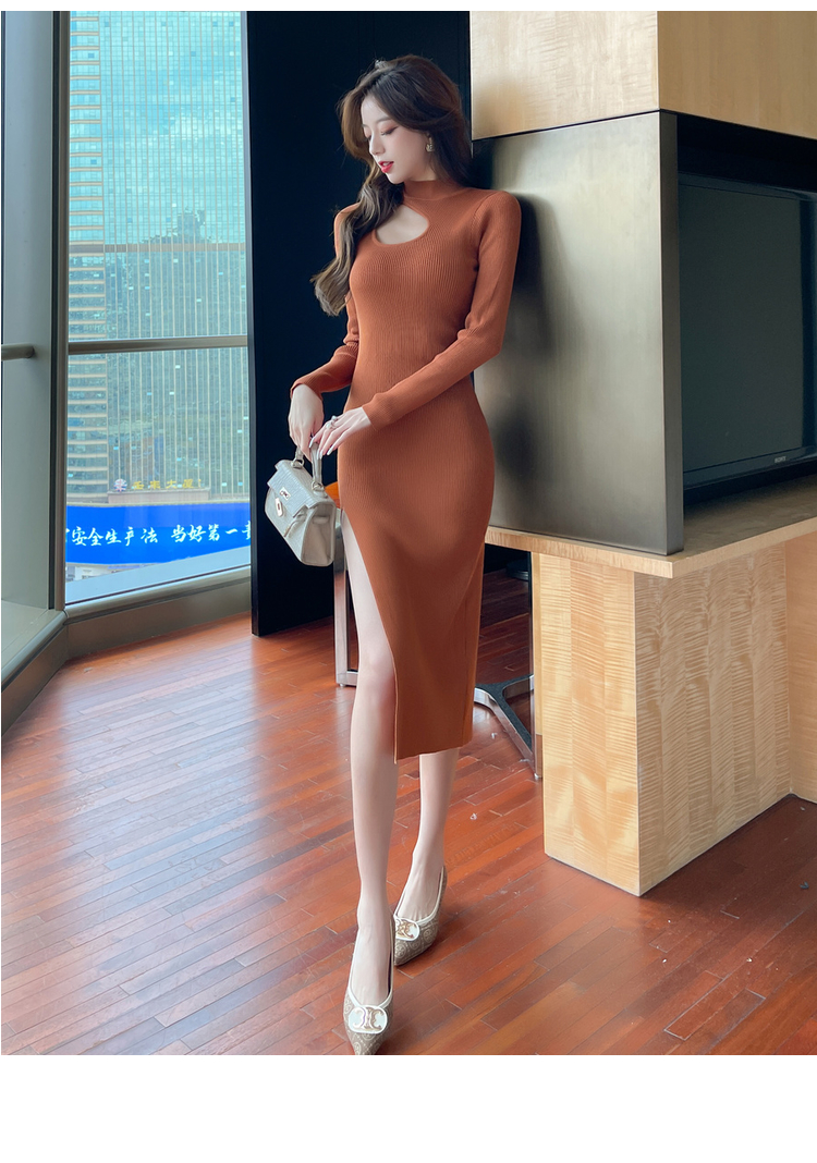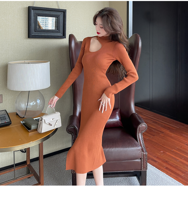 RM24853#韩可欲修身打底裙秋冬长袖针织连衣裙缕空显瘦包臀裙