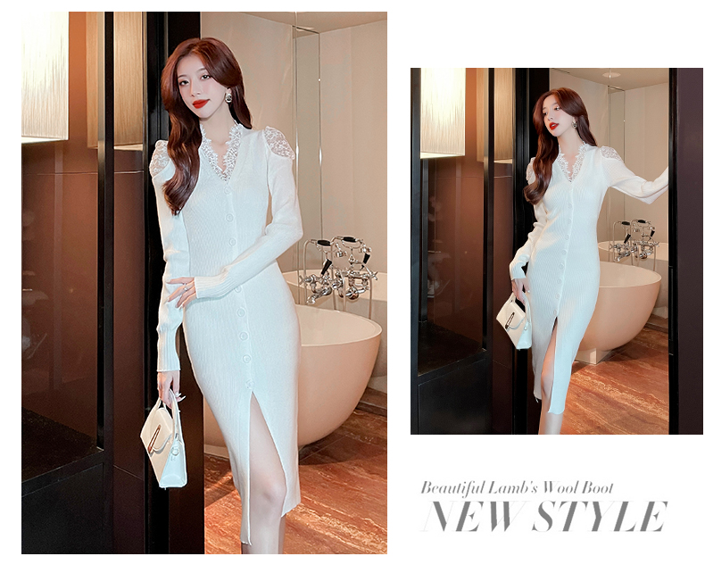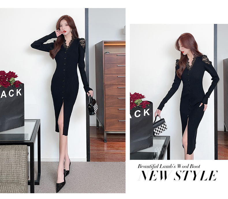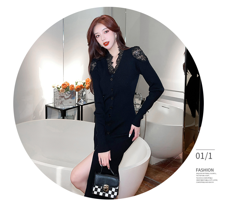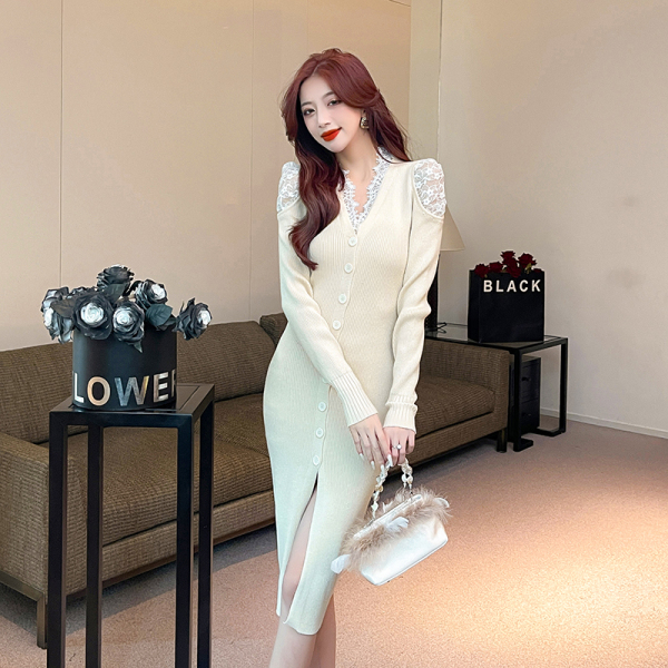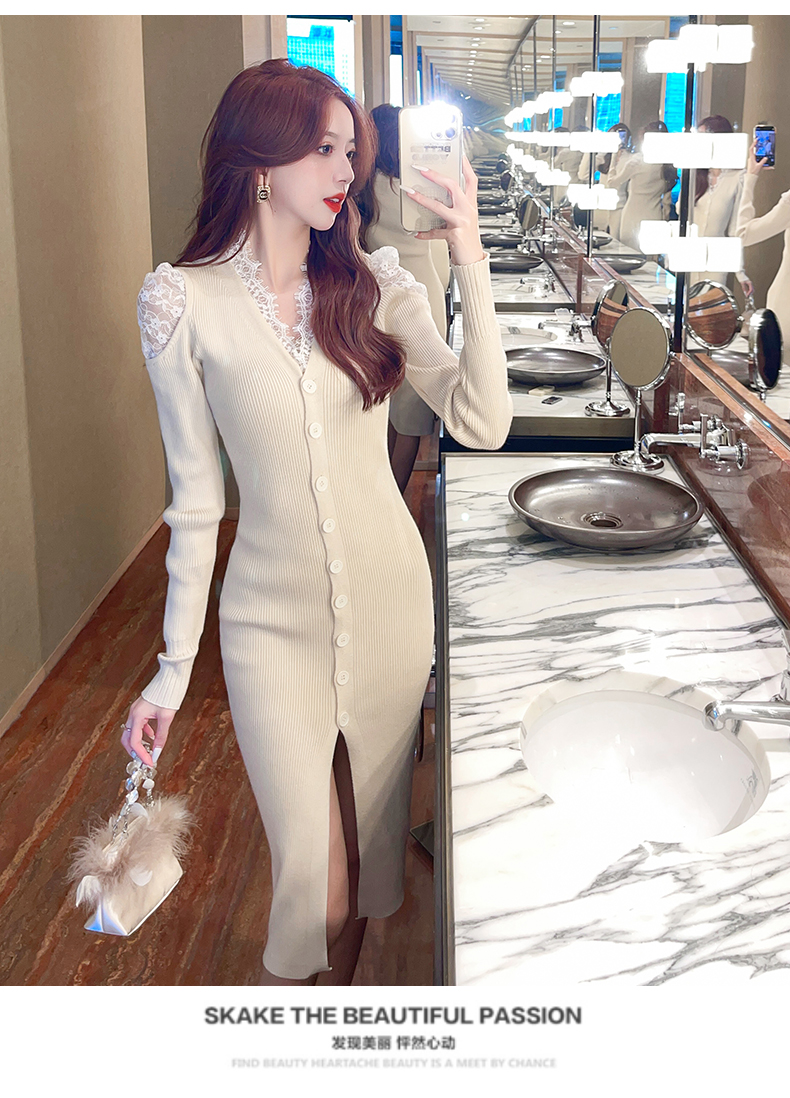 RM24855#法式显瘦针织蕾丝拼接V领长裙气质性感内搭毛衣包臀连衣裙