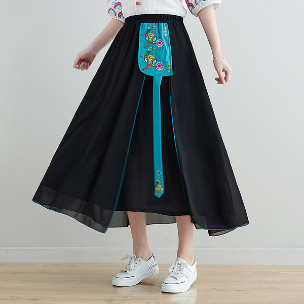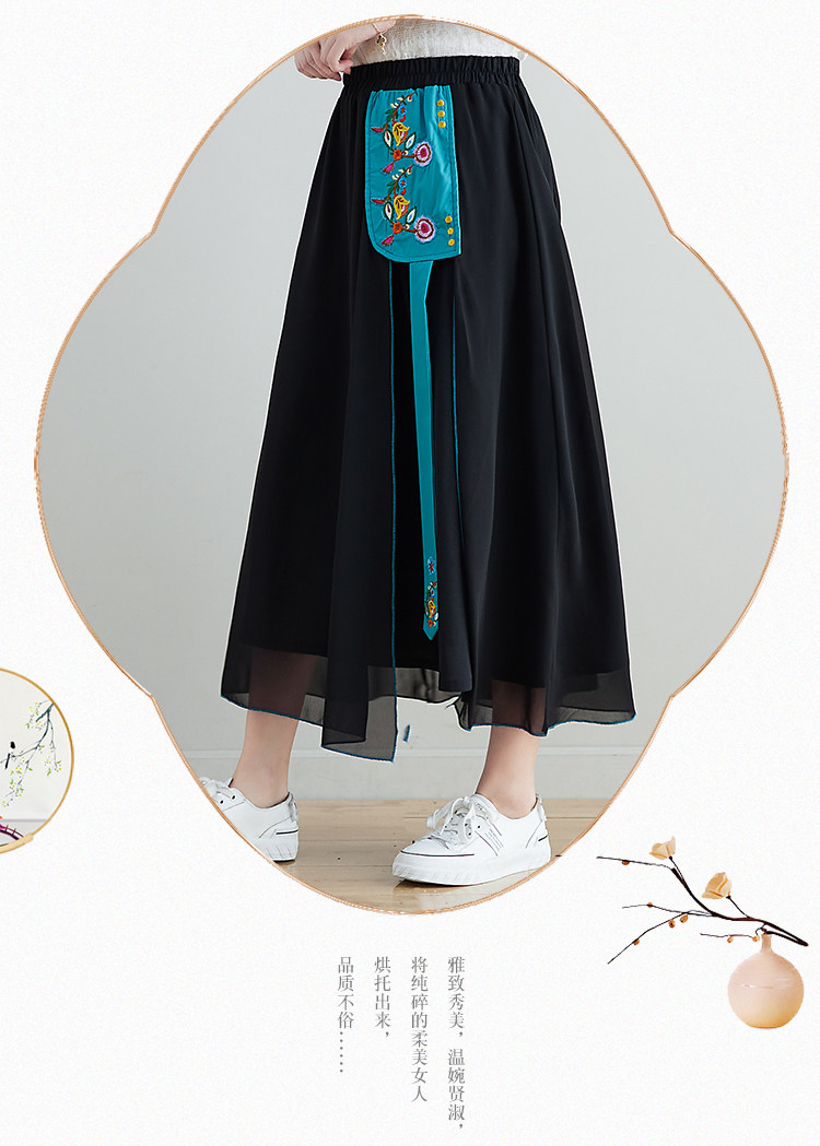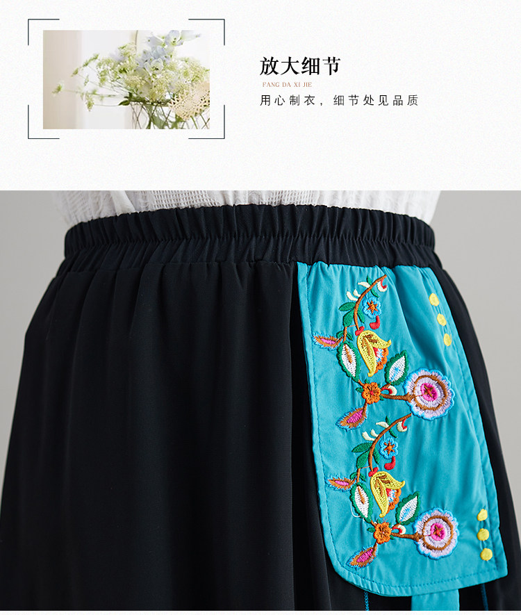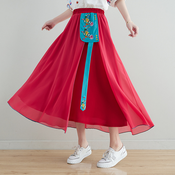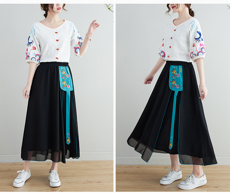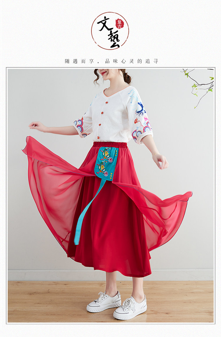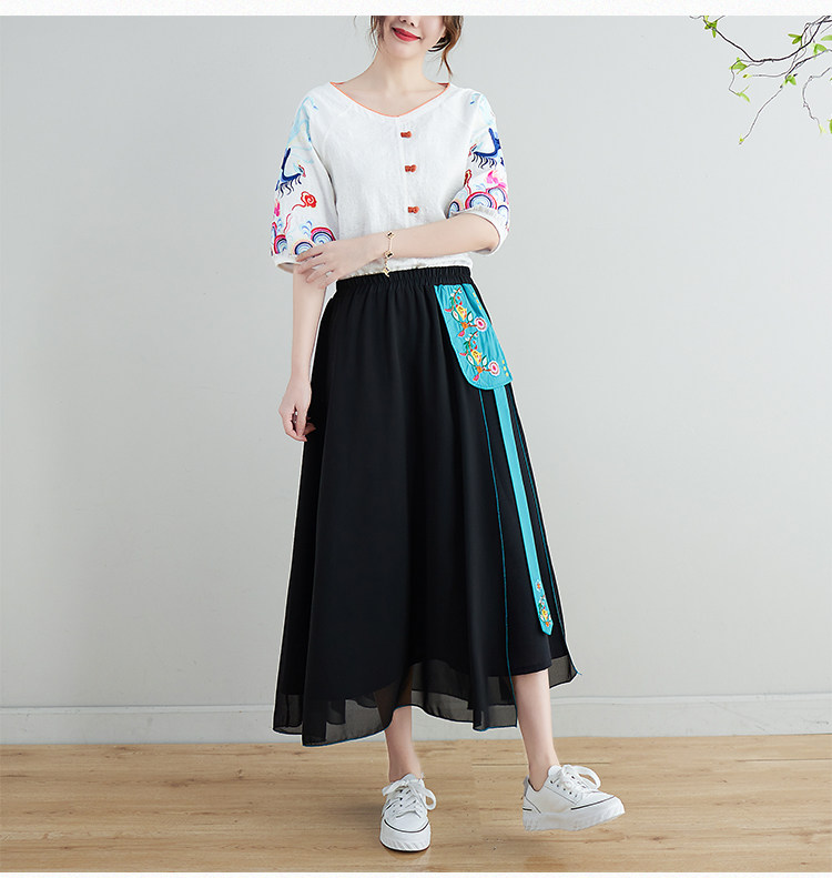 RM24859#春夏民族风女装半身裙文艺复古中国风雪纺绣花大摆中长裙女