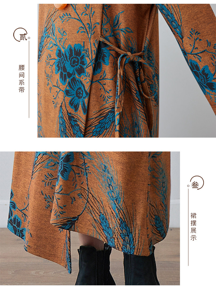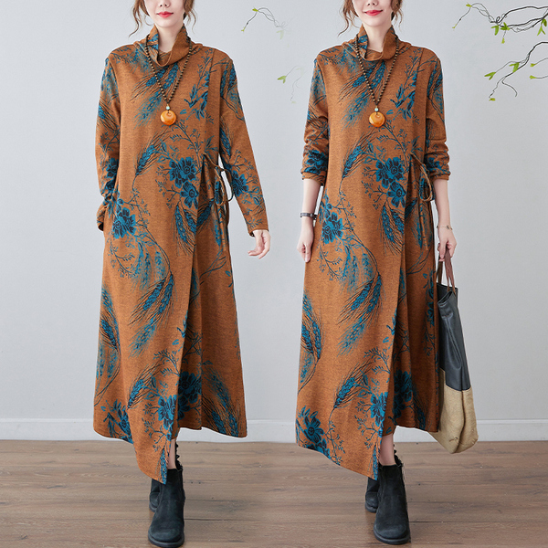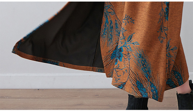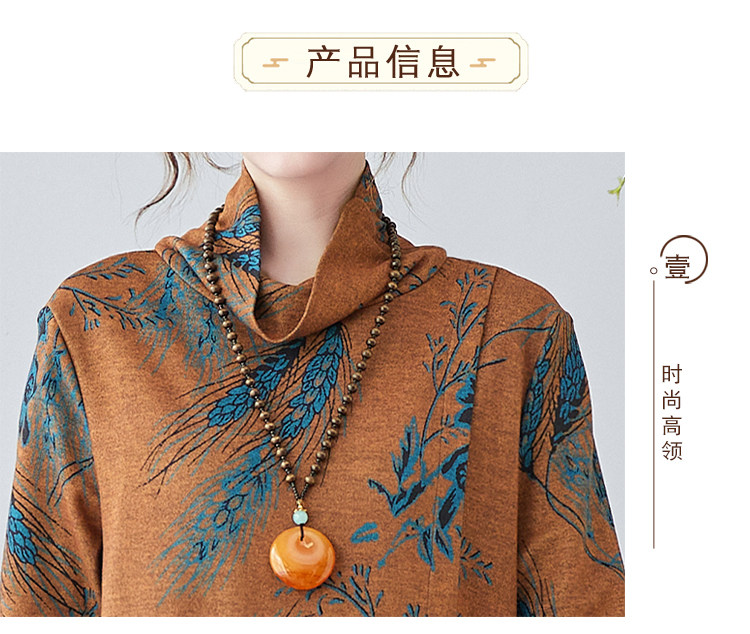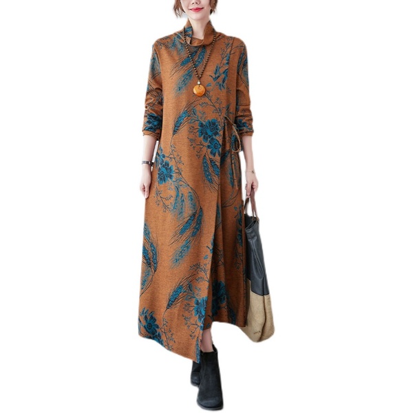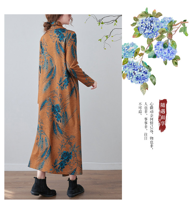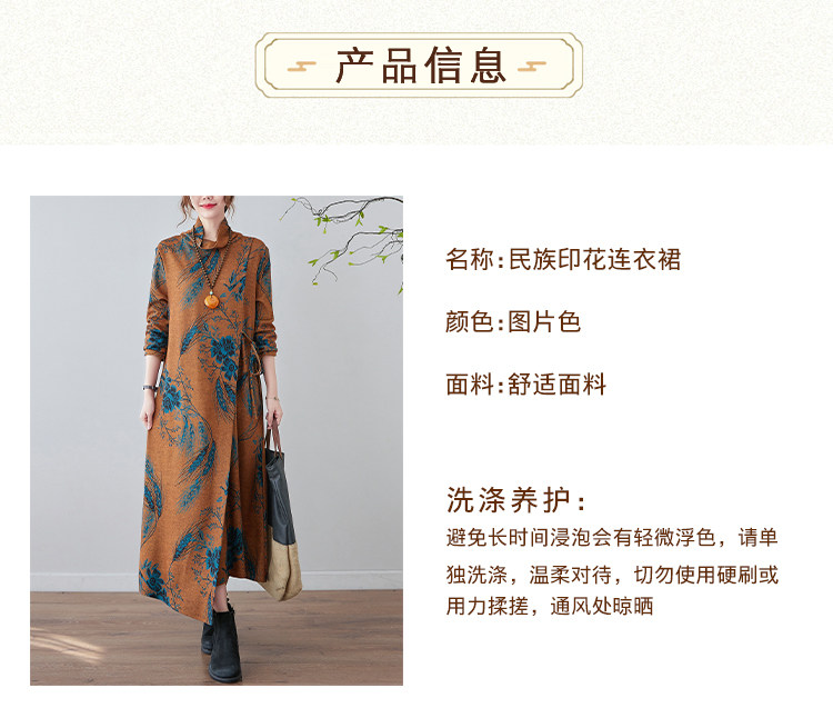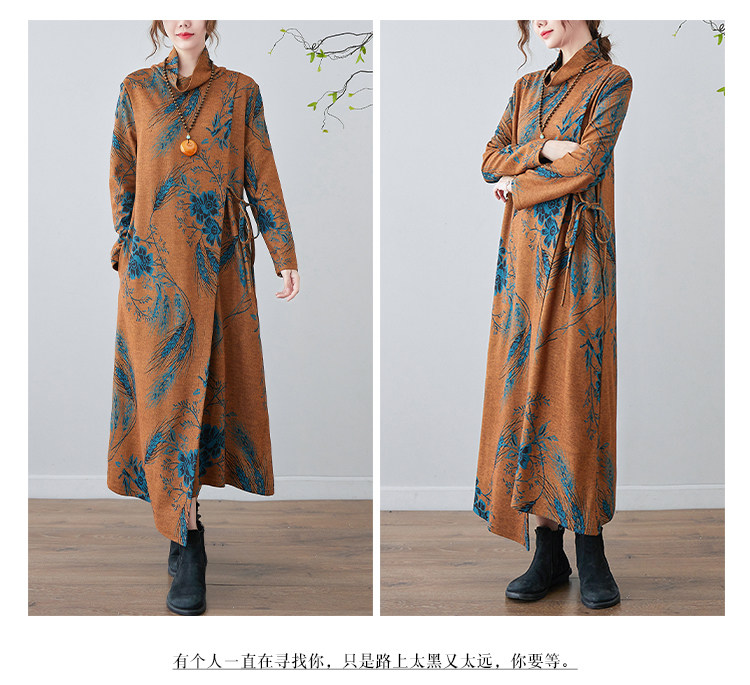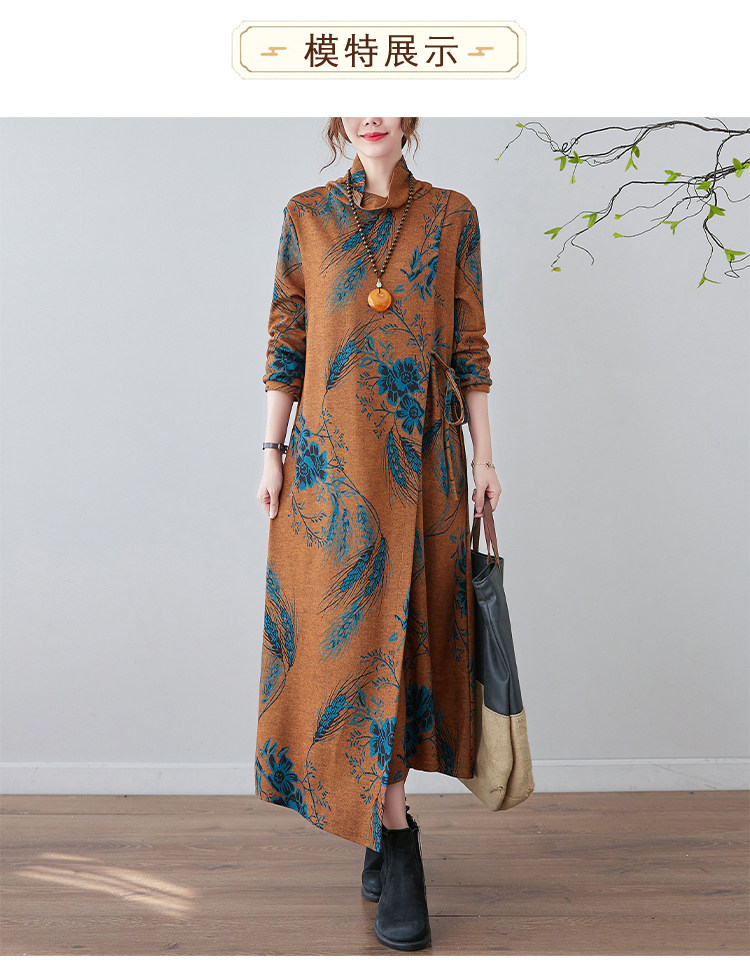 RM24872#新款连衣裙女长款德绒高领气质长袖大码裙民族印花裙子女