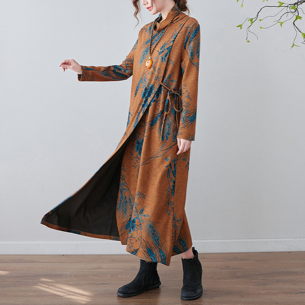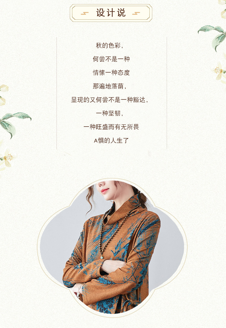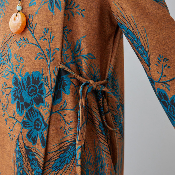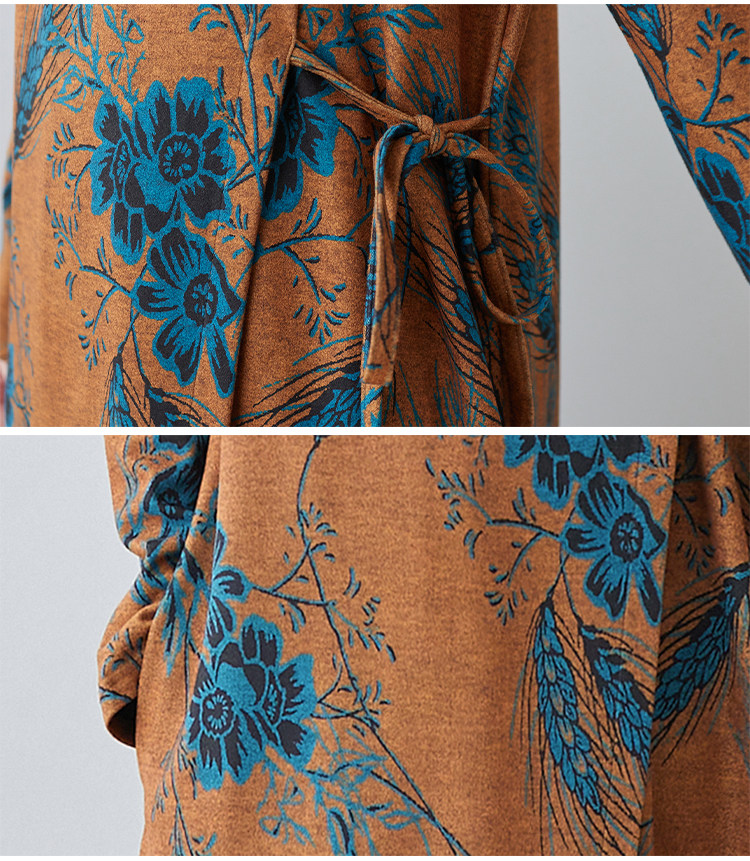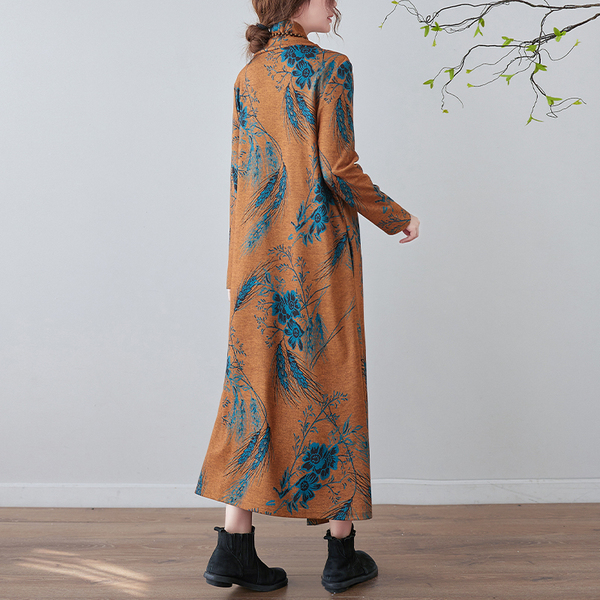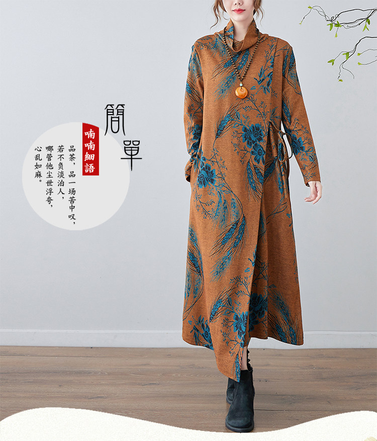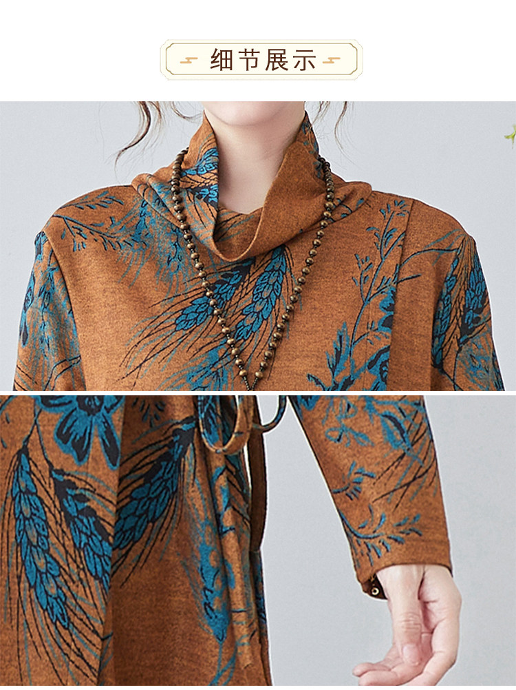 RM24872#新款连衣裙女长款德绒高领气质长袖大码裙民族印花裙子女