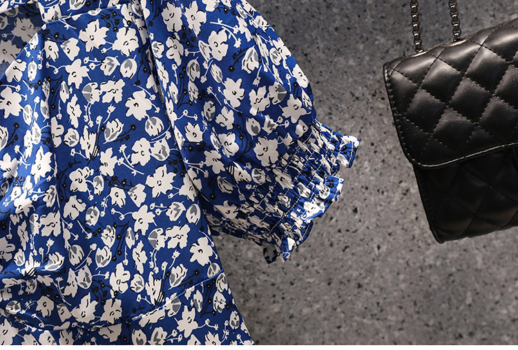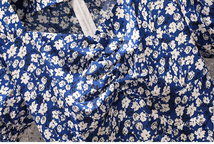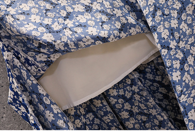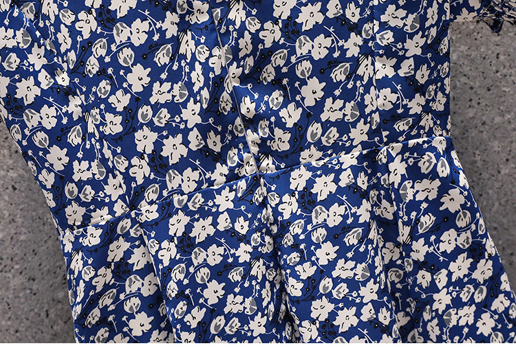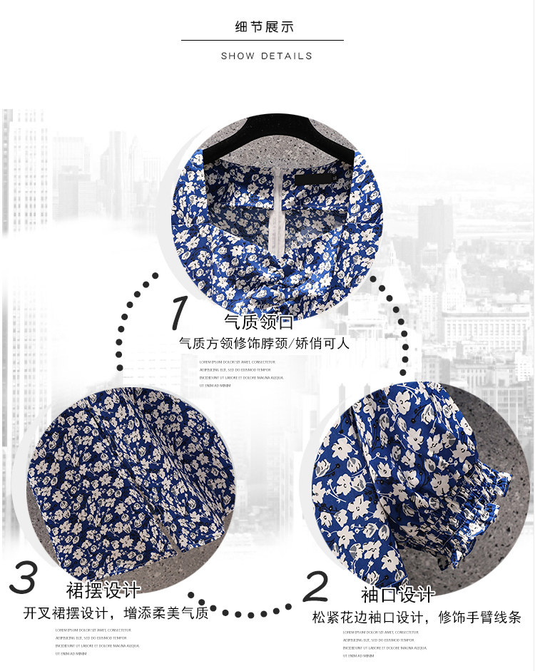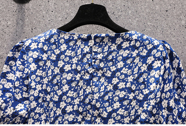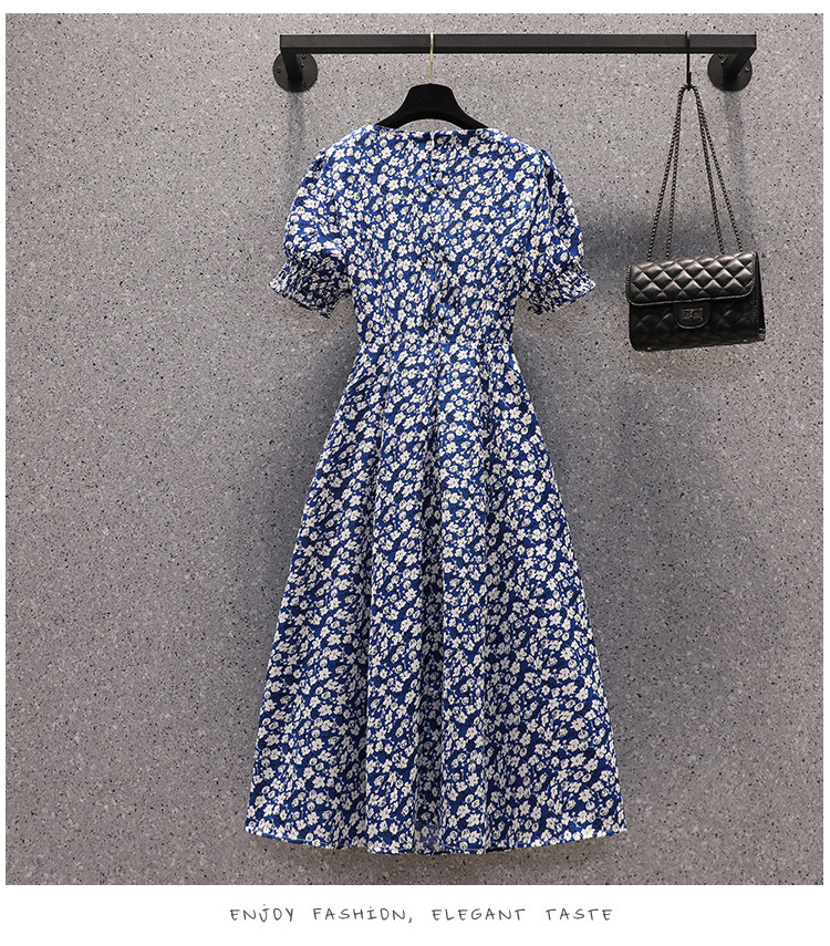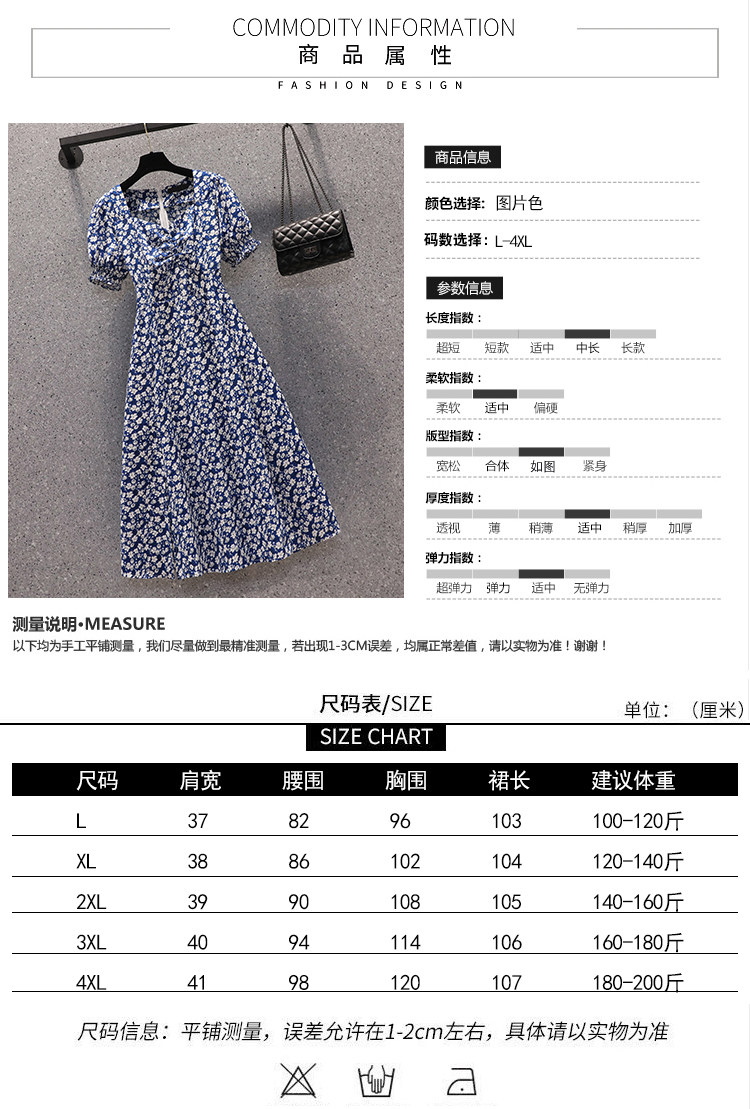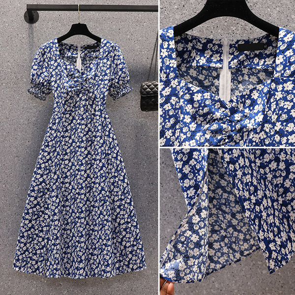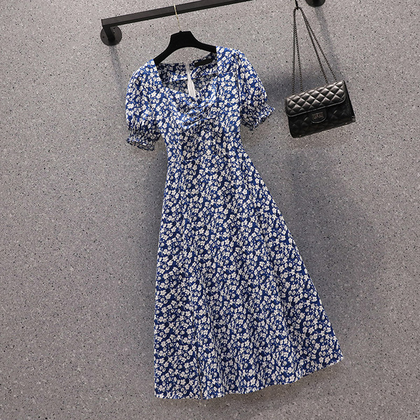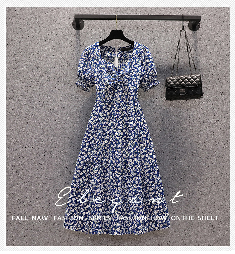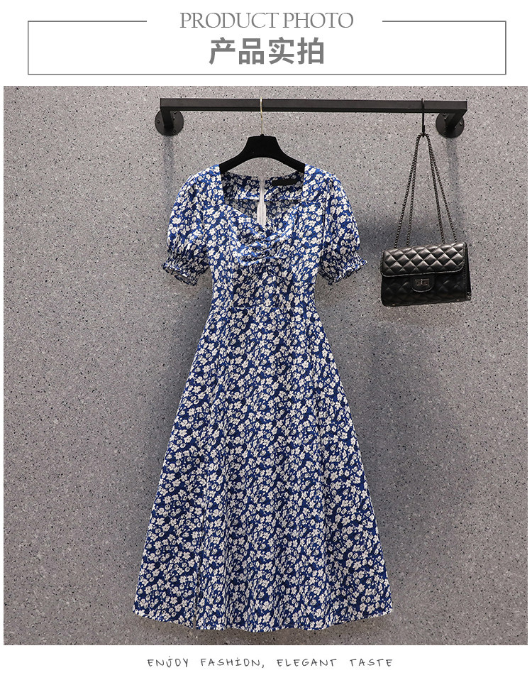 RY1845#大码夏复古法式胖妹妹碎花泡泡袖显瘦裙子方领开叉连衣裙