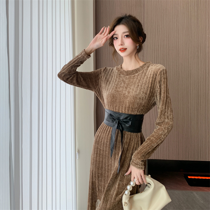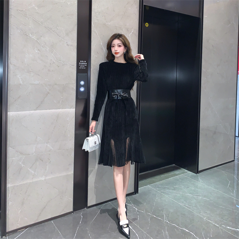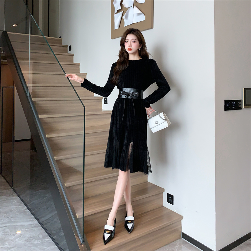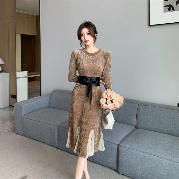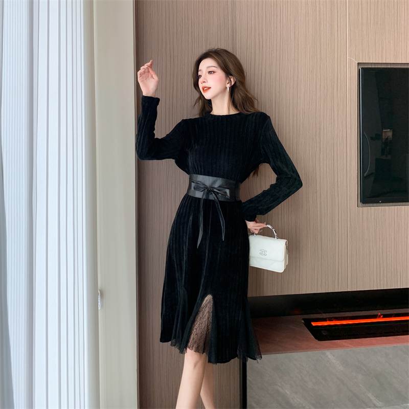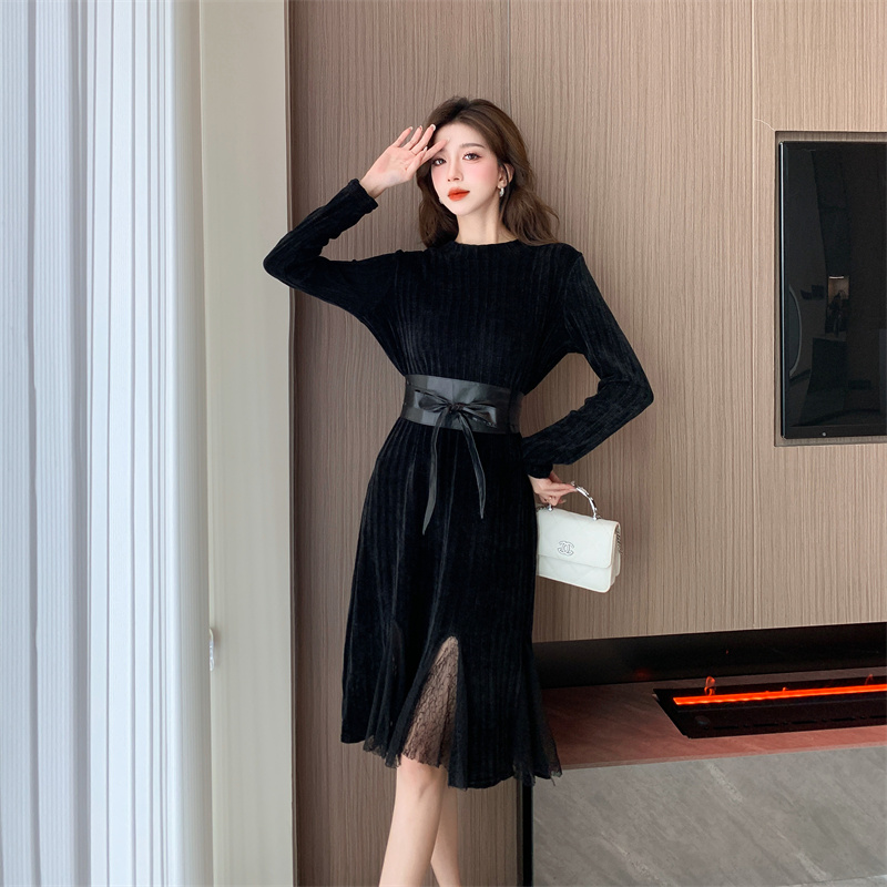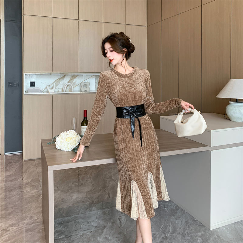 RM24973#名媛时尚半高领收腰蕾丝拼接鱼尾收腰打底连衣裙实价