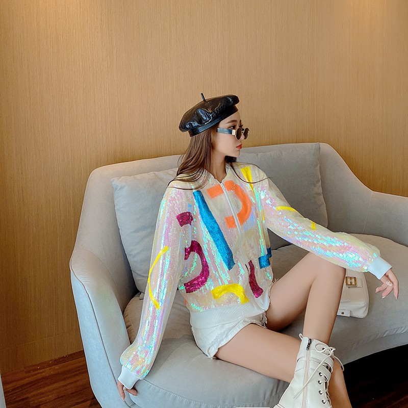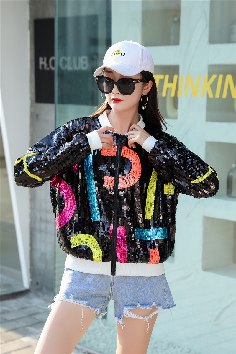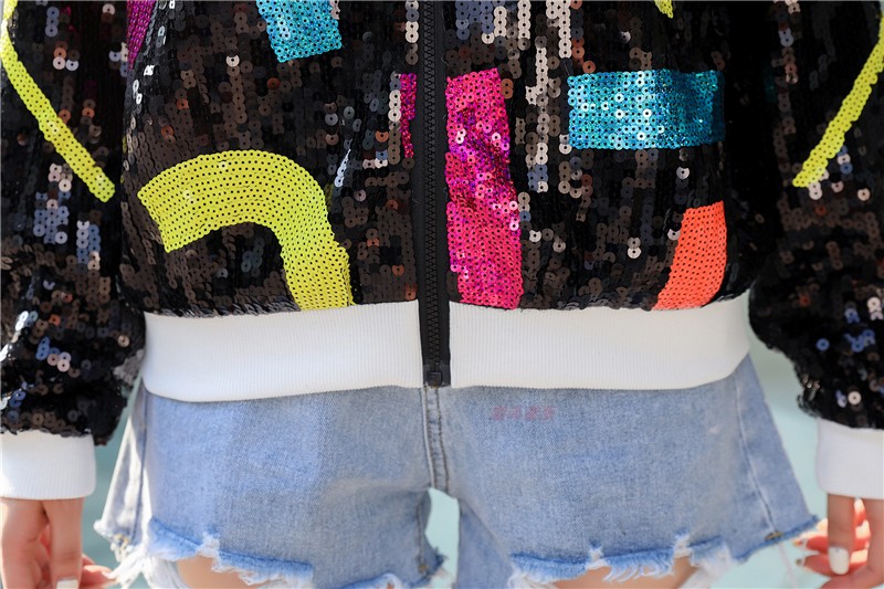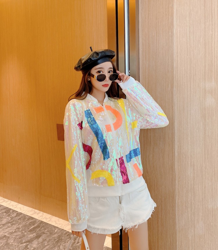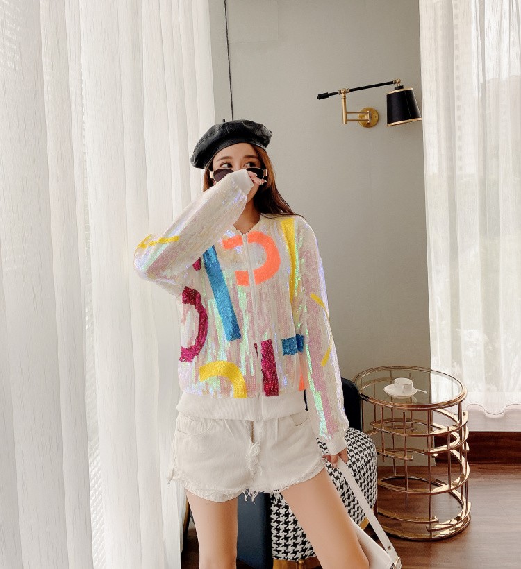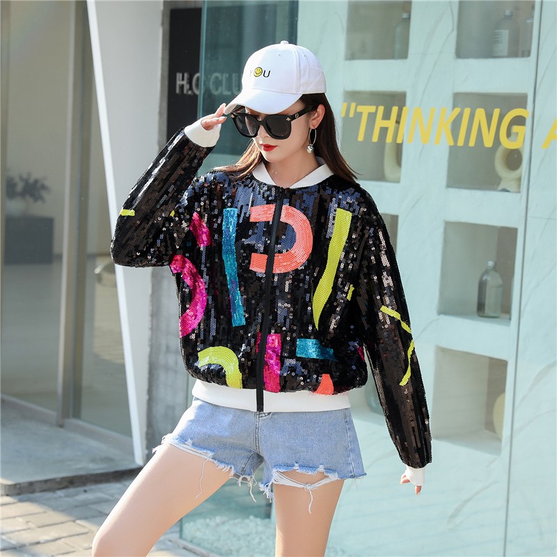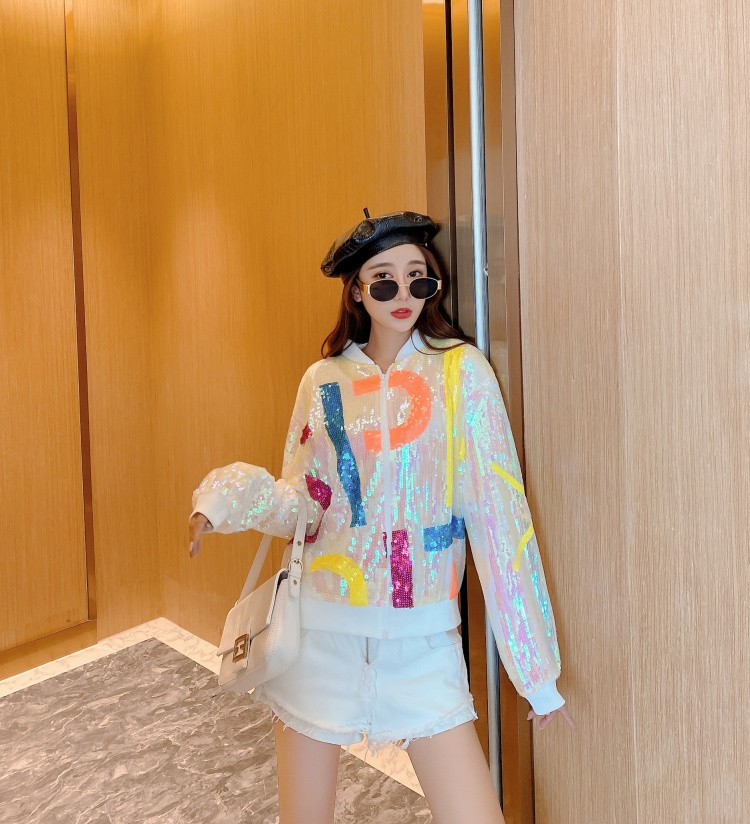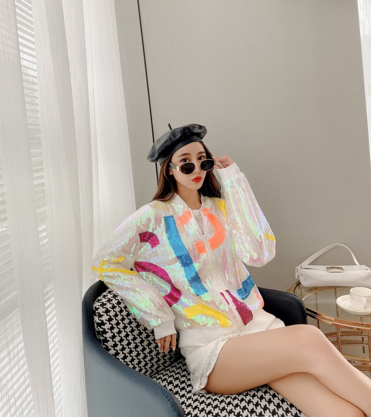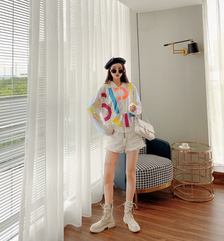 全身利用亮片设计,打造出街头造型,潮流感十足,上身很闲气质的哦