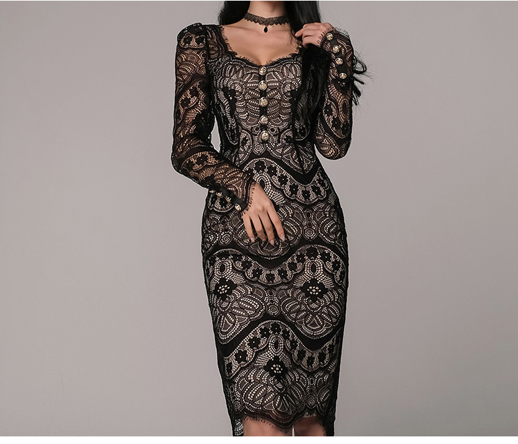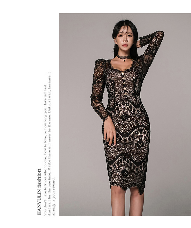 RM25024#韩版新品修身方领收腰蕾丝长袖连衣裙