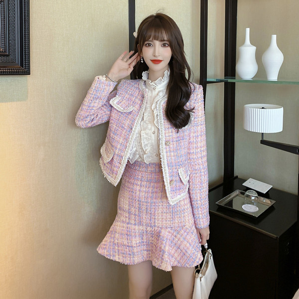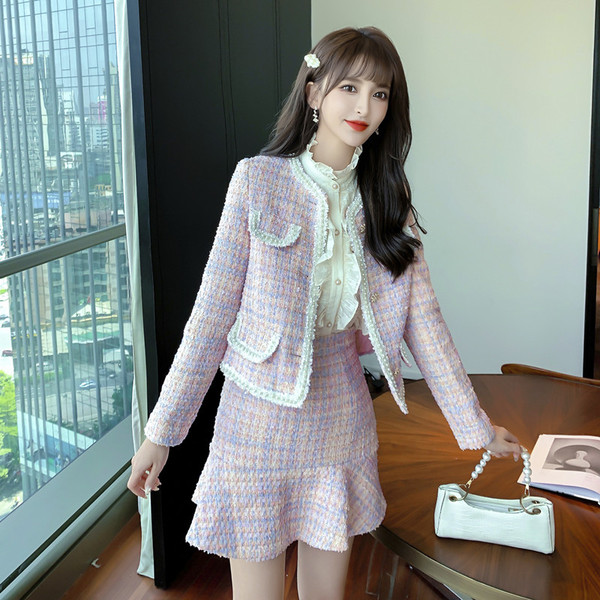 RM25245#温柔甜美粉色小香风套装短款外套减龄半身包臀裙两件套