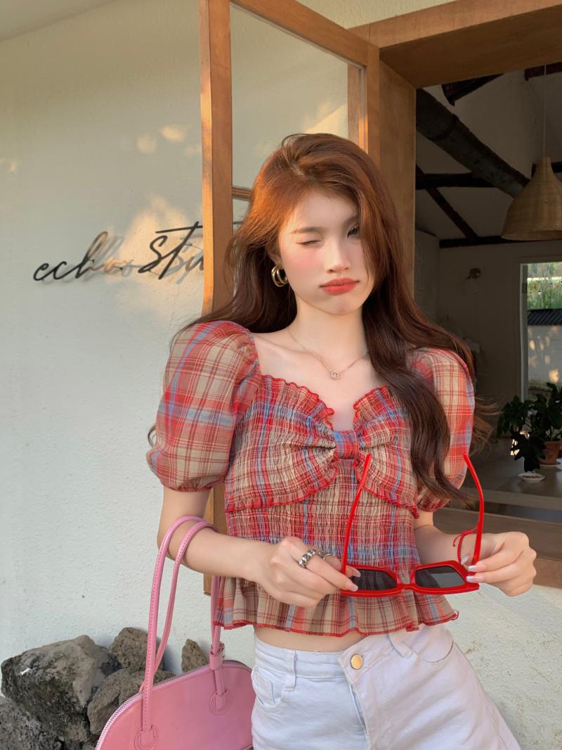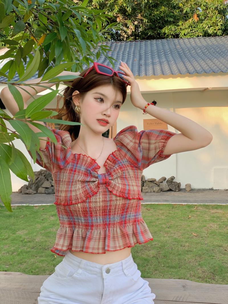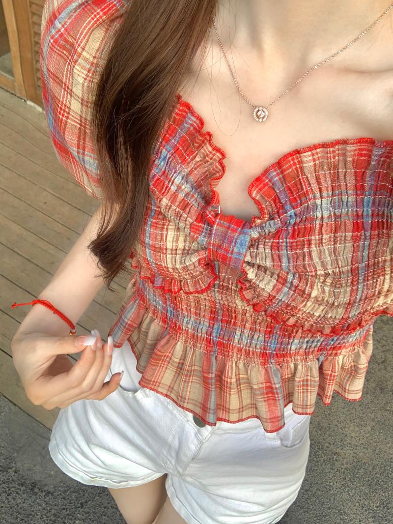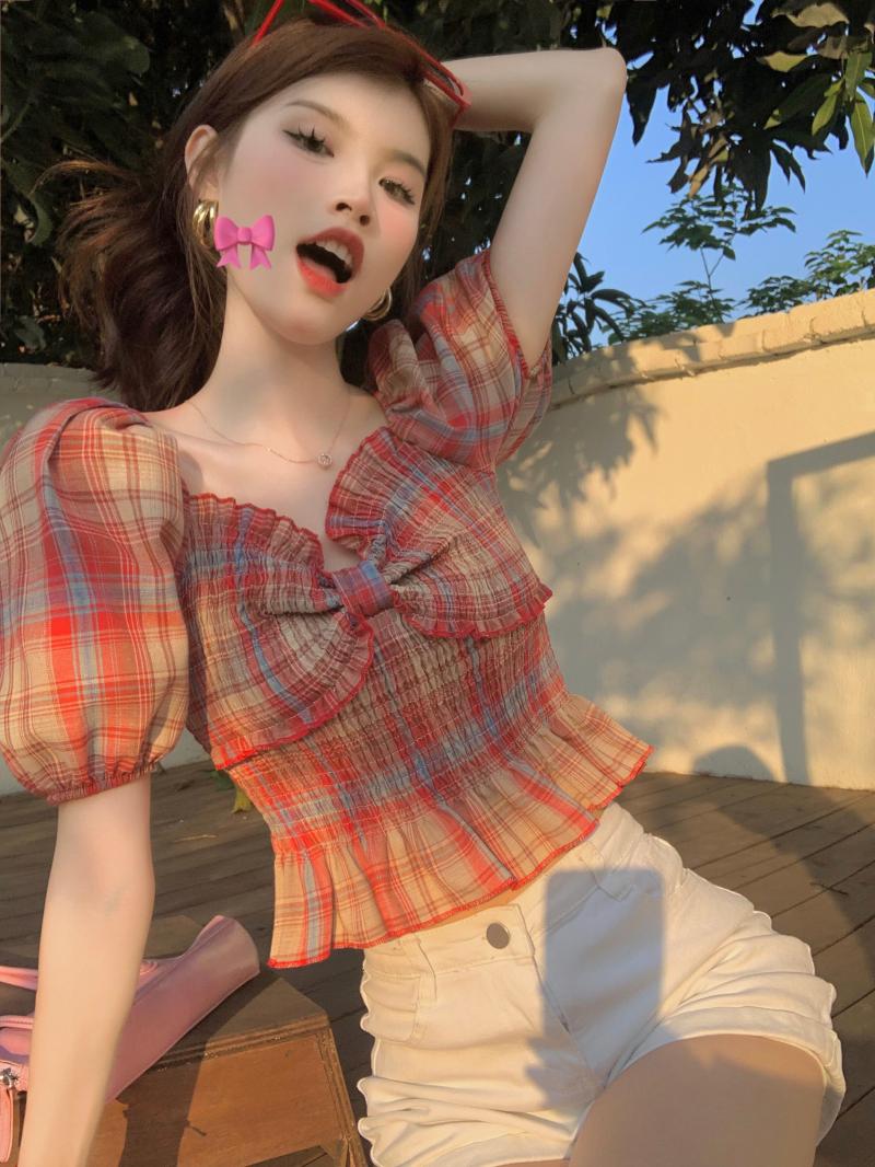 RY1863#洋气格子短款短袖外穿夏季甜辣妹爆款上衣