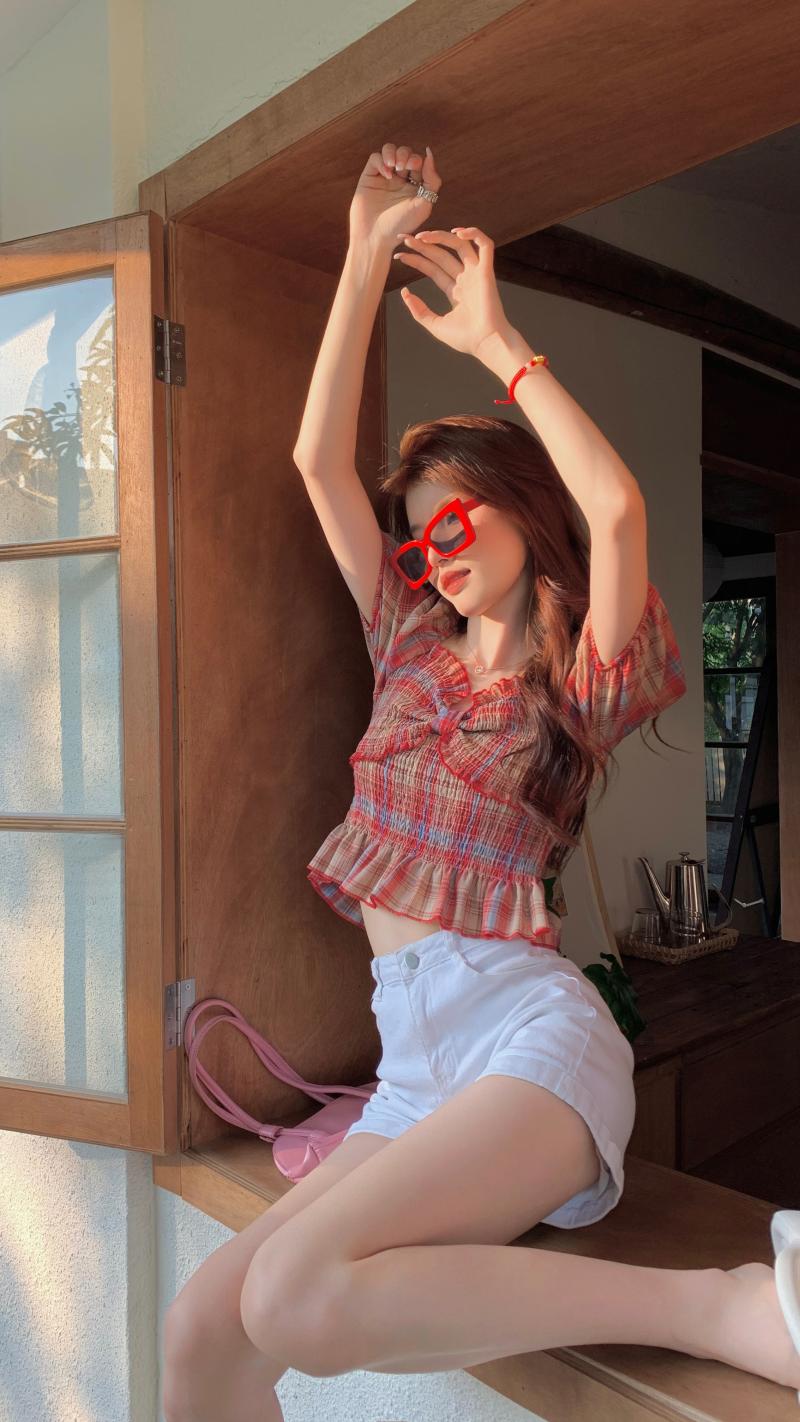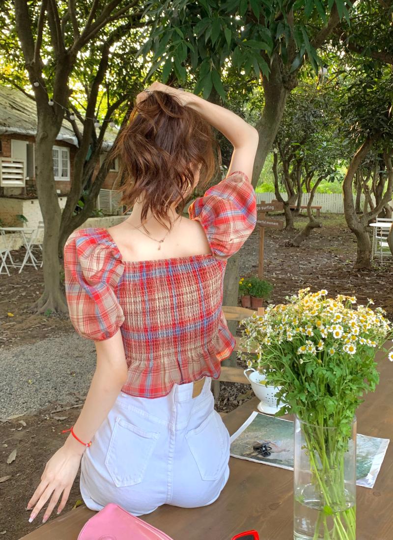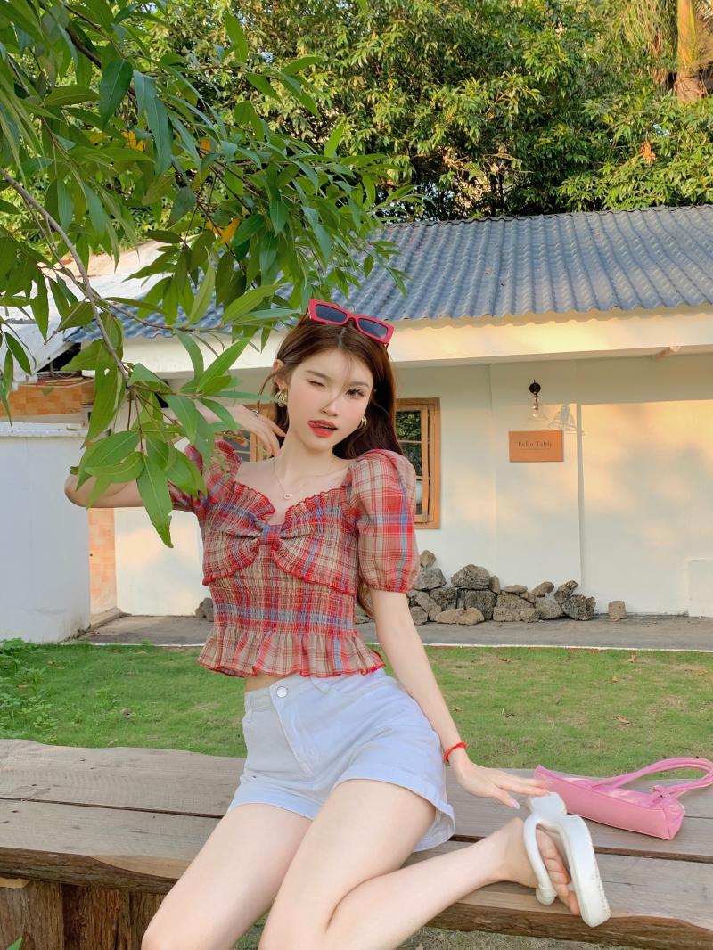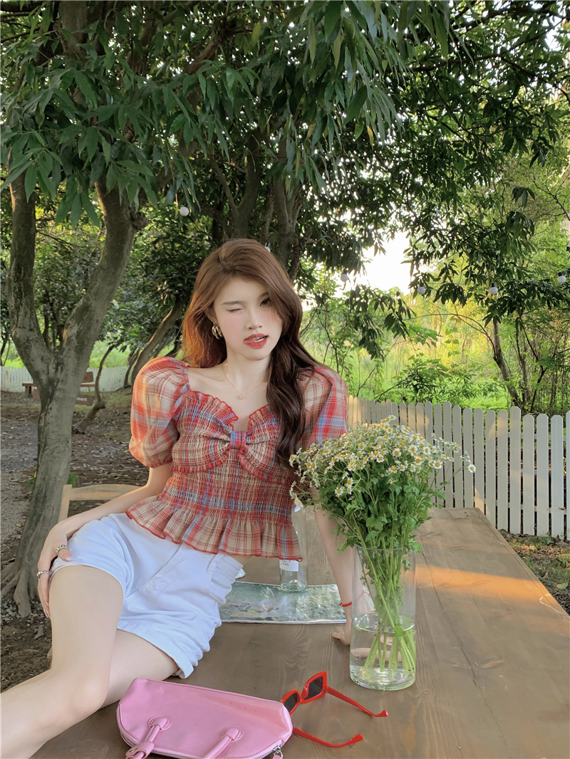 RY1863#洋气格子短款短袖外穿夏季甜辣妹爆款上衣