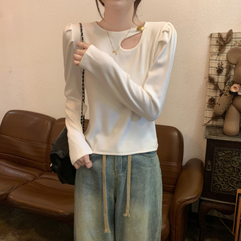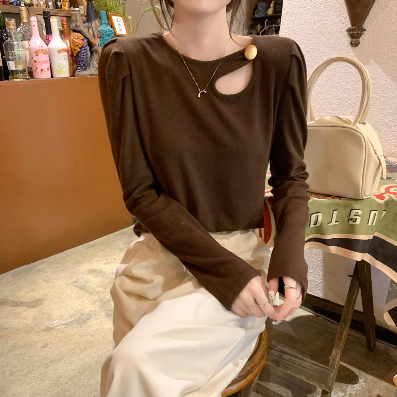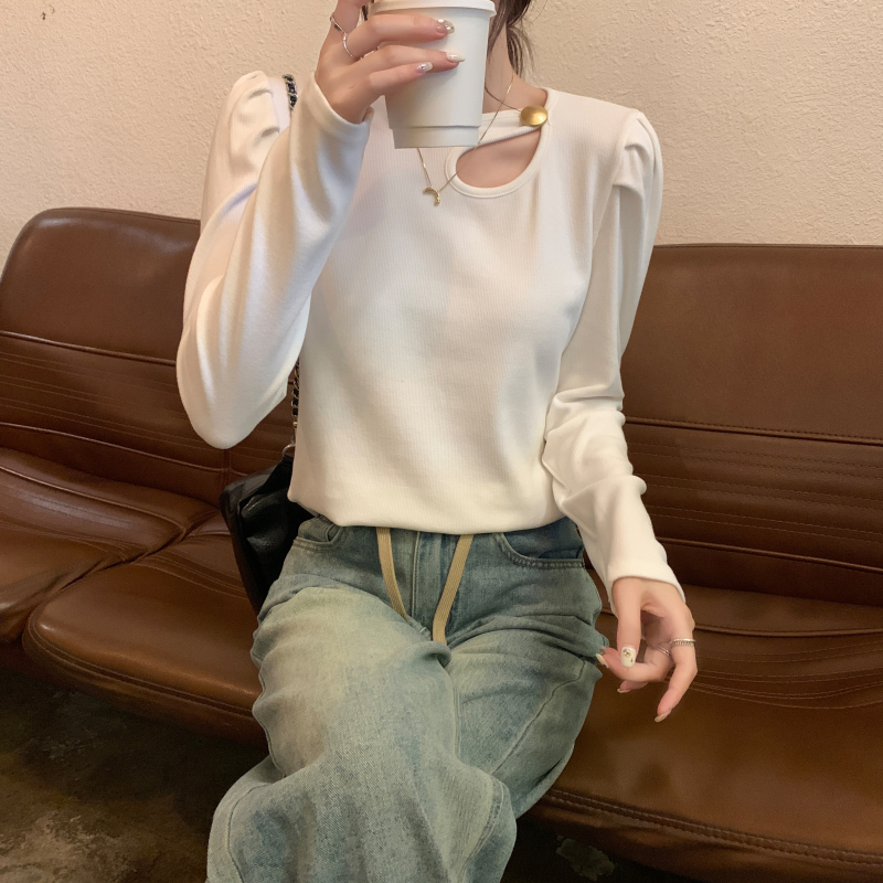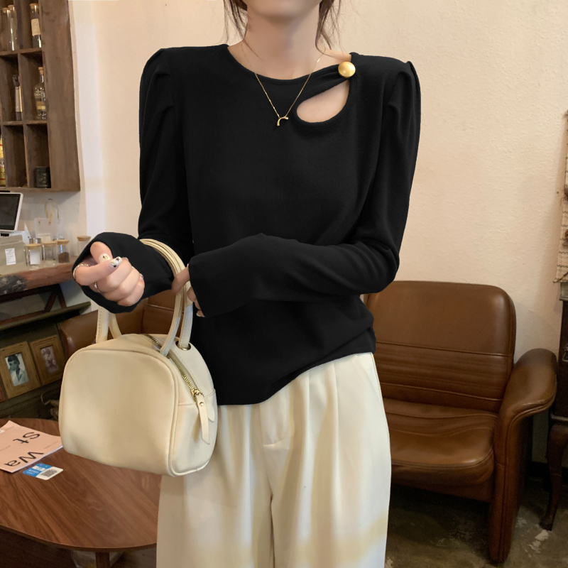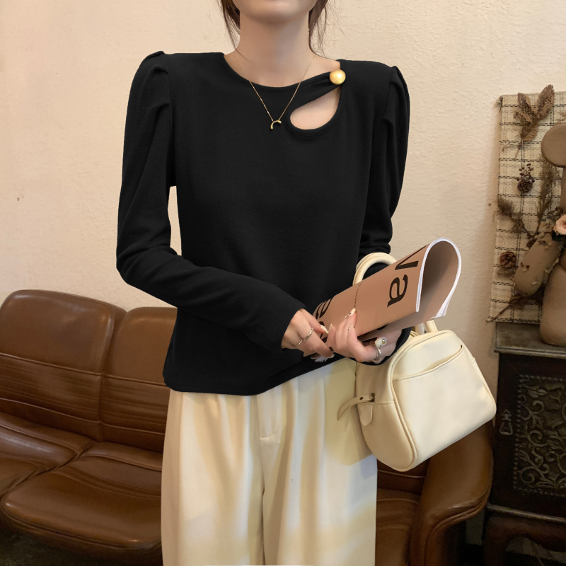 RM25621#欧洲站圆领金属扣镂空洋气泡泡袖加厚长袖T恤女修身上衣